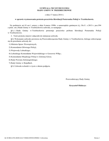 UCHWAŁA NR XXVIII/212/2014 RADY GMINY W TRZEBIECHOWIE z dnia 17 marca 2014 r. w sprawie wystosowania protestu przeciwko likwidacji Posterunku Policji w Trzebiechowie. Na podstawie art.18 ust.1 ustawy z dnia 8 marca 1990r. o samorządzie gminnym (t.j. Dz.U. z 2013 r. poz.594 z póżn. zm.) Rada Gminy w Trzebiechowie uchwala, co następuje: § 1. 1. Rada Gminy w Trzebiechowie. w Trzebiechowie protestuje przeciwko próbom likwidacji Posterunku Policji 2. Treść protestu stanowi załącznik do niniejszej uchwały. § 2. Wykonanie uchwały powierza się Przewodniczącemu Rady Gminy w Trzebiechowie, którego zobowiązuje się do przesłania uchwały do: 1) Ministra Spraw Wewnętrznych; 2) Komendanta Głównego Policji; 3) Wojewody Lubuskiego; 4) Lubuskiego Komendanta Wojewódzkiego w Gorzowie Wlkp.; 5) Komendanta Miejskiego Policji w Zielonej Górze; 6) Rady Powiatu Zielonogórskiego; 7) Rady Gminy w Bojadłach. § 3. Uchwała wchodzi w życie z dniem podjęcia. Przewodniczący Rady Gminy Krzysztof Okińczyc Id: ECBEA1FD-4ED0-42A7-984B-D3FD5229D865. Uchwalony Strona 1 Załącznik Nr 1 do Uchwały Nr XXVIII/212/2014 Rady Gminy w Trzebiechowie z dnia 17 marca 2014 r. Protest Rady Gminy w Trzebiechowie przeciwko likwidacji Posterunku Policji w Trzebiechowie. Rada Gminy w Trzebiechowie po raz kolejny ( ostatnia Uchwała Nr X/71/2011 Rady Gminy w sprawie wyrażenia sprzeciwu wobec zamiaru likwidacji Posterunku Policji w Trzebiechowie została podjęta w dniu 27 października 2011r), stanowczo sprzeciwia się likwidacji Posterunku Policji w Trzebiechowie. Szczególnie niepokojący jest fakt, że ogranicza się społeczeństwu lokalnemu dostępność do policji w sytuacjach zagrożenia, czyli wtedy kiedy występuje zwiększona przestępczość. Wzbudziło to w naszej społeczności ogromne poczucie niesprawiedliwości i stanowczy sprzeciw. Dla nas wszystkich powszechne jest przekonanie, że bezpieczeństwo na terenie Gminy Trzebiechów zapewnia właśnie istnienie Posterunku. Z pewnością likwidacja Posterunku nie wpłynie na poprawę poczucia bezpieczeństwa mieszkańców, a może doprowadzić do zwiększenia liczby patologii i przestępstw, ponieważ brak dyżurów będzie skutkować brakiem zgłoszeń o ewentualnych przestępstwach i co za tym idzie, wzrostem przestępczości. W chwili obecnej mieszkańcy mogą szybko dotrzeć i osobiście porozmawiać z funkcjonariuszem, zgłosić jakiś problem, przestępstwo, co jest ogromnie ważne dla społeczeństwa. W naszej ocenie niedopuszczalne jest, by w gminie w której jest spokojnie i względnie bezpiecznie, przewiduje się likwidację Posterunku. Gmina, która zgodnie z ustawą o samorządzie gminnym jest odpowiedzialna za zapewnienie bezpieczeństwa i porządku publicznego, zostaje pozbawiona takiej możliwości. Od wielu lat Gmina Trzebiechów i Bojadła znacząco dofinansowuje lokalną Policję. Planowana „reorganizacja„ podważa więc celowość naszych działań, a przede wszystkim takie działanie burzy relację między lokalną społecznością a policją, co niewątpliwie będzie miało wpływ na obniżenie poczucia bezpieczeństwa mieszkańców Gminy Trzebiechów i Bojadła, gdyż Posterunek swoim zasięgiem obejmuje dwie Gminy Trzebiechów i Bojadła. Naszym zdaniem niedopuszczalne jest aby Rada Gminy podjęła uchwałę wyrażającą sprzeciw wobec likwidacji Posterunku, Komendant Główny Policji odpowiada, że Posterunek zostaje a po dwóch latach względnego spokoju Komenda Miejska Policji w Zielonej Górze organizuje „debatę” przedstawiając propozycję „reorganizacji” Posterunku de facto „likwidację” tylko w jednej wsi na terenie Gminy Trzebiechów, w której uczestniczy 50 osób w tym są to radni, sołtysi, i pracownicy Urzędu Gminy sprzeciwiający się likwidacji Posterunku. Mając na uwadze realne zagrożenie związane z takim stanem rzeczy, Rada Gminy w Trzebiechowie, w trosce o bezpieczeństwo naszych mieszkańców stanowczo protestuje przeciwko takim posunięciom i wzywa adresatów niniejszej uchwały do podjęcia działań popierających nasze starania o utrzymanie Posterunku Policji w Trzebiechowie. Id: ECBEA1FD-4ED0-42A7-984B-D3FD5229D865. Uchwalony Strona 1 Stanowisko Rady Gminy w Trzebiechowie z dnia 20 września 2011r. w sprawie planów likwidacji Posterunku Policji w Trzebiechowie. Rada Gminy w Trzebiechowie wyraża zaniepokojenie zamiarem likwidacji w Trzebiechowie , obejmującej swym zasięgiem dwie Gminy: Trzebiechów i Bojadła. Posterunku Policji Likwidacja jednostki i przeniesienie czterech funkcjonariuszy do Sulechowa byłoby bardzo niekorzystne dla mieszkańców Gmin Trzebiechów i Bojadła liczących 6630 mieszkańców ( gmina Bojadła 3359 i gmina Trzebiechów 3271), obejmujących 24 wsie. W ocenie Rady taka decyzja nie spowoduje poprawy skuteczności działania policji, wręcz odwrotnie, pozbawi mieszkańców możliwości współpracy z lokalną policją oraz nie da nam poczucia bezpieczeństwa, zagwarantowanego w art. 5 Konstytucji Rzeczypospolitej Polskiej. Obydwie Gminy przez lata dofinansowywały posterunek policji, gmina Trzebiechów użyczyła budynek, za który nie pobiera żadnych opłat , zakupiła samochód. Gmina Bojadła kupuje paliwo, meble, sprzęt biurowy, zakupiła kserokopiarkę. Pragniemy zwrócić uwagę na fakt, iż likwidacja Posterunku spowoduje wzrost zagrożenia mieszkańców gminy wykroczeniami i przestępstwami pospolitymi, które w sposób znaczący utrudniają życie mieszkańcom. Ostatnie wydarzenia na terenie Gmin pozwalają na stwierdzenie, że brak jednostki Policji na tym terenie może spowodować wzrost zagrożenia dla życia i zdrowia mieszkańców. Kolejnym efektem likwidacji Posterunku będzie wzrost wybryków chuligańskich, przypadków nagminnego łamania przepisów „Prawo o ruchu drogowym” oraz faktów dewastacji i niszczenia mienia tak społecznego jak i prywatnego. Istotnym argumentem za pozostawieniem Posterunku w Trzebiechowie jest równie