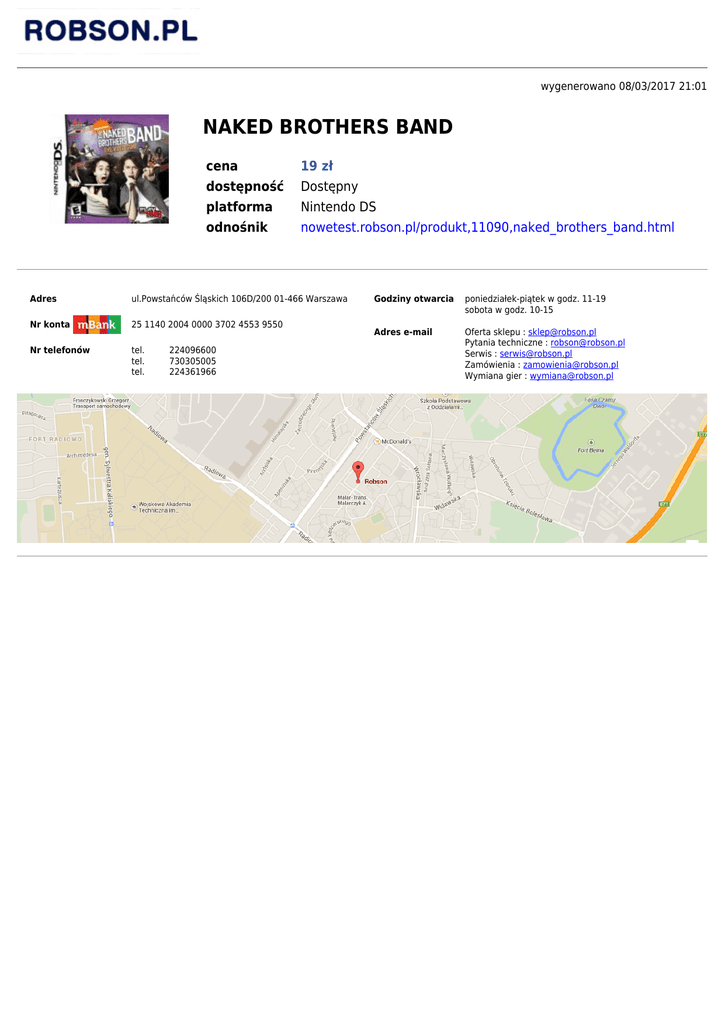 wygenerowano 08/03/2017 21:01 NAKED BROTHERS BAND cena 19 zł dostępność Dostępny platforma Nintendo DS odnośnik nowetest.robson.pl/produkt,11090,naked_brothers_band.html Adres ul.Powstańców Śląskich 106D/200 01-466 Warszawa Nr konta 25 1140 2004 0000 3702 4553 9550 Nr telefonów tel. 224096600 tel. 730305005 tel. 224361966 Godziny otwarcia poniedziałek-piątek w godz. 11-19 sobota w godz. 10-15 Adres e-mail Oferta sklepu : [email protected] Pytania techniczne : [email protected] Serwis : [email protected] Zamówienia : [email protected] Wymiana gier : [email protected]