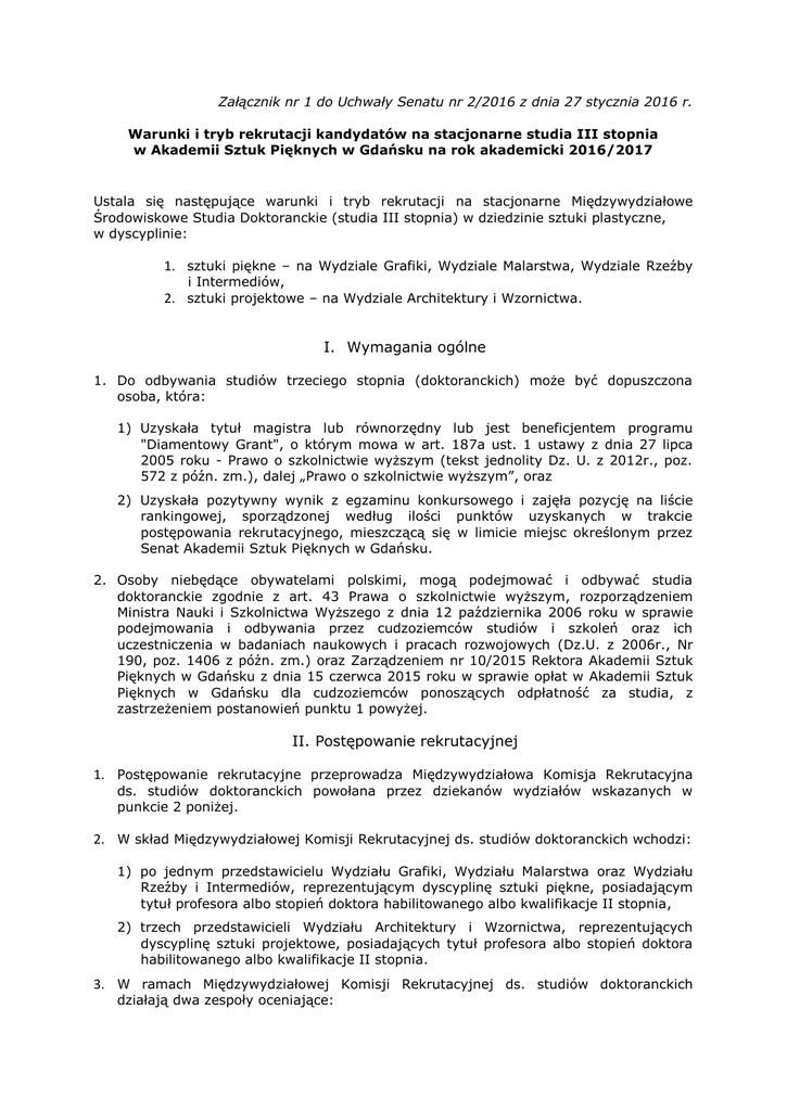 Załącznik nr 1 do Uchwały Senatu nr 2/2016 z dnia 27 stycznia 2016 r. Warunki i tryb rekrutacji kandydatów na stacjonarne studia III stopnia w Akademii Sztuk Pięknych w Gdańsku na rok akademicki 2016/2017 Ustala się następujące warunki i tryb rekrutacji na stacjonarne Międzywydziałowe Środowiskowe Studia Doktoranckie (studia III stopnia) w dziedzinie sztuki plastyczne, w dyscyplinie: 1. sztuki piękne – na Wydziale Grafiki, Wydziale Malarstwa, Wydziale Rzeźby i Intermediów, 2. sztuki projektowe – na Wydziale Architektury i Wzornictwa. I. Wymagania ogólne 1. Do odbywania studiów trzeciego stopnia (doktoranckich) może być dopuszczona osoba, która: 1) Uzyskała tytuł magistra lub równorzędny lub jest beneficjentem programu "Diamentowy Grant", o którym mowa w art. 187a ust. 1 ustawy z dnia 27 lipca 2005 roku - Prawo o szkolnictwie wyższym (tekst jednolity Dz. U. z 2012r., poz. 572 z późn. zm.), dalej „Prawo o szkolnictwie wyższym”, oraz 2) Uzyskała pozytywny wynik z egzaminu konkursowego i zajęła pozycję na liście rankingowej, sporządzonej według ilości punktów uzyskanych w trakcie postępowania rekrutacyjnego, mieszczącą się w limicie miejsc określonym przez Senat Akademii Sztuk Pięknych w Gdańsku. 2. Osoby niebędące obywatelami polskimi, mogą podejmować i odbywać studia doktoranckie zgodnie z art. 43 Prawa o szkolnictwie wyższym, rozporządzeniem Ministra Nauki i Szkolnictwa Wyższego z dnia 12 października 2006 roku w sprawie podejmowania i odbywania przez cudzoziemców studiów i szkoleń oraz ich uczestniczenia w badaniach naukowych i pracach rozwojowych (Dz.U. z 2006r., Nr 190, poz. 1406 z późn. zm.) oraz Zarządzeniem nr 10/2015 Rektora Akademii Sztuk Pięknych w Gdańsku z dnia 15 czerwca 2015 roku w sprawie opłat w Akademii Sztuk Pięknych w Gdańsku dla cudzoziemców ponoszących odpłatność za studia, z zastrzeżeniem postanowień punktu 1 powyżej. II. Postępowanie rekrutacyjnej 1. Postępowanie rekrutacyjne przeprowadza Międzywydziałowa Komisja Rekrutacyjna ds. studiów doktoranckich powołana przez dziekanów wydziałów wskazanych w punkcie 2 poniżej. 2. W skład Międzywydziałowej Komisji Rekrutacyjnej ds. studiów doktoranckich wchodzi: 1) po jednym przedstawicielu Wydziału Grafiki, Wydziału Malarstwa oraz Wydziału Rzeźby i Intermediów, reprezentującym dyscyplinę sztuki piękne, posiadającym tytuł profesora albo stopień doktora habilitowanego albo kwalifikacje II stopnia, 2) trzech przedstawicieli Wydziału Architektury i Wzornictwa, reprezentujących dyscyplinę sztuki projektowe, posiadających tytuł profesora albo stopień doktora habilitowanego albo kwalifikacje II stopnia. 3. W ramach Międzywydziałowej Komisji Rekrutacyjnej ds. studiów doktoranckich działają dwa zespoły oceniające: 1) Zespół oceniający w dyscyplinie sztuki piękne składający się z członków Międzywydziałowej Komisji Rekrutacyjnej ds. studiów doktoranckich wskazanych w punkcie 2 podpunkt 1) powyżej; 2) Zespół oceniający w dyscyplinie sztuki projektowe składający się z członków Międzywydziałowej Komisji Rekrutacyjnej ds. studiów doktoranckich wskazanych w punkcie 2 podpunkt 2) powyżej. 4. Przewodniczącego Międzywydziałowej Komisji Rekrutacyjnej ds. studiów doktoranckich wyznacza Rektor spośród członków Międzywydziałowej Komisji Rekrutacyjnej ds. studiów doktoranckich powołanych zgodnie z punktem 1 powyżej. 5. Przedstawiciele samorządu doktorantów rekrutacyjnym jako obserwatorzy. mogą uczestniczyć w postępowaniu 6. Jednostką odpowiedzialną za obsługę administracyjną prac Międzywydziałowej Komisji Rekrutacyjnej ds. studiów doktoranckich jest Sekcja Organizacji Kształcenia. 7. Funkcji członka Międzywydziałowej Komisji Rekrutacyjnej ds. studiów doktoranckich nie można łączyć z funkcją opiekuna projektu artystyczno-badawczego kandydata ubiegającego się w danym roku o przyjęcie na studia doktoranckie. 8. Postępowanie rekrutacyjne ma charakter konkursowy i jest przeprowadzane z zastosowaniem systemu punktowego. Ocenie podlegają cztery elementy egzaminu konkursowego wymienione poniżej: 1) Opis koncepcji projektu artystyczno–badawczego lub projektowo-badawczego planowanej pracy doktorskiej – od 0 do 12 punktów. 2) Autorska dokumentacja artystyczna lub projektowa – od 0 do 12 punktów. 3) Lista udokumentowanej aktywności artystycznej lub projektowej zawierająca wykaz osiągnięć artystycznych lub projektowych – od 0 do 16 punktów. 4) Rozmowa kwalifikacyjna – od 0 do 20 punktów. 9. Maksymalną ilość punktów, którą można uzyskać w trakcie postępowania rekrutacyjnego wynosi 60 punktów. Wynik pozytywny to minimum 32 punkty, z tym zastrzeżeniem, że wynik pozytywny można uzyskać wyłącznie w przypadku gdy egzamin konkursowy obejmował wszystkie cztery elementy, o których mowa w punkcie 8 powyżej, i kandydat uzyskał co najmniej 1 punkt z każdego elementu egzaminu. 10. Rozmowa kwalifikacyjna dotyczy planowanej przez kandydata pracy doktorskiej, zainteresowań i planów artystyczno – projektowo – badawczych, oraz ma na celu uzyskanie szczegółowych informacji o osiągnięciach artystycznych lub projektowych kandydata. 11. Każdy kandydat dysponować będzie 20 minutowym czasem przeznaczonym na zaprezentowanie koncepcji projektu artystyczno-badawczego lub projektowobadawczego planowanej pracy doktorskiej oraz własnego dorobku artystycznego. 12. Rozmowa kwalifikacyjna odbywa się w terminie wyznaczonym przez Przewodniczącego Międzywydziałowej Komisji Rekrutacyjnej ds. studiów doktoranckich. 13. Międzywydziałowa Komisja Rekrutacyjna ds. studiów doktoranckich sporządza dwie osobne listy rankingowe według ilości zdobytych przez kandydatów punktów. Pierwsza lista rankingowa dotyczy kandydatów na studia doktoranckie w dyscyplinie sztuki piękne, druga dotyczy kandydatów na studia doktoranckie w dyscyplinie sztuki projektowe. 14. S