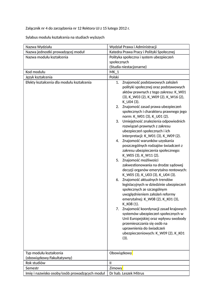 Załącznik nr 4 do zarządzenia nr 12 Rektora UJ z 15 lutego 2012 r. Sylabus modułu kształcenia na studiach wyższych Nazwa Wydziału Nazwa jednostki prowadzącej moduł Nazwa modułu kształcenia Kod modułu Język kształcenia Efekty kształcenia dla modułu kształcenia Typ modułu kształcenia (obowiązkowy/fakultatywny) Rok studiów Semestr Imię i nazwisko osoby/osób prowadzących moduł Wydział Prawa i Administracji Katedra Prawa Pracy i Polityki Społecznej Polityka społeczna i system ubezpieczeń społecznych (Studia niestacjonarne) MK_1 Polski 1. Znajomość podstawowych założeń polityki społecznej oraz podstawowych aktów prawnych z tego zakresu: K_W01 (3), K_W03 (2), K_W09 (2), K_W16 (2), K_U04 (3). 2. Znajomość zasad prawa ubezpieczeń społecznych i charakteru prawnego jego norm: K_W01 (3), K_U01 (2). 3. Umiejętność znalezienia odpowiednich rozwiązań prawnych z zakresu ubezpieczeń społecznych i ich interpretacji: K_W01 (3), K_W09 (2). 4. Znajomość warunków uzyskania poszczególnych rodzajów świadczeń z zakresu ubezpieczenia społecznego: K_W05 (3), K_W11 (2). 5. Znajomość możliwości zakwestionowania na drodze sądowej decyzji organów emerytalno rentowych: K_W05 (3), K_U03 (3), K_U04 (3). 6. Znajomość aktualnych trendów legislacyjnych w dziedzinie ubezpieczeń społecznych ze szczególnym uwzględnieniem założeń reformy emerytalnej: K_W08 (2), K_K01 (3), K_K08 (1). 7. Znajomość koordynacji zasad krajowych systemów ubezpieczeń społecznych w Unii Europejskiej oraz wpływu swobody przemieszczania się osób na uprawnienia do świadczeń ubezpieczeniowych: K_W09 (2), K_K01 (3). Obowiązkowy II Zimowy Dr hab. Leszek Mitrus Imię i nazwisko osoby/osób egzaminującej/egzaminujących bądź udzielającej zaliczenia, w przypadku gdy nie jest to osoba prowadząca dany moduł Sposób realizacji Wymagania wstępne i dodatkowe Rodzaj i liczba godzin zajęć dydaktycznych wymagających bezpośredniego udziału nauczyciela akademickiego i studentów, gdy w danym module przewidziane są takie zajęcia (tzw. godziny kontaktowe) Liczba punktów ECTS przypisana modułowi Bilans punktów ECTS Stosowane metody dydaktyczne Metody sprawdzania i kryteria oceny efektów kształcenia uzyskanych przez studentów Forma i warunki zaliczenia modułu, w tym zasady dopuszczenia do egzaminu, zaliczenia, a także forma i warunki zaliczenia poszczególnych zajęć wchodzących w zakres danego modułu Treści modułu kształcenia Dr hab. Leszek Mitrus Wykład (28 godzin) Brak. Wykład 28 godzin, Egzamin: 3 godziny Konsultacje wykładowcy (dyżur): 26 godzin Łącznie 57 tzw. godzin kontaktowych 9 ECTS 9 pkt ECTS x 25 godzin = 225 godzin, w tym: 57 godzin kontaktowych 168 godzin niekontaktowych (praca własna studenta) Metody tradycyjne (wykład), prezentacja komputerowa (wykład) Egzamin pisemny. Odpowiedź na 10 krótkich pytań oraz 2 pytania opisowe z 3 do wyboru. Czas trwania egzaminu 60 minut. Zapisy na egzaminy za pośrednictwem systemu USOS. Możliwość przystąpienia (bez wstępnych warunków) do egzaminu przedterminowego organizowanego na ostatnim wykładzie. Zapisy na egzaminy na 1 miesiąc przed wyznaczonymi terminami Egzamin, brak warunków wstępnych. Uczestnictwo w wykładach. Przedmiot dotyczy przedstawienia szeroko rozumianego systemu zabezpieczenia społecznego, a także podstawowych założeń polityki społecznej. Obejmuje wskazanie różnych technik zabezpieczenia społecznego, tzn. ubezpieczeń społecznych, zaopatrzenia społecznego i pomocy społecznej. Obejmuje omówienie obowiązujących w polskim ustawodawstwie ryzyk ubezpieczeniowych i związanych z nimi świadczeń. Przedstawia rozwiązania prawne dotyczące organizacji systemu ubezpieczeń społecznych, w tym szczególny system dotyczący rolników. Omawia warunki przyznawania świadczeń z zakresu ubezpieczeń emerytalno – rentowych, z tytułu choroby i macierzyństwa, a także wypadków przy pracy i chorób zawodowych. Uwzględnia założenia wprowadzanej obecnie w życie długofalowej reformy systemu emerytalnego. Wskazuje regulacje dotyczące pomocy społecznej oraz zwalczania bezrobocia. Przybliża możliwości zakwestionowania na drodze sądowej decyzji organów emerytalno – rentowych. Przedstawia konwencje prawa międzynarodowego dotyczące omawianej problematyki oraz podstawowe założenia koordynacji krajowych systemów ubezpieczeń społecznych w Unii Europejskiej. Wykaz literatury podstawowej i uzupełniającej, obowiązującej do zaliczenia danego modułu Literatura podstawowa: G. Szpor (red.) System ubezpieczeń społecznych. Zagadnienia podstawowe, Wyd. 6., LexisNexis 2011. Literatura uzupełniająca: J. Auleytner, Polityka społeczna czyli ujarzmianie chaosu socjalnego, Warszawa 2003. - I. Jędrasik – Jankowska, Pojęcia i konstrukcje prawne ubezpieczenia społecznego, Wyd. LexisNexis, wyd. 3, Warszawa 2010. - J. Jończyk, Prawo zabezpieczenia społecznego, wyd. III uaktualnione, Wyd. „Zakamycze” Kraków 2006. Wymiar, zasady i forma odbywania praktyk, w przypadku, gdy program kształcenia przewiduje praktyki Nie dotyczy