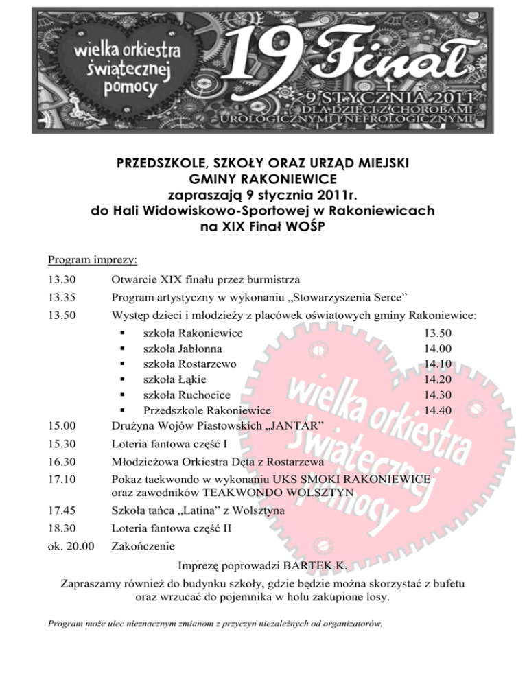 PRZEDSZKOLE, SZKOŁY ORAZ URZĄD MIEJSKI GMINY RAKONIEWICE zapraszają 9 stycznia 2011r. do Hali Widowiskowo-Sportowej w Rakoniewicach na XIX Finał WOŚP Program imprezy: 13.30 Otwarcie XIX finału przez burmistrza 13.35 Program artystyczny w wykonaniu „Stowarzyszenia Serce” 13.50 Występ dzieci i młodzieŜy z placówek oświatowych gminy Rakoniewice: 15.00 szkoła Rakoniewice szkoła Jabłonna szkoła Rostarzewo szkoła Łąkie szkoła Ruchocice Przedszkole Rakoniewice DruŜyna Wojów Piastowskich „JANTAR” 15.30 Loteria fantowa część I 16.30 MłodzieŜowa Orkiestra Dęta z Rostarzewa 17.10 Pokaz taekwondo w wykonaniu UKS SMOKI RAKONIEWICE oraz zawodników TEAKWONDO WOLSZTYN 17.45 Szkoła tańca „Latina” z Wolsztyna 18.30 Loteria fantowa część II ok. 20.00 Zakończenie 13.50 14.00 14.10 14.20 14.30 14.40 Imprezę poprowadzi BARTEK K. Zapraszamy równieŜ do budynku szkoły, gdzie będzie moŜna skorzystać z bufetu oraz wrzucać do pojemnika w holu zakupione losy. Program moŜe ulec nieznacznym zmianom z przyczyn niezaleŜnych od organizatorów.