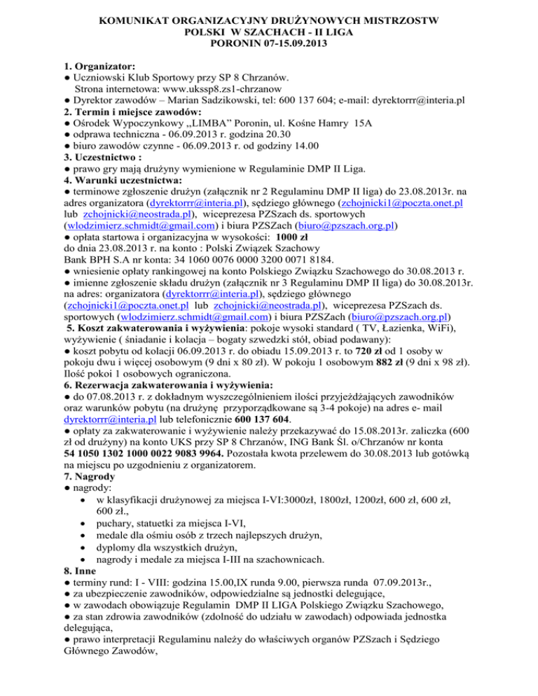 KOMUNIKAT ORGANIZACYJNY DRUÝYNOWYCH MISTRZOSTW POLSKI W SZACHACH - II LIGA PORONIN 07-15.09.2013 1. Organizator: ● Uczniowski Klub Sportowy przy SP 8 Chrzanów. Strona internetowa: www.ukssp8.zs1-chrzanow ● Dyrektor zawodów – Marian Sadzikowski, tel: 600 137 604; e-mail: [email protected] 2. Termin i miejsce zawodów: ● Oœrodek Wypoczynkowy ,,LIMBA” Poronin, ul. Koœne Hamry 15A ● odprawa techniczna - 06.09.2013 r. godzina 20.30 ● biuro zawodów czynne - 06.09.2013 r. od godziny 14.00 3. Uczestnictwo : ● prawo gry maj¹ dru¿yny wymienione w Regulaminie DMP II Liga. 4. Warunki uczestnictwa: ● terminowe zgùoszenie dru¿yn (zaù¹cznik nr 2 Regulaminu DMP II liga) do 23.08.2013r. na adres organizatora ([email protected]), sêdziego gùównego ([email protected] lub [email protected]), wiceprezesa PZSzach ds. sportowych ([email protected]) i biura PZSZach ([email protected]) ● opùata startowa i organizacyjna w wysokoœci: 1000 zù do dnia 23.08.2013 r. na konto : Polski Zwi¹zek Szachowy Bank BPH S.A nr konta: 34 1060 0076 0000 3200 0071 8184. ● wniesienie opùaty rankingowej na konto Polskiego Zwi¹zku Szachowego do 30.08.2013 r. ● imienne zgùoszenie skùadu dru¿yn (zaù¹cznik nr 3 Regulaminu DMP II liga) do 30.08.2013r. na adres: organizatora ([email protected]), sêdziego gùównego ([email protected] lub [email protected]), wiceprezesa PZSzach ds. sportowych ([email protected]) i biura PZSZach ([email protected]) 5. Koszt zakwaterowania i wy¿ywienia: pokoje wysoki standard ( TV, £azienka, WiFi), wy¿ywienie ( œniadanie i kolacja – bogaty szwedzki stóù, obiad podawany): ● koszt pobytu od kolacji 06.09.2013 r. do obiadu 15.09.2013 r. to 720 zù od 1 osoby w pokoju dwu i wiêcej osobowym (9 dni x 80 zù). W pokoju 1 osobowym 882 zù (9 dni x 98 zù). Iloœã pokoi 1 osobowych ograniczona. 6. Rezerwacja zakwaterowania i wy¿ywienia: ● do 07.08.2013 r. z dokùadnym wyszczególnieniem iloœci przyje¿d¿aj¹cych zawodników oraz warunków pobytu (na dru¿ynê przyporz¹dkowane s¹ 3-4 pokoje) na adres e- mail [email protected] lub telefonicznie 600 137 604. ● opùaty za zakwaterowanie i wy¿ywienie nale¿y przekazywaã do 15.08.2013r. zaliczka (600 zù od dru¿yny) na konto UKS przy SP 8 Chrzanów, ING Bank Úl. o/Chrzanów nr konta 54 1050 1302 1000 0022 9083 9964. Pozostaùa kwota przelewem do 30.08.2013 lub gotówk¹ na miejscu po uzgodnieniu z organizatorem. 7. Nagrody ● nagrody: w klasyfikacji dru¿ynowej za miejsca I-VI:3000zù, 1800zù, 1200zù, 600 zù, 600 zù, 600 zù., puchary, statuetki za miejsca I-VI, medale dla oœmiu osób z trzech najlepszych dru¿yn, dyplomy dla wszystkich dru¿yn, nagrody i medale za miejsca I-III na szachownicach. 8. Inne ● terminy rund: I - VIII: godzina 15.00,IX runda 9.00, pierwsza runda 07.09.2013r., ● za ubezpieczenie zawodników, odpowiedzialne s¹ jednostki deleguj¹ce, ● w zawodach obowi¹zuje Regulamin DMP II LIGA Polskiego Zwi¹zku Szachowego, ● za stan zdrowia zawodników (zdolnoœã do udziaùu w zawodach) odpowiada jednostka deleguj¹ca, ● prawo interpretacji Regulaminu nale¿y do wùaœciwych organów PZSzach i Sêdziego Gùównego Zawodów, ● Organizator zastrzega sobie prawo do ostatecznej interpretacji i ewentualnych zmian w treœci niniejszego Komunikatu. 9. Dodatkowe ● Dla uczestników zawodów czynny bêdzie nieodpùatnie bufet kawowy 24 h z napojami i ciastem podczas rundy, ● nieodpùatny dostêp do Internetu oraz WiFi w pokojach, ● nieodpùatnie boiska sportowe, bilardy, tenis stoùowy, piùkarzyki, ● sale do analiz, spotkañ towarzyskich, bezpùatny parking, ● imprezy towarzysz¹ce: wycieczka z przewodnikiem do Zakopanego, êródùa termalne, basen kryty w oœrodku, sauny, turniej szachów bùyskawicznych, ognisko z kapel¹ góralsk¹, prelekcje dla zawodników i trenerów. W przypadku rezygnacji klubów z udziaùu lub utraty przez nich uprawnieñ, poniesione ju¿ opùaty, wymienione w punktach 4,5,6 przepadaj¹. W przypadku niesportowego zachowania i powa¿nego zùamania regulaminu pobytu w oœrodku organizator i wùaœciciel oœrodka zastrzegaj¹ sobie prawo usuniêcia osoby z oœrodka z brakiem wstêpu na jego teren. Dyrektor Zawodów Marian Sadzikowski Sêdzia Gùówny Zenon Chojnicki