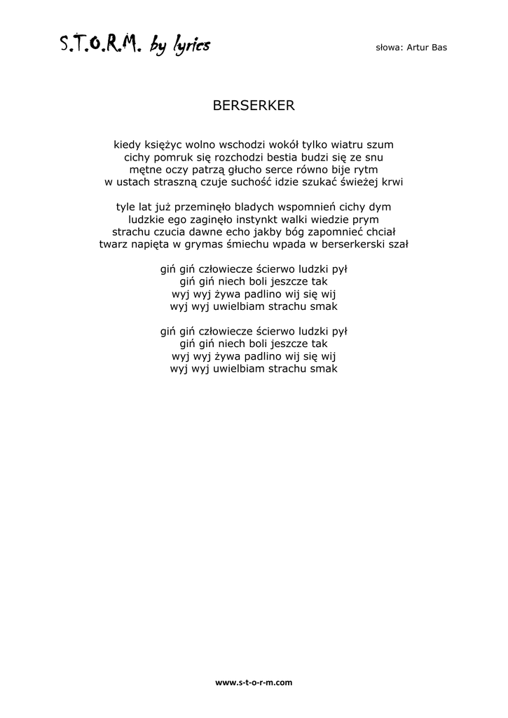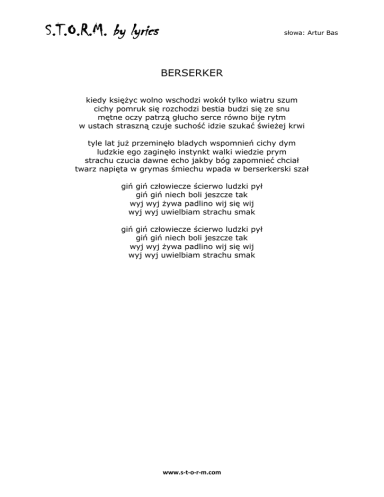 S.T.O.R.M. by lyrics słowa: Artur Bas BERSERKER kiedy księżyc wolno wschodzi wokół tylko wiatru szum cichy pomruk się rozchodzi bestia budzi się ze snu mętne oczy patrzą głucho serce równo bije rytm w ustach straszną czuje suchość idzie szukać świeżej krwi tyle lat już przeminęło bladych wspomnień cichy dym ludzkie ego zaginęło instynkt walki wiedzie prym strachu czucia dawne echo jakby bóg zapomnieć chciał twarz napięta w grymas śmiechu wpada w berserkerski szał giń giń człowiecze ścierwo ludzki pył giń giń niech boli jeszcze tak wyj wyj żywa padlino wij się wij wyj wyj uwielbiam strachu smak giń giń człowiecze ścierwo ludzki pył giń giń niech boli jeszcze tak wyj wyj żywa padlino wij się wij wyj wyj uwielbiam strachu smak www.s-t-o-r-m.com