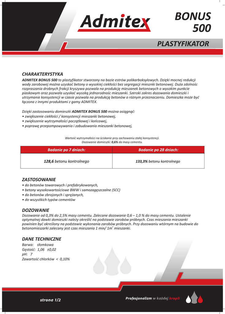 BONUS 500 PLASTYFIKATOR CHARAKTERYSTYKA ADMITEX BONUS 500 to plastyfikator stworzony na bazie estrów polikarboksylowych. Dzięki mocnej redukcji wody zarobowej można uzyskać betony o wysokiej ciekłości bez segregacji miesznki betonowej. Duża zdolnośc rozpraszania drobnych frakcji kryszywa pozwala na produkcję mieszanek betonowych o wysokim punkcie piaskowym oraz pozwala uzyskać wysoką jednorodnośc mieszanki. Szeroki zakres dozowania domieszki i utrzymanie konsystencji w czasie pozwala na produkcję betonów o różnym przeznaczeniu. Domieszka może być łączona z innymi produktami z gamy ADMITEX. Dzięki zastosowaniu domieszki ADMITEX BONUS 500 można osiągnąć: • zwiększenie ciekłości / konsystencji mieszanki betonowej, • zwiększenie wytrzymałości początkowej i końcowej, • poprawę przepompowywania i zabudowania mieszanki betonowej, Wartość wytrzymałości na ściskanie przy zachowaniu stałej konsystencji. Dozowanie domieszki: 0,6% do masy cementu. ZASTOSOWANIE • do betonów towarowych i prefabrykowanych, • betony wysokowartościowe BWW i samozagęszczalne (SCC) • do betonów zbrojonych i sprężanych, • do wszystkich typów cementów DOZOWANIE Dozowanie od 0,3% do 2,5% masy cementu. Zalecane dozowanie 0,6 – 1,0 % do masy cementu. Ustalenie optymalnej dawki domieszki należy określić na podstawie zarobów próbnych. Czas mieszania mieszanki powinien być określony na podstawie wykonania zarobów próbnych. Przy dozowaniu wtórnym na budowie do betonomieszarki zalecany jest czas mieszania 1 min/ 1m3 mieszanki. DANE TECHNICZNE Barwa: słomkowa Gęstość: 1,06 ±0,02 pH: 7 Zawartość chlorków < 0,10% strona 1/strona 1/22 BONUS 500 PLASTYFIKATOR MAGAZYNOWANIEPrzechowywać w zadaszonych pomieszczeniach, w szczelnie zamkniętych opakowaniach w temperaturze 5-400C. Po dłuższym składowaniu lub zamarznięciu należy przemieszać. Termin ważności 12 miesięcy. OPAKOWANIE I TRANSPORT • w 1000 litrowych kontenerach zwrotnych, • w 200 litrowych beczkach z tworzywa sztucznego zwrotnych, • transport w zamkniętych środkach transportu, nie podlega ograniczeniom ADR, • domieszka jest produktem bezpiecznym, ZALECENIA BEZPIECZEŃSTWA ADMITEX BONUS 500 nie jest materiałem niebezpiecznym. Postępować zgodnie z przyjętymi zasadami bezpieczeństwa. W razie zbrudzenia zdjąć ubranie i spłukać zanieczyszczoną skórę dużą ilością wody. Szczegółowe informacje dotyczące zdrowia, bezpieczeństwa dostępne są w Karcie Charakterystyki. UWAGI Dane zawarte w Karcie Informacyjnej mają charakter orientacyjny i zostały podane w oparciu o doświadczenie w produkcji i praktycznym stosowaniu. Ze względu na zróżnicowane użycie surowców przy produkcji betonu należy przeprowadzić odpowiednie próby i badania. Gwarancja jakości obejmuję jedynie sprzedaż i dostawę produktu i nie obejmuje sposobu w jaki klient magazynuje produkt. W przypadku dodatkowych pytań prosimy o kontakt telefoniczny: 32 601 24 79 stronstrona 2/2a 2/2