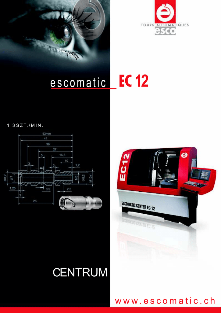 12 1 . 3 S Z T. / M I N . CENTRUM w w w. e s c o m a t i c . c h ZASADA e s c o m a t i c 2 escomatic.ch W porównaniu z konwencjonalnymi automatami tokarskimi automaty tokarskie escomatic wyróżnia szczególna zasada działania. Materiał doprowadzany jest z kręgu (kłębka) lub podawany w postaci pręta. Nie wiruje on, lecz obrabiany jest przez wirującą głowicę narzędziową. Tej zasadzie budowy nadającej się najlepiej dla produkcji mało-, średnio- i wielkoseryjnej, zawdzięczają maszyny escomatic swoją wysoką wydajność i ekonomiczność. 2A 2B 3A 3B 1 Przykłady: Podziałka w milimetrach 5 SZT./MIN. (MOSIĄDZ) 0 mm 2.5 SZT./MIN. 4 SZT./MIN. 1.3 SZT./MIN. (316L/1.4404) (303/1.4305) (9SMnPb28/1.0718) 10 20 30 40 50 ESCO SA CH 2206 Les Geneveys-sur-Coffrane Tél. +41 32 858 12 12 EC 12: BEZKOMPROMISOWO ELASTYCZNY I PRECYZYJNY DOPROWADZENIE MATERIAŁU Maszyna jest zasilana materiałem z kręgu (do średnicy 8 mm) lub w postaci pręta (do średnicy 12 mm). W przypadku pracy z kręgu, konieczne jest dostawienie odrębnej stacji prostowania. Krąg w zależności od materiału ma masę między 30 a 80 kg; materiał odwijany jest z odwijaka dostawionego do maszyny. Do zasilania materiałem prętowym można zastosować handlowy podajnik prętów. Jednostka posuwu przeciąga materiał przez maszynę. 1 (A) POSUW MATERIAŁU Materiał jest przesuwany i doprowadzany do maszyny przez oś Z1 sterowaną CNC oraz jednostkę posuwową. Tulejka posuwowa (Typ Schäublin F12) zamontowana jest w systemie rurowym możliwie blisko tulejki prowadzącej. (B) TOCZENIE 2 Materiał doprowadzany jest przez tulejkę prowadzącą do czterech narzędzi tokarskich umieszczonych na głowicy narzędziowej i sterowanych w osiach X1 i Y1. Każdorazowo można jednocześnie zastosować dwa narzędzia. Toczenie i odcinanie odbywa się według unikalnej zasady escomatic, zgodnie z którą cztery narzędzia tokarskie wirują wokół przedmiotu obrabianego z prędkością do 8’000 min-1. W celu odcięcia bez czopa, przedmiot obrabiany mocowany jest w tulejce zaciskowej przeciwwrzeciona i następnie po odcięciu, doprowadzany do centralnej jednostki obróbkowej do dalszej obróbki. (A) OBRÓBKA DRUGIEJ STRONY Jednostka do obróbki drugiej strony (DUA) posiada sześć pozycji osiowych, do kombinacji narzędzi stałych i napędzanych jak również oprawek nożowych do toczenia oraz cztery pozycje poprzeczne do kombinacji narzędzi napędzanych usytuowanych poprzecznie lub pod kątem do osi toczenia. Maksymalna prędkość obrotowa przeciwwrzeciona C1 z osią C oraz tulejką zaciskową do mocowania od drugiej strony (Typ Schaublin W20) wynosi 9’000 obr./min. Za pomocą tej jednostki przesuwnej w trzech osiach (X2, Z2 i Y2) można wykonywać zabiegi wiercenia, nacinania gwintów wewnętrznych i zewnętrznych, jak również frezowania i toczenia. (B) OBRÓBKA OD CZOŁA 3 Jednostka do obróbki od czoła (DUF) posiada sześć pozycji osiowych, do kombinacji narzędzi stałych i napędzanych jak również oprawek nożowych do toczenia oraz cztery pozycje poprzeczne do kombinacji narzędzi napędzanych usytuowanych poprzecznie lub pod kątem do osi toczenia. Maksymalna prędkość obrotowa przeciwwrzeciona C2 z osią C oraz tulejką zaciskową do mocowania od drugiej strony (Typ Schaublin W20) wynosi 9’000 obr./min. Za pomocą tej jednostki przesuwnej w trzech osiach (X3, Z3 i Y3) można wykonywać zabiegi wiercenia, nacinania gwintów wewnętrznych i zewnętrznych, jak również frezowania i toczenia. Do odbioru części gotowych służy zintegrowane z maszyną ramię chwytające. Fax +41 32 858 12 05 [email protected] www.escomatic.ch 3 EC 12: 4 BEZKOMPROMISOWO ELASTYCZNY I PRECYZYJNY Escomatic EC 12: elastyczne centrum tokarskie firmy ESCO do obróbki materiału o średnicach do 8 mm z kręgu i do 12 mm z pręta. Wyposażone w głowicę narzędziową wirującą z prędkością obrotową 8’000 obrotów/min. i cztery odrębnie sterowane noże tokarskie (po dwa pracujące jednocześnie). Równoległa obróbka 3 przedmiotów obrabianych: toczenie, obróbka od strony czołowej i od tyłu. Zastosowanie handlowych narzędzi oraz płytek wymiennych. Największa elastyczność do najprzeróżniejszych zastosowań i przedmiotów obrabianych dzięki dwóm jednostkom do obróbki na gotowo (każda z osią C) oraz do 24 dodatkowym narzędziom do zabiegów wiercenia, frezowania i gwintowania. Bardzo elastyczne maszyny serii EC 12 nadają się szczególnie do następujących obszarów zastosowań: • • • • • • Przemysł motoryzacyjny Elementy systemów hydraulicznych, elektroniki i złączy Technika medyczna i stomatologiczna Precyzyjne śruby Urządzenia audio i video oraz biurowe Produkcja cylindrów do zamków Ciesząca się świetną opinią i sprawdzona zasada escomatic (wirująca głowica narzędziowa wokół nieobracającego się materiału) umożliwia obróbkę materiału walcowego i profilowego z bardzo wysoką wydajnością przy niskich kosztach. Przedstawicielstwo: E-mail: [email protected] Internet: www.meftech.com.pl ESCO SA CH 2206 Les Geneveys-sur-Coffrane Tél. +41 32 858 12 12 Fax +41 32 858 12 05 [email protected] www.escomatic.ch