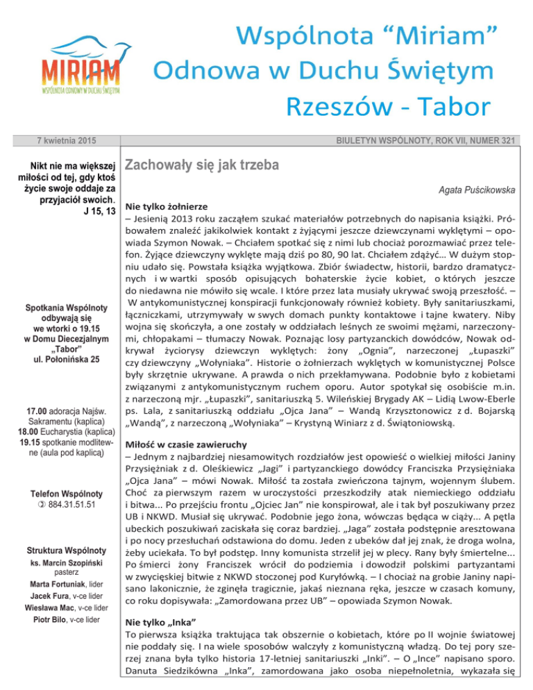 7 kwietnia 2015 BIULETYN WSPÓLNOTY, ROK VII, NUMER 321 Nikt nie ma większej Zachowały się jak trzeba miłości od tej, gdy ktoś życie swoje oddaje za Agata Puścikowska przyjaciół swoich. J 15, 13 Nie tylko żołnierze – Jesienią 2013 roku zacząłem szukać materiałów potrzebnych do napisania książki. Próbowałem znaleźć jakikolwiek kontakt z żyjącymi jeszcze dziewczynami wyklętymi – opowiada Szymon Nowak. – Chciałem spotkać się z nimi lub chociaż porozmawiać przez telefon. Żyjące dziewczyny wyklęte mają dziś po 80, 90 lat. Chciałem zdążyć… W dużym stopniu udało się. Powstała książka wyjątkowa. Zbiór świadectw, historii, bardzo dramatycznych i w wartki sposób opisujących bohaterskie życie kobiet, o których jeszcze do niedawna nie mówiło się wcale. I które przez lata musiały ukrywać swoją przeszłość. – W antykomunistycznej konspiracji funkcjonowały również kobiety. Były sanitariuszkami, Spotkania Wspólnoty łączniczkami, utrzymywały w swych domach punkty kontaktowe i tajne kwatery. Niby odbywają się wojna się skończyła, a one zostały w oddziałach leśnych ze swoimi mężami, narzeczonywe wtorki o 19.15 w Domu Diecezjalnym mi, chłopakami – tłumaczy Nowak. Poznając losy partyzanckich dowódców, Nowak od„Tabor” krywał życiorysy dziewczyn wyklętych: żony „Ognia”, narzeczonej „Łupaszki” ul. Połonińska 25 czy dziewczyny „Wołyniaka”. Historie o żołnierzach wyklętych w komunistycznej Polsce były skrzętnie ukrywane. A prawda o nich przekłamywana. Podobnie było z kobietami związanymi z antykomunistycznym ruchem oporu. Autor spotykał się osobiście m.in. z narzeczoną mjr. „Łupaszki”, sanitariuszką 5. Wileńskiej Brygady AK – Lidią Lwow-Eberle ps. Lala, z sanitariuszką oddziału „Ojca Jana” – Wandą Krzysztonowicz z d. Bojarską 17.00 adoracja Najśw. Sakramentu (kaplica) „Wandą”, z narzeczoną „Wołyniaka” – Krystyną Winiarz z d. Świątoniowską. 18.00 Eucharystia (kaplica) 19.15 spotkanie modlitewne (aula pod kaplicą) Telefon Wspólnoty 884.31.51.51 Struktura Wspólnoty ks. Marcin Szopiński pasterz Marta Fortuniak, lider Jacek Fura, v-ce lider Wiesława Mac, v-ce lider Piotr Bilo, v-ce lider Miłość w czasie zawieruchy – Jednym z najbardziej niesamowitych rozdziałów jest opowieść o wielkiej miłości Janiny Przysiężniak z d. Oleśkiewicz „Jagi” i partyzanckiego dowódcy Franciszka Przysiężniaka „Ojca Jana” – mówi Nowak. Miłość ta została zwieńczona tajnym, wojennym ślubem. Choć za pierwszym razem w uroczystości przeszkodziły atak niemieckiego oddziału i bitwa... Po przejściu frontu „Ojciec Jan” nie konspirował, ale i tak był poszukiwany przez UB i NKWD. Musiał się ukrywać. Podobnie jego żona, wówczas będąca w ciąży... A pętla ubeckich poszukiwań zaciskała się coraz bardziej. „Jaga” została podstępnie aresztowana i po nocy przesłuchań odstawiona do domu. Jeden z ubeków dał jej znak, że droga wolna, żeby uciekała. To był podstęp. Inny komunista strzelił jej w plecy. Rany były śmiertelne... Po śmierci żony Franciszek wrócił do podziemia i dowodził polskimi partyzantami w zwycięskiej bitwie z NKWD stoczonej pod Kuryłówką. – I chociaż na grobie Janiny napisano lakonicznie, że zginęła tragicznie, jakaś nieznana ręka, jeszcze w czasach komuny, co roku dopisywała: „Zamordowana przez UB” – opowiada Szymon Nowak. Nie tylko „Inka” To pierwsza książka traktująca tak obszernie o kobietach, które po II wojnie światowej nie poddały się. I na wiele sposobów walczyły z komunistyczną władzą. Do tej pory szerzej znana była tylko historia 17-letniej sanitariuszki „Inki”. – O „Ince” napisano sporo. Danuta Siedzikówna „Inka”, zamordowana jako osoba niepełnoletnia, wykazała się Animatorzy diakonii Alicja Smalarz diakonia adoracyjna Marta Fortuniak diakonia prorocka Jacek Fura diakonia modlitwy wstawienniczej i uwolnienia vacat diakonia nauczania Jolanta Skotnicka diakonia uwielbienia Ewa Kruczek diakonia miłosierdzia Karolina Kołodziej diakonia wprowadzająca dla kobiet Dariusz Hołysz diakonia wprowadzająca dla mężczyzn Wiesława Mac diakonia organizacyjna Daniel Chmiel diakonia porządkowa Paweł Wiśniowski diakonia techniczna Klaudia Winiarska diakonia medialna Maria Bassara diakonia modlitwy osłonowej Paweł Kobosz diakonia modlitwy w nagłych potrzebach Maria Hubert diakonia modlitwy za kapłanów Marek Wiśniewski diakonia liturgiczna Joanna Groszek diakonia ewangelizacyjna Maciej Mierzejewski diakonia prowadzenia spotkań Modlitwy wstawiennicze odbywają się we wtorki o 17.30 – zgłoszenia e-mailem lub telefonicznie ogromnym bohaterstwem i hartem ducha. To wzór do naśladowania dla współczesnej polskiej młodzieży: młodziutka sanitariuszka, która nigdy nie strzelała, a rozdawała rannym nieprzyjaciołom bandaże. I za to komuniści skazali ją na karę śmierci – opowiada Nowak. – Do końca się nie poddała... „Inka” przed śmiercią prosiła, by babcia dowiedziała się, że dziewczyna „zachowała się jak trzeba”. Lektura książki Szymona Nowaka pokazuje, że podobnie heroicznych kobiet było po wojnie dużo, dużo więcej. Niektóre z nich to nasze, dyskretnie żyjące gdzieś obok, starsze sąsiadki. Wszystkie zachowały się jak trzeba... Źródło: http://gosc.pl/doc/2367072.Zachowaly-sie-jak-trzeba Słowo Boże do medytacji śr. – Łk 24, 13-35 Poznali Chrystusa przy łamaniu chleba czw. – Łk 24, 35-48 Musiały się wypełnić zapowiedzi Pisma pt .– J 21, 1-14 Ukazanie się Zmartwychwstałego nad Morzem Tyberiadzkim sb. – Mk 16, 9-15 Chrystus zmartwychwstały posyła Apostołów na głoszenie Ewangelii niedz. – J 20, 19-31 Błogosławieni, którzy nie widzieli, a uwierzyli pn. – J 3, 1-8 Jeśli się ktoś nie narodzi z wody i z Ducha, nie może wejść do królestwa Bożego wt. – J 3,