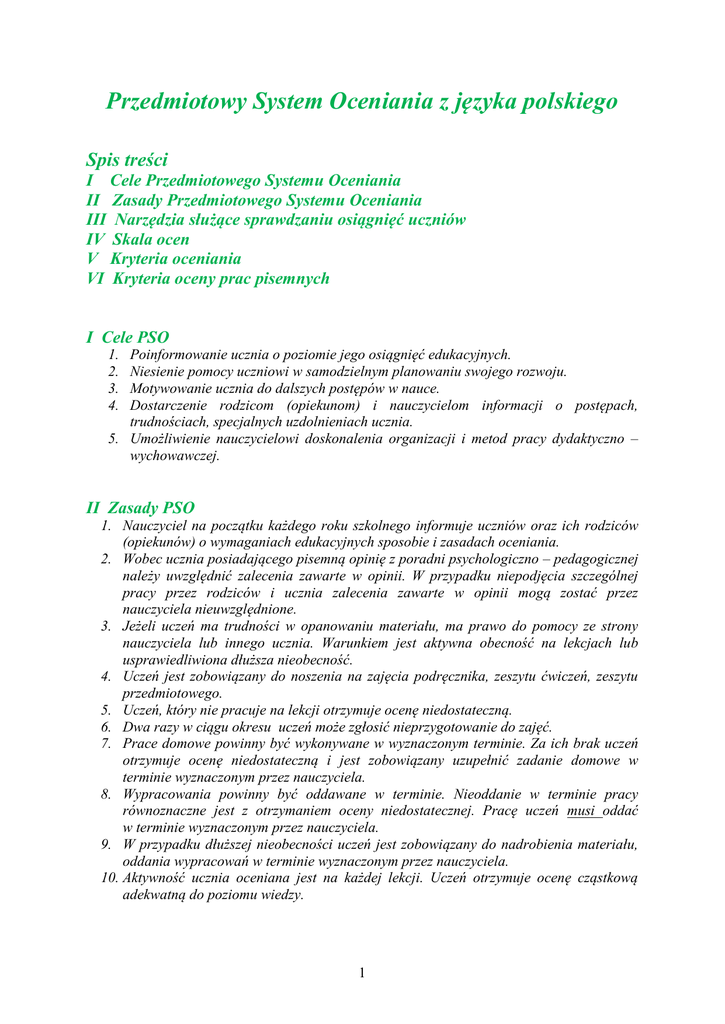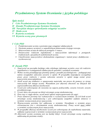 Przedmiotowy System Oceniania z języka polskiego Spis treści I Cele Przedmiotowego Systemu Oceniania II Zasady Przedmiotowego Systemu Oceniania III Narzędzia służące sprawdzaniu osiągnięć uczniów IV Skala ocen V Kryteria oceniania VI Kryteria oceny prac pisemnych I Cele PSO Poinformowanie ucznia o poziomie jego osiągnięć edukacyjnych. Niesienie pomocy uczniowi w samodzielnym planowaniu swojego rozwoju. Motywowanie ucznia do dalszych postępów w nauce. Dostarczenie rodzicom (opiekunom) i nauczycielom informacji o postępach, trudnościach, specjalnych uzdolnieniach ucznia. 5. Umożliwienie nauczycielowi doskonalenia organizacji i metod pracy dydaktyczno – wychowawczej. 1. 2. 3. 4. II Zasady PSO 1. Nauczyciel na początku każdego roku szkolnego informuje uczniów oraz ich rodziców (opiekunów) o wymaganiach edukacyjnych sposobie i zasadach oceniania. 2. Wobec ucznia posiadającego pisemną opinię z poradni psychologiczno – pedagogicznej należy uwzględnić zalecenia zawarte w opinii. W przypadku niepodjęcia szczególnej pracy przez rodziców i ucznia zalecenia zawarte w opinii mogą zostać przez nauczyciela nieuwzględnione. 3. Jeżeli uczeń ma trudności w opanowaniu materiału, ma prawo do pomocy ze strony nauczyciela lub innego ucznia. Warunkiem jest aktywna obecność na lekcjach lub usprawiedliwiona dłuższa nieobecność. 4. Uczeń jest zobowiązany do noszenia na zajęcia podręcznika, zeszytu ćwiczeń, zeszytu przedmiotowego. 5. Uczeń, który nie pracuje na lekcji otrzymuje ocenę niedostateczną. 6. Dwa razy w ciągu okresu uczeń może zgłosić nieprzygotowanie do zajęć. 7. Prace domowe powinny być wykonywane w wyznaczonym terminie. Za ich brak uczeń otrzymuje ocenę niedostateczną i jest zobowiązany uzupełnić zadanie domowe w terminie wyznaczonym przez nauczyciela. 8. Wypracowania powinny być oddawane w terminie. Nieoddanie w terminie pracy równoznaczne jest z otrzymaniem oceny niedostatecznej. Pracę uczeń musi oddać w terminie wyznaczonym przez nauczyciela. 9. W przypadku dłuższej nieobecności uczeń jest zobowiązany do nadrobienia materiału, oddania wypracowań w terminie wyznaczonym przez nauczyciela. 10. Aktywność ucznia oceniana jest na każdej lekcji. Uczeń otrzymuje ocenę cząstkową adekwatną do poziomu wiedzy. 1 11. Uzyskiwane oceny są jawne zarówno dla ucznia, jak i jego rodziców (opiekunów). Sprawdzone i ocenione pisemne prace kontrolne uczeń i jego rodzice (opiekunowie) otrzymują do wglądu na zasadach określonych przez nauczyciela. 12. Jeżeli uczeń na I okres otrzymał ocenę niedostateczną, to w ciągu dwóch miesięcy musi pisemnie poprawić na ocenę pozytywną zagadnienia z działów realizowanych w I okresie. III Narzędzia służące sprawdzaniu osiągnięć uczniów 1. Bieżące ocenianie osiągnięć edukacyjnych ucznia jest dokonywane w następujących formach: a) kontrola indywidualna, b) kontrola grupowa (rozmowa lub pogadanka z całą klasą, której celem jest uzyskanie informacji o poziomie opanowanej wiedzy), c) kontrola bieżąca (służy ustaleniu czy nowy materiał został zrozumiany i przyswojony), d) kontrola semestralna i roczna. 2. Ocenianie osiągnięć edukacyjnych ucznia odbywa się za pomocą poniższych narzędzi: a) rozmowa indywidualna (odpowiedź), b) prace pisemne: - ćwiczenia wykonywane podczas zajęć, - praca domowa, - kartkówka, - sprawdzian, - praca klasowa, - test, - referat (nadobowiązkowo) c) badanie wyników nauczania. 3. Szczegółowe zasady przeprowadzania prac pisemnych: a) kartkówka – niezapowiedziana, materiał z trzech ostatnich lekcji, b) praca klasowa, sprawdzian – zapowiedziane tydzień przed terminem, zanotowane w dzienniku, uczeń poinformowany o zakresie materiału sprawdzanego, c) maksymalnie dwie prace klasowe w tygodniu, d) nauczyciel jest zobowiązany sprawdzić i ocenić prace pisemne w ciągu dwóch tygodni (nie dotyczy wypracowań), e) w ciągu dwóch tygodni od oddania pracy pisemnej uczeń ma możliwość poprawienia oceny na zasadach określonych przez nauczyciela, do dziennika wpisuje się obydwie oceny 2 IV Skala ocen 1. Oceny bieżące ustala się według następującej skali: STOPIEŃ CELUJĄCY OZNACZENIA CYFROWE 6 STRÓT CEL BARDZO DOBRY 5 BDB DOBRY 4 DB DOSTATECZNY 3 DST DOPUSZCZAJĄCY 2 DOP NIEDOSTATECZNY 1 NDST 2. W przypadku ocen cząstkowych dopuszcza się stosowanie „+” i „-”. Niedopuszczalne jest stosowanie wykrzyknika, podwójnego minusa lub innych znaków. 3 V Kryteria oceniania Klasa I Ocena celująca Otrzymuje uczeń, który: twórczo oraz samodzielnie rozwija własne uzdolnienia i zainteresowania proponuje rozwiązania oryginalne jego wypowiedzi ustne i pisemne są bezbłędne oraz cechują się dojrzałością myślenia nie powiela cudzych poglądów, potrafi krytycznie ustosunkować się do językowej, literackiej i kulturalnej rzeczywistości bierze udział i osiąga sukcesy w konkursach przedmiotowych i literackich podejmuje działalność literacką lub kulturalną w różnych formach szkolnych, prezentuje wysoki poziom merytoryczny oraz artystyczny Ocena bardzo dobra Otrzymuje uczeń, który opanował pełny zakres wiadomości i umiejętności przewidzianych programem nauczania klasy I Kształcenie językowe i literackie sprawnie posługuje się w wypowiedziach różnymi środkami językowymi, słownictwem o zabarwieniu emocjonalnym biegle dokonuje przekształceń tekstu literackiego redaguje dłuższe formy wypowiedzi pisemnych redaguje krótkie formy wypowiedzi tekstów użytkowych bezbłędnie dokonuje analizy utworu epickiego, odróżnia fikcję od prawdy historycznej rozróżnia fazy przebiegu akcji w utworze (zawiązanie akcji, punkt kulminacyjny, rozwiązanie akcji) dostrzega zmiany zachodzące w postępowaniu bohaterów dobiera odpowiednie cytaty rozpoznaje komizm słowny, sytuacji i postaci określa rolę autora dramatu, reżysera, scenografa i aktora jako twórcy sztuki teatralnej odczytuje znaki