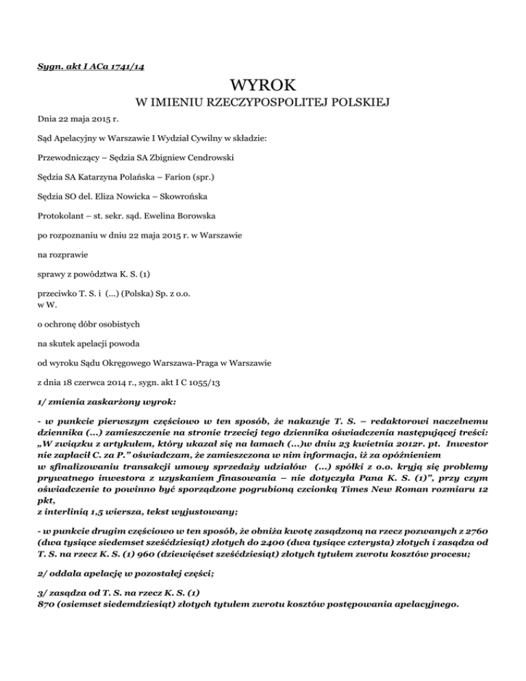 Sygn. akt I ACa 1741/14 WYROK W IMIENIU RZECZYPOSPOLITEJ POLSKIEJ Dnia 22 maja 2015 r. Sąd Apelacyjny w Warszawie I Wydział Cywilny w składzie: Przewodniczący – Sędzia SA Zbigniew Cendrowski Sędzia SA Katarzyna Polańska – Farion (spr.) Sędzia SO del. Eliza Nowicka – Skowrońska Protokolant – st. sekr. sąd. Ewelina Borowska po rozpoznaniu w dniu 22 maja 2015 r. w Warszawie na rozprawie sprawy z powództwa K. S. (1) przeciwko T. S. i (...) (Polska) Sp. z o.o. w W. o ochronę dóbr osobistych na skutek apelacji powoda od wyroku Sądu Okręgowego Warszawa-Praga w Warszawie z dnia 18 czerwca 2014 r., sygn. akt I C 1055/13 1/ zmienia zaskarżony wyrok: - w punkcie pierwszym częściowo w ten sposób, że nakazuje T. S. – redaktorowi naczelnemu dziennika (...) zamieszczenie na stronie trzeciej tego dziennika oświadczenia następującej treści: „W związku z artykułem, który ukazał się na łamach (...)w dniu 23 kwietnia 2012r. pt. Inwestor nie zapłacił C. za P.” oświadczam, że zamieszczona w nim informacja, iż za opóźnieniem w sfinalizowaniu transakcji umowy sprzedaży udziałów (...) spółki z o.o. kryją się problemy prywatnego inwestora z uzyskaniem finasowania – nie dotyczyła Pana K. S. (1)”, przy czym oświadczenie to powinno być sporządzone pogrubioną czcionką Times New Roman rozmiaru 12 pkt, z interlinią 1,5 wiersza, tekst wyjustowany; - w punkcie drugim częściowo w ten sposób, że obniża kwotę zasądzoną na rzecz pozwanych z 2760 (dwa tysiące siedemset sześćdziesiąt) złotych do 2400 (dwa tysiące czterysta) złotych i zasądza od T. S. na rzecz K. S. (1) 960 (dziewięćset sześćdziesiąt) złotych tytułem zwrotu kosztów procesu; 2/ oddala apelację w pozostałej części; 3/ zasądza od T. S. na rzecz K. S. (1) 870 (osiemset siedemdziesiąt) złotych tytułem zwrotu kosztów postępowania apelacyjnego. Sygn. akt I ACa 1741/14 UZASADNIENIE Wyrokiem z dnia 18 czerwca 2014r. Sąd Okręgowy Warszawa –Praga w Warszawie oddalił powództwo K. S. (1) przeciwko T. S. i (...)(Polska) spółce z o.o. z siedzibą w W. o ochronę dóbr osobistych oraz zasądził od powoda na rzecz pozwanych solidarnie kwotę 2 760 zł tytułem zwrotu kosztów procesu. Sąd ten ustalił, że K. S. (1) był prezesem zarządu (...) spółki z o.o. z siedzibą w W.. Dziennik (...) opublikował w dniu 23 kwietnia 2012 r. materiał prasowy pod tytułem Inwestor nie zapłacił C. za P.”. Artykuł opisywał plany spółek grupy C.. Zwrócono w nim uwagę, że pomimo zawartej umowy sprzedaży spółki (...), podpisanej dziewięć miesięcy wcześniej, nadal nie wpłynęło 8 mln złotych od inwestora (...). Podkreślono, że „za (...) stoi prywatny inwestor – K. S. (1). Z informacji (...) wynika, że za opóźnieniem kryją się jego problemy z uzyskaniem finansowania”, po czym zaznaczono, że „biznesmen jest właścicielem L., zajmującego się sprzedażą farmaceutyków. Zarządza też spółką medyczną (...). Do żadnej z tych firm nie zdołaliśmy dotrzeć – nie mają stron internetowych, a ich telefony nie odpowiadają. W związku z problemami biznesmena C. zaczął szukać kolejnych inwestorów.” Autorka artykułu uzyskiwała informacje od prezesa P. i ze spółki (...), w każdym wypadku potwierdzano kłopoty inwestora, przy czym chodziło o spółkę (...) zarządzaną przez powoda, a nie osobiście powoda. Próby kontaktu z powodem okazały się nieskuteczne. Kilka miesięcy po opublikowaniu artykułu spółka (...) wydała komunikat, w którym wskazała, że w dniu 30 maja 2012 r. odstąpiła od umowy sprzedaży udziałów (...) spółki z o.o. zawartej z (...) spółką z o.o., a powodem tego było niespełnienie warunku zabezpieczenia środków finansowych na zapłatę ceny. Analizując powyższe okoliczności Sąd Okręgowy doszedł do wniosku, że nie zostało wykazane naruszenie dobra osobistego. Przedstawione w publikacji informacje dotyczące sytuacji spółki (...) były prawdziwe, a niezależnie dziennikarka otrzymała je z wiarygodnego źródła i dochowała staranności podejmując próbę uzyskania stanowiska powoda. Sąd uznał także, że wiadomość o braku wystarczającego finansowania, choć o zabarwieniu negatywnym, nie ma charakteru obraźliwego, stanowczego i deprecjonującego, a w rozumieniu kręgu odbiorców dziennika (...) oznacza jedynie przejściowe problemy. Przekazanie informacji zostało wreszcie ocenione jako ważne społecznie, szczególnie z perspektywy interesu podmiotów, z którymi spółka powoda współpracowała na bieżąco lub potencjalnie. Sąd odrzucił możliwość odczytania artykułu jako odnoszącego się do powoda jako osoby fizycznej. Powód nie był bowiem opisywanym przez autorkę inwestorem, a sformułowanie, iż „stał za (...) odnosiło się do jego roli w spółce, skoro zarządzał nią, reprezentował ją w negocjacjach, zajmował się pozyskiwaniem finansowania. Niezależnie sąd dostrzegł podstawy do wyłączenia bezprawności w postaci kontratypu realizacji ważnego interesu publicznego, prawa do informacji uzyskanej z wiarygodnych źródeł oraz dochowania w tym zakresie zasad rzetelności i etyki dziennikarskiej. W apelacji od powyższego orzeczenia, w części dotyczącej rozstrzygnięcia o żądaniu niemajątkowym oraz kosztach procesu, powód domagał się zmiany wyroku poprzez zobowiązanie T. S. do zamieszczenia na trzeciej stronie dziennika (...) oświadczenie o następującej treści: "W związku z artykułem, który ukazał się na łamach (...) w dniu 23 kwietnia 2012 r. pt. "Inwestor nie zapłacił C. za P.", oświadczam, iż wszystkie zamieszczone w nim informacje, iż za opóźnieniem związanym z finalizowaniem transakcji umowy sprzedaży udziałów spółki (...) Sp. z o.o. w W. kryją się problemy finansowe Pana K. S. (2) są nieprawdziwe, w związku z czym wyrażam ubolewanie, że artykuł o tej treści ukazał się na łamach gazety" przy czym oświadczen