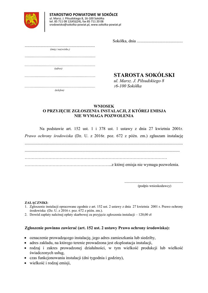 STAROSTWO POWIATOWE W SOKÓŁCE ul. Marsz. J. Piłsudskiego 8, 16-100 Sokółka tel. 85 711 08 12(45)(24), fax 85 711 20 08 [email protected], www.sokolka-powiat.pl Sokółka, dnia ................................................ ......................................................................... (imię i nazwisko,) ................................................................................. ................................................................................. (adres) ................................................................................. STAROSTA SOKÓLSKI ................................................................................. ul. Marsz. J. Piłsudskiego 8 16-100 Sokółka (telefon) WNIOSEK O PRZYJĘCIE ZGŁOSZENIA INSTALACJI, Z KTÓREJ EMISJA NIE WYMAGA POZWOLENIA Na podstawie art. 152 ust. 1 i 378 ust. 1 ustawy z dnia 27 kwietnia 2001r. Prawo ochrony środowiska (Dz. U. z 2016r. poz. 672 z późn. zm.) zgłaszam instalację ....................................................................................................................................................... .................................................................................................................................................... ………………………………………………………………………………………… ……………………………………………………...z której emisja nie wymaga pozwolenia. ........................................................ (podpis wnioskodawcy) ZAŁĄCZNIKI: 1. Zgłoszenie instalacji opracowane zgodnie z art. 152 ust. 2 ustawy z dnia 27 kwietnia 2001 r. Prawo ochrony środowiska (Dz. U. z 2016 r. poz. 672 z późn. zm.). 2. Dowód zapłaty należnej opłaty skarbowej za przyjęcie zgłoszenia instalacji – 120,00 zł Zgłoszenie powinno zawierać (art. 152 ust. 2 ustawy Prawo ochrony środowiska): oznaczenie prowadzącego instalację, jego adres zamieszkania lub siedziby, adres zakładu, na którego terenie prowadzona jest eksploatacja instalacji, rodzaj i zakres prowadzonej działalności, w tym wielkość produkcji lub wielkość świadczonych usług, czas funkcjonowania instalacji (dni tygodnia i godziny), wielkość i rodzaj emisji, STAROSTWO POWIATOWE W SOKÓŁCE ul. Marsz. J. Piłsudskiego 8, 16-100 Sokółka tel. 85 711 08 12(45)(24), fax 85 711 20 08 [email protected], www.sokolka-powiat.pl opis stosowanych metod ograniczania wielkości emisji, informację, czy stopień ograniczania wielkości emisji jest zgodny z obowiązującymi przepisami. Rodzaje instalacji, których eksploatacja wymaga zgłoszenia: Rozporządzenia Ministra Środowiska z dnia 2 lipca 2010 roku w sprawie rodzajów instalacji , których eksploatacja wymaga zgłoszenia (Dz. U. Nr 130, poz. 880) energetyczne o nominalnej mocy cieplnej od 1 MW do: - 5 MW opalane węglem kamiennym; - 10MW opalane koksem, drewnem, słomą, olejem napędowym, olejem opałowym, benzyną lub węglem kamiennym i koksem, drewnem, słomą, olejem napędowym, olejem opałowym, benzyną jeżeli nominalna moc cieplna wprowadzona w węglu kamiennym nie przekracza 5 MW - 15 MW opalane paliwem gazowym lub opalane paliwem gazowym oraz węglem kamiennym, koksem, drewnem, słomą, olejem napędowym, olejem opałowym, benzyną jeżeli nominalna moc cieplna wprowadzona w węglu kamiennym nie przekracza 5 MW, a nominalna moc cieplna wprowadzona w węglu kamiennym, koksie, drewnie, słomie, oleju napędowym, oleju opałowym, benzynie nie przekracza 10 MW inne niż energetyczne o nominalnej mocy cieplnej od 0,5 MW do 1 MW opalane węglem kamiennym, koksem, drewnem, słomą, olejem napędowym i opałowym, benzyną, paliwem gazowym, z których: wprowadzane do powietrza gazy lub pyły pochodzą wyłącznie ze spalania tych paliw lub wprowadzane do powietrza gazy lub pyły pochodzące z prowadzonych w tych instalacjach procesów innych niż spalanie paliw nie powodują przekroczenia 10% dopuszczalnych poziomów substancji w powietrzu albo 10 % wartości odniesienia, do produkcji węgla drzewnego do suszenia zboża, innych płodów rolnych lub leśnych w ilości większej niż 30 Mg na godzinę; do przechowywania zboża lub innych płodów rolnych lub leśnych w ilości większej niż 50 Mg; do przesyłu, przeładunku lub magazynowania paliw płynnych; do chowu lub hodowli zwierząt, zaliczane do przedsięwzięć mogących znacząco oddziaływać na środowisko, o których mowa w art. 51 ust. 1 pkt 2 ustawy z dnia 7 kwietnia 2001 r. - Prawo ochrony środowiska; do produkcji szkła o wydajności mniejszej niż 1 MG na dobę; do suszenia, brykietowania i mielenia węgla o mocy przerobowej mniejszej niż 30 Mg surowca na godzinę; do produkcji wapna palonego o wydajności mniejszej niż 10 Mg na dobę; do lakierowania lub malowania, zużywające mniej niż 1 Mg w ciągu roku wyrobów lakierowych o wysokiej zawartości cząstek stałych lub wyrobów lakierowych wodorozcieńczalnych; STAROSTWO POWIATOWE W SOKÓŁCE ul. Marsz. J. Piłsudskiego 8, 16-100 Sokółka tel. 85 711 08 12(45)(24), fax 85 711 20 08 [email protected], www.sokolka-powiat.pl stosowane w gastronomii przystosowanej do obsługi więcej niż 500 osób na dobę; stosowane w przechowalniach owoców lub warzyw przystosowanych do jednoczesnego przechowywania owoców lub warzyw w ilości większej niż 50 Mg; stosowane w młynach spożywczych; zbiorniki materiałów sypkich o pojemności mniejszej niż 20 m3, dygestoria; inne niż wyżej wymienione rodzaje instalacji nieobjętych standardami emisyjnymi, w przypadku których żadna z substancji wprowadzanych do powietrza nie powoduje przekroczenia 10% dopuszczalnych poziomów substancji w powietrzu albo 10% wartości odniesienia; oczyszczalnie ścieków o przepustowości do 5 m3 na dobę, wykorzystywane na potrzeby własnego gospodarstwa domowego lub rolnego w ramach zwykłego korzystania z wód.