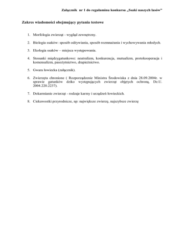 Załącznik nr 1 do regulaminu konkursu „Ssaki naszych lasów” Zakres wiadomości obejmujący pytania testowe 1. Morfologia zwierząt - wygląd zewnętrzny. 2. Biologia ssaków: sposób odżywiania, sposób rozmnażania i wychowywania młodych. 3. Ekologia ssaków – miejsca występowania. 4. Stosunki międzygatunkowe: neutralizm, konkurencja, mutualizm, protokooperacja i komensalizm, pasożytnictwo, drapieżnictwo. 5. Gwara łowiecka (załącznik). 6. Zwierzęta chronione ( Rozporządzenie Ministra Środowiska z dnia 28.09.2004r. w sprawie gatunków dziko występujących zwierząt objętych ochroną, Dz.U. 2004.220.2237). 7. Dokarmianie zwierząt - rodzaje karmy i urządzeń łowieckich. 8. Ciekawostki przyrodnicze, np: największe zwierzę, najszybsze zwierzę