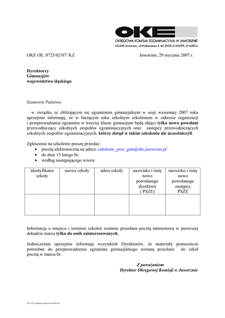 OKE OE. 0725/02/07/ KZ Jaworzno, 29 stycznia 2007 r. Dyrektorzy Gimnazjów województwa śląskiego Szanowni Państwo, w związku ze zbliżającym się egzaminem gimnazjalnym w sesji wiosennej 2007 roku uprzejmie informuję, że w bieżącym roku szkolnym szkoleniem w zakresie organizacji i przeprowadzania egzaminu w trzeciej klasie gimnazjum będą objęci tylko nowo powołani przewodniczący szkolnych zespołów egzaminacyjnych oraz zastępcy przewodniczących szkolnych zespołów egzaminacyjnych, którzy dotąd w takim szkoleniu nie uczestniczyli. Zgłoszenie na szkolenie proszę przesłać: • pocztą elektroniczną na adres: [email protected] • do dnia 15 lutego br. • według następującego wzoru: identyfikator szkoły nazwa szkoły adres szkoły nazwisko i imię nowo powołanego dyrektora ( PSZE) nazwisko i imię nowo powołanego zastępcy PSZE Informacja o miejscu i terminie szkoleń zostanie przesłana pocztą internetową w pierwszej dekadzie marca tylko do osób zainteresowanych. Jednocześnie uprzejmie informuję wszystkich Dyrektorów, że materiały pomocnicze potrzebne do przeprowadzenia egzaminu gimnazjalnego zostaną przesłane do szkół pocztą w marcu br. Z poważaniem Dyrektor Okręgowej Komisji w Jaworznie KZ G 072 spotkania szkoleniowe PSZE.doc