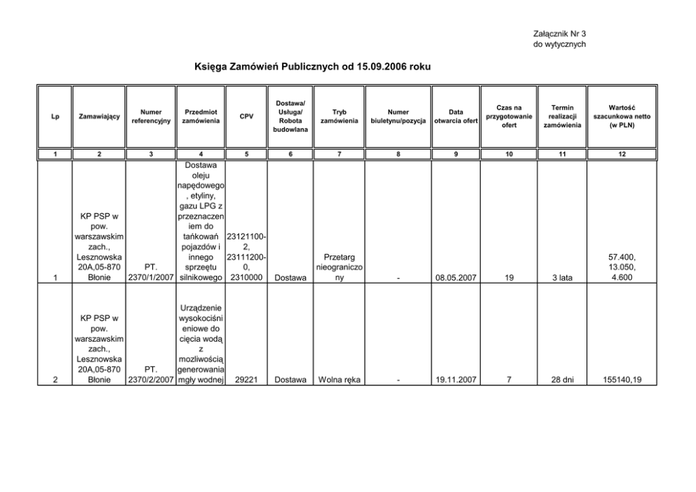 Załącznik Nr 3 do wytycznych Księga Zamówień Publicznych od 15.09.2006 roku Lp Zamawiający Numer referencyjny 1 2 3 Przedmiot zamówienia 4 CPV Dostawa/ Usługa/ Robota budowlana Tryb zamówienia Numer biuletynu/pozycja Data otwarcia ofert Czas na przygotowanie ofert Termin realizacji zamówienia Wartość szacunkowa netto (w PLN) 5 6 7 8 9 10 11 12 Dostawa Przetarg nieograniczo ny - 08.05.2007 19 3 lata 57.400, 13.050, 4.600 Dostawa Wolna ręka - 19.11.2007 7 28 dni 155140,19 1 Dostawa oleju napędowego , etyliny, gazu LPG z KP PSP w przeznaczen pow. iem do warszawskim tańkowań 23121100zach., pojazdów i 2, Lesznowska innego 2311120020A,05-870 PT. sprzeętu 0, Błonie 2370/1/2007 silnikowego 2310000 2 KP PSP w pow. warszawskim zach., Lesznowska 20A,05-870 PT. Błonie 2370/2/2007 Urządzenie wysokociśni eniowe do cięcia wodą z mozliwością generowania mgły wodnej 29221 Liczba otrzymanych ofert w postępowaniu Wartość najkorzystniejszej oferty Wykonawca/ nr umowy 13 14 15 1 1 Wykonawca Liczba protestów w postępowaniu z informacją o uznaniu lub oddaleniu Liczba odwołań z informacją o uznaniu lub oddaleniu Data zawarcia umowy Waloryzacja (Tak/Nie) 19 20 21 22 23 GALON GALON POLSKA POLSKA Sp.z o.o., Sp.z o.o., Warszawa, 3,74 Warszawa, Składowa 2 4,33 1,82 Składowa 2 0 0 29.05. 2007 nie INTERVEN T - Dariusz Stachlewski , 05-850 OŜarów Mazowiecki, ul. 11-go Listopada 8 0 0 19.11. 2007 nie Wartość najdroŜszej oferty Wykonawca Wartość najtańszej oferty 16 17 18 GALON POLSKA Sp.z o.o., 3,74 Warszawa, 3,74 4,33 1,82 Składowa 2 4,33 1,82 INTERVENT - Dariusz Stachlewski, 05-850 OŜarów Mazowiecki, ul. 11-go Listopada 8 / nr 02/11/2007 166 000,00 166 000,00 166 000,00 INTERVEN T - Dariusz Stachlewski, 05-850 OŜarów Mazowiecki, ul. 11-go Listopada 8 Skutki finansowe realizacji postępowania w następnych latach (w PLN) Źródła finansowania (w PLN) Aneksy do umowy/ew. umowy dodatkowe związane z realizacją tego samego postępowania 2007 rok 2008 rok 2009 rok 2010 rok 2011 rok 2012 rok BudŜet Fundusze pomocowe Inne Data zawarcia Wartość 24 25 26 27 28 29 30 31 32 33 34 - - - - - - 68.557,00 - - - - - - - - - - 97 400,00 68 600,00 - - - Suma wartości aneksów lub umów dodatkowych związanych z realizacją tego samego postępowania NaleŜyte wykonanie umów (Tak/Nie) Zastosowanie kar umownych (wartość) 35 36 37 - tak - - tak -