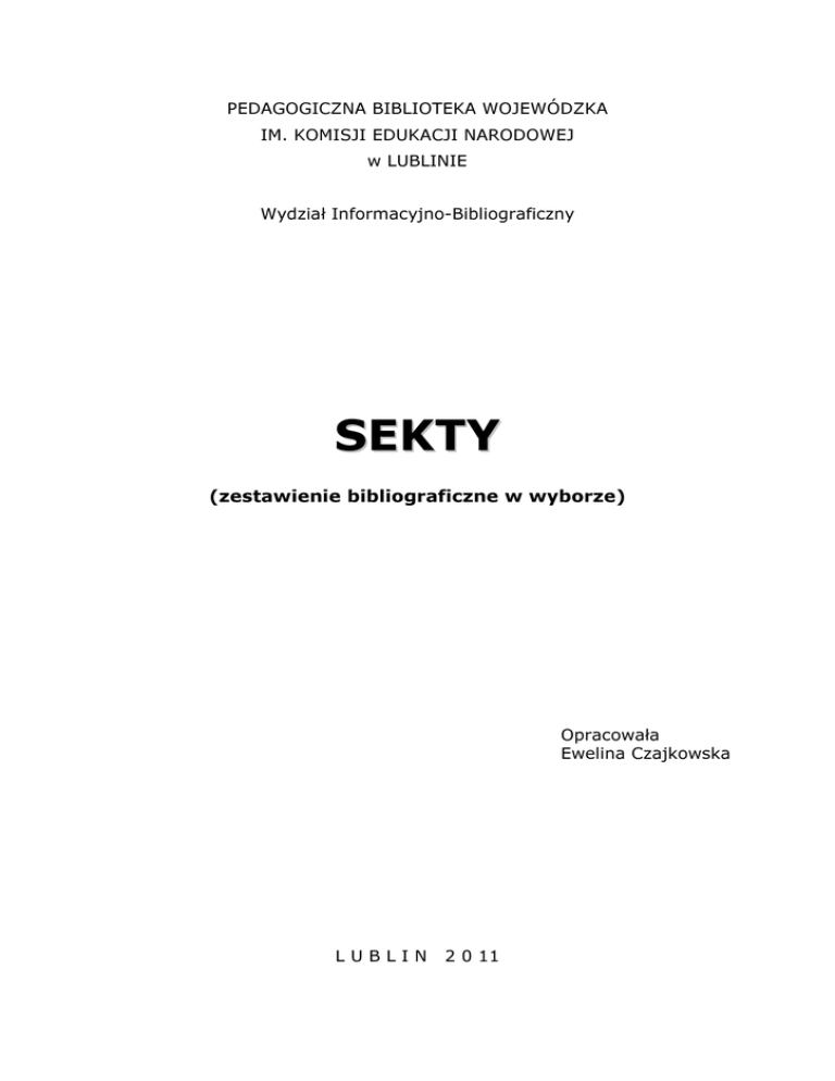 PEDAGOGICZNA BIBLIOTEKA WOJEWÓDZKA IM. KOMISJI EDUKACJI NARODOWEJ w LUBLINIE Wydział Informacyjno-Bibliograficzny S EK T Y (zestawienie bibliograficzne w wyborze) Opracowała Ewelina Czajkowska LUBLIN 2 0 11 Wydawnictwa zwarte 1. ABC o sektach / pod red. Mariusza Gajewskiego. - Wyd. 2 popr. i uzup. - [Tychy] : "Maternus Media" ; Kraków : Katolickie Stowarzyszenie "Civitas Christiana", 2004. - 248 s. 2. Analiza działalności sekt jako przyczynek do refleksji nad niepożądanymi aspektami funkcjonowania kościelnych ruchów religijnych / Piotr Tomasz Nowakowski // W: Wychowanie chrześcijańskie : między tradycją a współczesnością / red. Alina Rynio. - Lublin : Wydaw. Katolickiego Uniwersytetu Lubelskiego, 2007. - S. 1105-1116 Materiały z I Międzynarodowej Konferencji z 15 listopada 2006 r. zorganizowanej przez Katedrę Pedagogiki Chrześcijańskiej, poświęconej tematyce wychowania chrześcijańskiego wobec wyzwań współczesności. 3. Asasyni / Jarosław Pieniek // W: Terroryzm w sektach / pod red. Grzegorza Felsa. - Ruda Śląska ; Tychy : "Maternus Media", cop. 2004. - S. 81-92 4. Człowiek w relacjach socjopedagogicznych : szkice o współczesnym wychowaniu / Stanisław Kawula. - Toruń : "Akapit", 2004. S. 277-289: New Age - nowa era w dziejach świata a wychowanie 5. Dzieci i młodzież w sektach z perspektywy pedagogicznej i społecznej / Mariusz Gajewski // W: Dziecko zagrożone wykluczeniem : elementy diagnozy, działania profilaktyczne i pomocowe / red. Krzysztof Biel, Justyna Kusztal. - Kraków : Wydaw. WAM : "Ignatianum", 2011. - S. 227-256 6. Dzieci w sektach / Hayat El Mountacir. - Kraków : Wydaw. WAM, 2000. - 263 s. 7. Formy sprzeciwu wobec sekt / Anna Jarkowska // W: (Bez)radność wychowania...? : praca zbiorowa / pod red. Zbigniewa Marka i Magdaleny Madej-Babuli. - Kraków : "Ignatianum" : Wydaw. WAM, 2007. - S. 247-261 8. Kontrowersyjne grupy religijne : psychologiczne aspekty przynależności / Dariusz Kuncewicz. - Tychy : "Maternus Media", cop. 2005. - 136 s. 9. Kryminologiczne aspekty sekt destrukcyjnych / Marta RomańczukGrącka. - Olsztyn : Wydaw. Uniwersytetu Warmińsko-Mazurskiego, cop. 2008. - 332 s. 10. Media w społeczeństwie informacyjnym. Sekty i nowe ruchy religijne / pod red. Ilony Fajfer-Kruczek, Łukasza Tomczyka ; Koło Naukowe Pedagogów. Uniwersytet Śląski. - Warszawa : UŚ, 2009. - 111 s. 11. Nauczyciel wobec zagrożeń XXI wieku : sekty religijne i ich wpływ na sytuację szkolną młodzieży / Agnieszka Bochniarz // W: Nauczyciel kompetentny : teraźniejszość i przyszłość / red. Zdzisław Bartkowicz, Marzena Kowaluk, Małgorzata Samujło. Lublin : Wydaw. Uniwersytetu Marii Curie-Skłodowskiej, 2007. S. 325-333 Materiały z konferencji pt.: "Nauczyciel kompetentny teraźniejszość i przyszłość", która odbyła się w dniach 30-31 maja 2005 r. na Wydziale Pedagogiki i Psychologii UMCS w Lublinie 12. Ochrona szkoły przed sektami i psychomanipulacją : bezpieczna szkoła / [Krystyna Kmiecik-Baran, Stefan Kubowicz]. - Gdańsk : Instytut Promocji Nauczycieli, 2002. - 52 s. 13. Patologie społeczne / pod red. Mariusza Jędrzejko ; Wyższa Szkoła Humanistyczna im. Aleksandra Gieysztora. - Pułtusk : WSH im. Aleksandra Gieysztora [Warszawa] : na zlecenie Wydawcy Oficyna Wydawnicza ASPRA-JR, 2006. - 255 s. 14. Patologie wśród dzieci i młodzieży : leczenie i profilaktyka / Stanisław Kozak. - Warszawa : "Difin", cop. 2007. - S. 231-255: Psychomanipulacje w patologicznych sektach religijnych destrukcyjna działalność pseudoewangeliczna - dławienie indywidualności 15. Perswazja i uzdrawianie : analiza porównawcza psychoterapii / Jerome D. Frank, Julia B. Frank. - Warszawa : Instytut Psychologii Zdrowia. Polskie Towarzystwo Psychologiczne, 2005. - S. 71-83: Ruchy odnowy religijnej i sekty 16. Problemy podkultur i sekt wśród młodzieży / Teresa Sołtysiak // W: Pedagogika specjalna : praca zbiorowa / pod red. Władysława Dykcika. - Poznań : Wydaw. Naukowe Uniwersytetu im. Adama Mickiewicza, 2001. - S. 409-434 17. Profilaktyka społeczna : rodzina, szkoła, środowisko lokalne / Monika Szpringer. - Kielce : Wydaw. Akademii Świętokrzyskiej, 2004. - S. 26-51: Przejawy i klasyfikacja zjawisk patologii społecznej 18. Profilaktyka społeczna : rodzina, szkoła, środowisko lokalne / Monika Szpringer. - Kielce : Wydaw. Akademii Świętokrzyskiej, 2004. - S. 119-208: Rozmiary zjawisk patologii społecznej w Polsce i we Włoszech 19. Przemoc doświadczana w grupach kultowych - studium przypadku / Wiesław Kata // W: Wybrane aspekty przemocy : diagnoza i profilaktyka / red. nauk. Renata Małgorzata Ilnicka, Joanna Cichla. - Toruń : "Akapit", 2009. - S. 125-147 20. Psychologiczne mechanizmy przystępowania młodzieży do sekt wybrane koncepcje i ich krytyczna analiza / Dariusz Kuncewicz // W: Problemy współczesnej młodzieży w ujęciu nauk społecznych / pod red. Franciszki Wandy Wawro. - Lublin : Wydaw. Katolickiego Uniwersytetu Lubelskiego, 2007. - S. 173-183 21. Raj oswojony : antropologia nowych ruchów religijnych / Marta Zimniak-Hałajko. - Gdańsk : "Słowo/Obraz Terytoria", cop. 2003. 404 s. 22. Reagowanie na członkostwo w sektach / Lee Richmond i Carole Rayburn // W: Skuteczne interwencje w pracy z młodymi ludźmi z grup ryzyka / pod red. Kathryn Geldard. - Warszawa : "Parpamedia", 2010. - S. 227-238 23. Religioznawstwo : przewodnik tematyczny / Eugeniusz Sakowicz. Lublin : "Polihymnia", 2005. - S. 123-131: Sekty/nowe ruchy religijne 24. Rodzina wobec sekt / Marek Fiałkowski // W: Rodzina wobec współczesnych wyzwań społeczno-kulturowych / red. Julia Gorbaniuk, Beata Parysiewicz. - Lublin : Wydaw. Katolickiego Uniwersytetu Lubelskiego, 2009. - S. 229-236 25. Rozpoznać sektę : kryteriologia sekt / Marcin Pytlak. - Lublin : IZT - Instytut Zastosowań Techniki, 2002. - 162 s. 26. Samotność globalnego nastolatka / Janusz Mastalski. - Kraków : Wydaw. Naukowe Papieskiej Akademii Teologicznej, 2007. S. 425-462: 