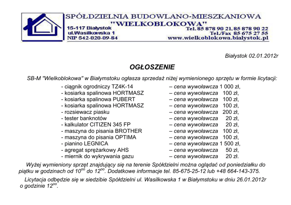 Białystok 02.01.2012r OGŁOSZENIE SB-M "Wielkoblokowa" w Białymstoku ogłasza sprzedaż niżej wymienionego sprzętu w formie licytacji: - ciągnik ogrodniczy TZ4K-14 - kosiarka spalinowa HORTMASZ - kosiarka spalinowa PUBERT - kosiarka spalinowa HORTMASZ - rozsiewacz piasku - tester banknotów - kalkulator CITIZEN 345 FP - maszyna do pisania BROTHER - maszyna do pisania OPTIMA - pianino LEGNICA - agregat sprężarkowy AHS - miernik do wykrywania gazu – cena wywoławcza 1 000 zł, – cena wywoławcza 100 zł, – cena wywoławcza 100 zł, – cena wywoławcza 100 zł, – cena wywoławcza 200 zł, – cena wywoławcza 20 zł, – cena wywoławcza 20 zł, – cena wywoławcza 100 zł, – cena wywoławcza 100 zł, – cena wywoławcza 1 500 zł, – cena wywoławcza 50 zł, – cena wywoławcza 20 zł. Wyżej wymieniony sprzęt znajdujący się na terenie Spółdzielni można oglądać od poniedziałku do piątku w godzinach od 10oo do 12oo. Dodatkowe informacje tel. 85-675-25-12 lub +48 664-143-375. Licytacja odbędzie się w siedzibie Spółdzielni ul. Wasilkowska 1 w Białymstoku w dniu 26.01.2012r o godzinie 12oo.