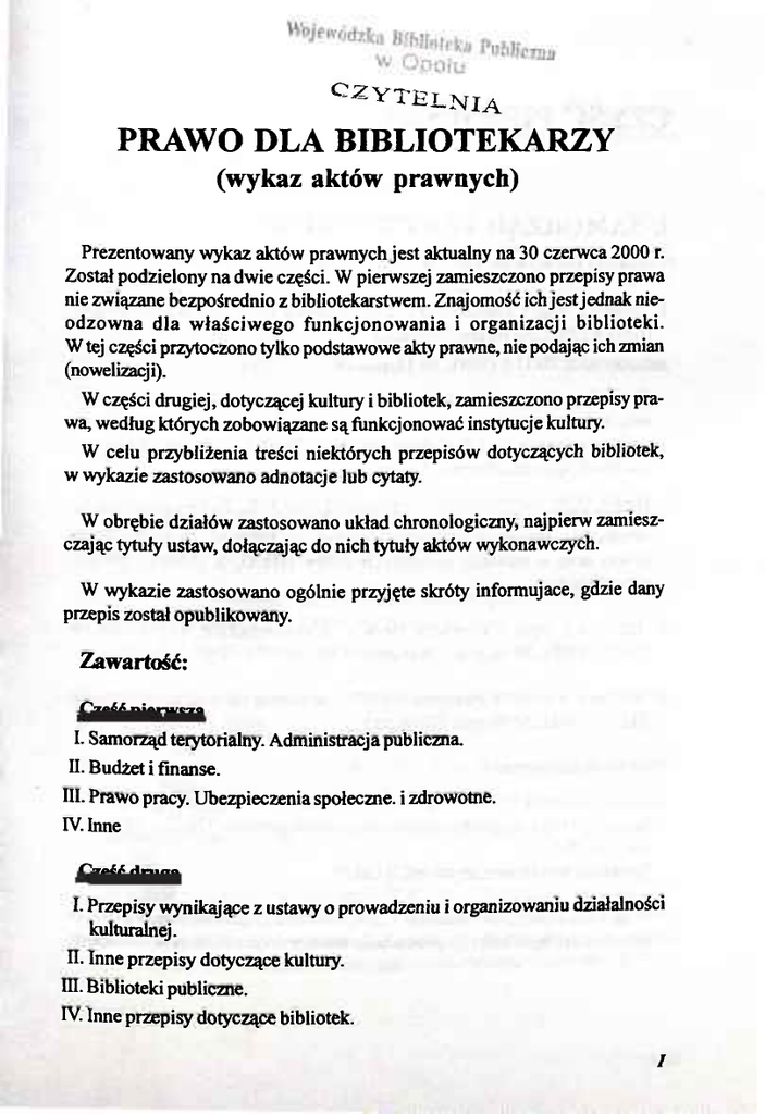 c ^vtelnia PRAWO DLA BIBLIOTEKARZY (wykaz aktów prawnych) Prezentowany wykaz aktów prawnych jest aktualny na 30 czerwca 2000 r. Został podzielony na dwie części. W pierwszej zamieszczono przepisy prawa nie związane bezpośrednio z bibliotekarstwem. Znajomość ich jest jednak nieodzowna dla właściwego funkcjonowania i organizacji biblioteki. W tej części przytoczono tylko podstawowe akty prawne, nie podając ich zmian (nowelizacji). W części drugiej, dotyczącej kultury i bibliotek, zamieszczono przepisy prawa, według których zobowiązane są funkcjonować instytucje kultury. W celu przybliżenia treści niektórych przepisów dotyczących bibliotek, w wykazie zastosowano adnotacje lub cytaty. W obrębie działów zastosowano układ chronologiczny, najpierw zamieszczając tytuły ustaw, dołączając do nich tytuły aktów wykonawczych. W wykazie zastosowano ogólnie przyjęte skróty informujące, gdzie dany przepis został opublikowany. Zawartość: Część pierwsza I. Samorząd terytorialny. Administracja publiczna. II. Budżet i finanse. III. Prawo pracy. Ubezpieczenia społeczne, i zdrowotne. IV. Inne Cześć drugą I. Przepisy wynikające z ustawy o prowadzeniu i organizowaniu działalności kulturalnej. II. Inne przepisy dotyczące kultury. III. Biblioteki publiczne. IV. Inne przepisy dotyczące bibliotek. / CZĘŚĆ PIERWSZA I. SAMORZĄD TERYTORIALNY. ADMINISTRACJA PUBLICZNA 1. Ustawa z dnia 8 marca 1990 r. o samorządzie terytorialnym (gminnym) (Dz.U. z 1990 r., Nr 16, poz. 95 ze zm.) jednolity tekst: Dz.U. z 1996 r., Nr 13, poz. 74 Wart. 7 ust. 1 stwierdza się, że: „Zaspokojenie zbiorowych potrzeb wspólnoty należy do zadań własnych gminy. W szczególności zadania własne obejmują sprawy: [...] 9. Kultury, w tym bibliotek komunalnych i innych placówek upowszechniania kultury." 2. Ustawa z dnia 17 maj a 1990 r. o podziale zadań i kompetencj i określonych w ustawach szczególnych pomiędzy organy gminy a organy administracji rządowej oraz o zmianie niektórych ustaw (Dz.U. z 1990 r., Nr 34, poz. 198zezm.) 3. Ustawa z dnia 5 czerwca 1998 r. o samorządzie wojewódzkim (Dz.U. z 1998 r.,Nr 91, poz. 576 ze zm.) 4. Ustawa z dnia 5 czerwca 1998 r. o samorządzie powiatowym (Dz.U. z 1998 r.,Nr91, poz. 578 zezm.) Przepisy wykonawcze: a) Rozporządzenie Ministra Spraw Wewnętrznych i Administracji z dnia 27 listopada 1998 r. w sprawie wzorcowego statutu powiatu (Dz.U. z 1998 r., Nr 146, poz. 957) [przepisy wykonawcze do art. 2 ust. 5] W §66 ust.2 pkt.5 stwierdza się: „Do jednostek organizacyjnych powiatu należą w szczególności [...] instytucje kultury w tym biblioteki publiczne. II \ 5. Ustawa z dnia 24 lipca 1998 r. o zmianie ustaw określających kompetencje organów administracji publicznej - w związku z reformą ustrój ową państwa (Dz.U. z 1998 r.,Nr 106, poz. 668) Ustawa zwana też „ kompetencyjną". Zob. też: s. VIII, poz. 1A oraz s. XII, poz. 1A 6. Ustawa z dnia 21 stycznia 2000 r. o zmianie niektórych ustaw związanych z funkcjonowaniem administracji publicznej (Dz.U. z 2000 r., Nr 12, poz. 136) Ustawa zwana „czyszczącą" lub „śmieciową". Zob. też: s.VIII poz. 1 B II. BUDŻET I FINANSE 1. Ustawa z dnia 26 lipca 1991 r. o podatku dochodowym od osób fizycznych (Dz.U. z 1991 r., Nr 80, poz. 350 ze zm.) jednolity tekst: Dz.U. z2000 r.,Nr 14, poz. 176 2. Ustawa z dnia 15 lutego 1992 r. o podatku od osób prawnych oraz o zmianie niektórych ustaw (Dz.U.z 1992 r.,Nr21, poz. 86zezm.) jednolity tekst: Dz.U. z 2000 r., Nr 54, poz. 654. 3. Ustawa z dnia 29 września 1994 r. o rachunkowości (Dz.U. z 1994 r., Nr 121,poz. 591 zezm.) 4. Ustawa z dnia 26 listopada 1998 r. o finansach publicznych (Dz.U. z 1998 r., Nr 155, poz. 1014 zezm.) 5. Ustawa Budżetowa na rok 2000 z dnia 21 stycznia2000 r. (Dz.U. z 2000, Nr 7, poz. 85) „ W planie wydatków Państwa na 2000 r." str. 335, poz. 26 zapisano: „dotacja na zadania z zakresu kultury i sztuki wykonywana przez powiaty i samorządy wojewódzkie, w tym [...] na zakup książek dla biblioteki prowadzonych przez jednostki samorządu terytorialnego (9000 tys. zł)." III III. PRAWO PRACY. UBEZPIECZENIA SPOŁECZNE I ZDROWOTNE 1. Ustawa z dnia 26 czerwca 1974 r. - Kodeks pracy (Dz.U. z 1974 r., Nr 24, poz. 141 zezm.) jednolity tekst: Dz.U. z 1998 r.,Nr21, poz. 94 2. Ustawa z dnia 28 grudnia 1989 r. o szczególnych zasadach rozwiązywania z pracownikami stosunku pracy z przyczyn dotyczących zakładu pracy oraz o zmianie niektórych ustaw (Dz.U. z 1990 r., Nr 4, poz. 19) Ustawa zwana „ O grupowych zwolnieniach ". 3. Ustawa z dnia 22 marca 1990 r. o pracownikach samorządowych (Dz.U.z 1990 r.,Nr21, poz. 124 zezm.). 4. Ustawa z dnia 23 maja 1991 r. o związkach zawodowych (Dz.U. z 1991 r., Nr 55, poz. 234 ze zm.) 5. Ustawa z dnia 6 lutego 1997 r. o powszechnym ubezpieczeniu zdrowotnym (Dz.U. z 1997 r. Nr 28, poz. 153 ze zm.) 6. Ustawa z dnia 27 sierpnia 1997 r. o rehabilitacji zawodowej i społecznej oraz zatrudnieniu osób niepełnosprawnych (Dz.U. z 1997 r., Nr 123., poz. 776 ze zm.) 7. Ustawa z dnia 13 października 1998 r. o systemie ubezpieczeń społecznych (Dz.U. z 1998 r, Nr 137, poz. 887 ze zm.) 8. Ustawa z dnia 17 grudnia 1998 r. o emeryturach i rentach z Funduszu Ubezpieczeń Społecznych (Dz.U. z 1998 r., Nr 162, poz. 1118 ze zm.) 9. Rozporządzenie Ministra Edukacj i Narodowej oraz Ministra Pracy i Polityki Socjalnej z 12 października 1993 r., w sprawie zasad i warunków podnoszenia kwalifikacji zawodowych i wykształcenia ogólnego dorosłych (Dz.U. z 1993 r.,Nr 103, poz. 472) 10. Rozporządzenie Ministra Pracy i Polityki Socjalnej z dnia 15 maja 1996 r. w sprawie sposobu usprawiedliwienia nieobecności w pracy oraz IV udzielaniu pracownikom zwolnień z pracy (Dz.U. z 1996 r., Nr 60, poz. 281) 11. Rozporządzenie Ministra Pracy i Polityki Socjalnej z dnia 29 maja 1996 r. w sprawie sposobu ustalenia wynagrodzenia za okres niewykorzystania pracy oraz wynagrodzenia stanowiącego podstawę o