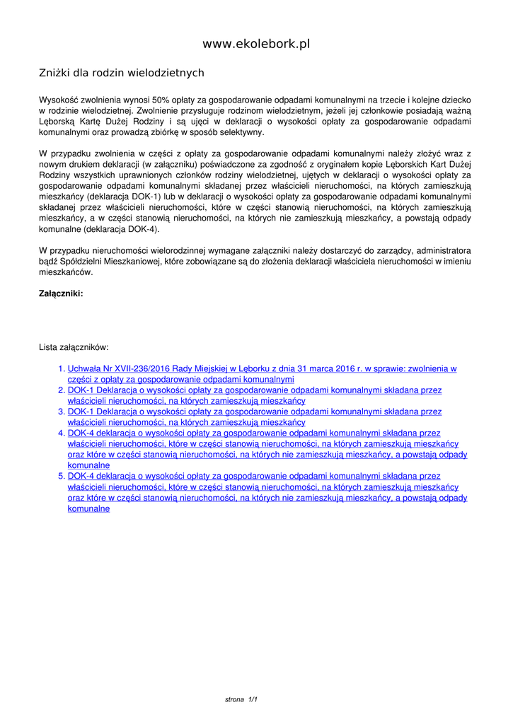 www.ekolebork.pl Zniżki dla rodzin wielodzietnych Wysokość zwolnienia wynosi 50% opłaty za gospodarowanie odpadami komunalnymi na trzecie i kolejne dziecko w rodzinie wielodzietnej. Zwolnienie przysługuje rodzinom wielodzietnym, jeżeli jej członkowie posiadają ważną Lęborską Kartę Dużej Rodziny i są ujęci w deklaracji o wysokości opłaty za gospodarowanie odpadami komunalnymi oraz prowadzą zbiórkę w sposób selektywny. W przypadku zwolnienia w części z opłaty za gospodarowanie odpadami komunalnymi należy złożyć wraz z nowym drukiem deklaracji (w załączniku) poświadczone za zgodność z oryginałem kopie Lęborskich Kart Dużej Rodziny wszystkich uprawnionych członków rodziny wielodzietnej, ujętych w deklaracji o wysokości opłaty za gospodarowanie odpadami komunalnymi składanej przez właścicieli nieruchomości, na których zamieszkują mieszkańcy (deklaracja DOK-1) lub w deklaracji o wysokości opłaty za gospodarowanie odpadami komunalnymi składanej przez właścicieli nieruchomości, które w części stanowią nieruchomości, na których zamieszkują mieszkańcy, a w części stanowią nieruchomości, na których nie zamieszkują mieszkańcy, a powstają odpady komunalne (deklaracja DOK-4). W przypadku nieruchomości wielorodzinnej wymagane załączniki należy dostarczyć do zarządcy, administratora bądź Spółdzielni Mieszkaniowej, które zobowiązane są do złożenia deklaracji właściciela nieruchomości w imieniu mieszkańców. Załączniki: Lista załączników: 1. Uchwała Nr XVII-236/2016 Rady Miejskiej w Lęborku z dnia 31 marca 2016 r. w sprawie: zwolnienia w części z opłaty za gospodarowanie odpadami komunalnymi 2. DOK-1 Deklaracja o wysokości opłaty za gospodarowanie odpadami komunalnymi składana przez właścicieli nieruchomości, na których zamieszkują mieszkańcy 3. DOK-1 Deklaracja o wysokości opłaty za gospodarowanie odpadami komunalnymi składana przez właścicieli nieruchomości, na których zamieszkują mieszkańcy 4. DOK-4 deklaracja o wysokości opłaty za gospodarowanie odpadami komunalnymi składana przez właścicieli nieruchomości, które w części stanowią nieruchomości, na których zamieszkują mieszkańcy oraz które w części stanowią nieruchomości, na których nie zamieszkują mieszkańcy, a powstają odpady komunalne 5. DOK-4 deklaracja o wysokości opłaty za gospodarowanie odpadami komunalnymi składana przez właścicieli nieruchomości, które w części stanowią nieruchomości, na których zamieszkują mieszkańcy oraz które w części stanowią nieruchomości, na których nie zamieszkują mieszkańcy, a powstają odpady komunalne strona 1/1 Powered by TCPDF (www.tcpdf.org)