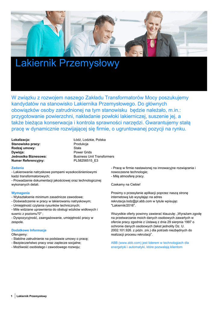 Lakiernik Przemysłowy W związku z rozwojem naszego Zakładu Transformatorów Mocy poszukujemy kandydatów na stanowisko Lakiernika Przemysłowego. Do głównych obowiązków osoby zatrudnionej na tym stanowisku będzie należało, m.in.: przygotowanie powierzchni, nakładanie powłoki lakierniczej, suszenie jej, a także bieżąca konserwacja i kontrola sprawności narzędzi. Gwarantujemy stałą pracę w dynamicznie rozwijającej się firmie, o ugruntowanej pozycji na rynku. Lokalizacja: Stanowisko pracy: Rodzaj umowy: Dywizja: Jednostka Biznesowa: Numer Referencyjny: Łódź, Lodzkie, Polska Produkcja Stała Power Grids Business Unit Transformers PL58256515_E3 Zadania - Lakierowanie natryskowe pompami wysokociśnieniowymi kadzi transformatorowych; - Prowadzenie dokumentacji jakościowej oraz technologicznej wykonanych detali. - Pracę w firmie nastawionej na innowacyjne rozwiązania i nowoczesne technologie; - Miłą atmosferę pracy. Wymagania - Wykształcenie minimum zasadnicze zawodowe; - Doświadczenie w pracy w lakierowaniu natryskowym; - Umiejętność czytania rysunków technicznych; - Mile widziane uprawnienia do obsługi wózków widłowych i suwnic z poziomu"0" ; - Dyspozycyjność, zaangażowanie, umiejętność pracy w zespole. Prosimy o przesyłanie aplikacji poprzez naszą stronę internetową lub wysyłając na adres [email protected] w tytule wpisując "Lakiernik/2016". Dodatkowe Informacje Oferujemy: - Stabilne zatrudnienie na podstawie umowy o pracę; - Bezpieczeństwo pracy oraz zaplecze socjalne; - Możliwość osobistego i zawodowego rozwoju; 1 Lakiernik Przemysłowy Czekamy na Ciebie! Wszystkie oferty powinny zawierać klauzulę: „Wyrażam zgodę na przetwarzanie moich danych osobowych zawartych w ofercie pracy zgodnie z Ustawą z dnia 29 sierpnia 1997 o ochronie danych osobowych (tekst jednolity Dz. U. 2002.101.926. z późn. zm.) dla potrzeb niezbędnych do realizacji procesu rekrutacji”. ABB (www.abb.com) jest liderem w technologiach dla energetyki i automatyki, które pozwalają klientom przemysłowym oraz zakładom użyteczności publicznej zwiększyć swoją efektywność, jednocześnie minimalizując oddziaływanie na środowisko naturalne. Grupa ABB zatrudnia około 135 000 pracowników w blisko 100 krajach świata. Our ambition. Your legacy. 2 Lakiernik Przemysłowy