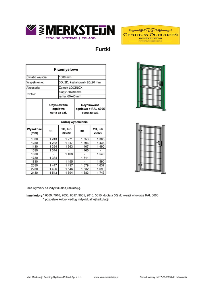 Furtki Przemysłowe Światło wejścia: 1000 mm Wypełnienie: 3D, 2D, kształtownik 20x20 mm Akcesoria Zamek LOCINOX słupy: 80x80 mm rama: 60x40 mm Profile: Ocynkowana ogniowo cena za szt. Ocynkowana ogniowo + RAL 6005 cena za szt. rodzaj wypełnienia Wysokość (mm) 1030 1230 1430 1530 1630 1730 1830 2030 2230 2430 3D 1 243 1 282 1 324 1 344 1 384 1 447 1 496 1 543 2D, lub 20x20 3D 1 271 1 317 1 363 1 408 1 455 1 497 1 546 1 594 1 353 1 396 1 407 1 465 1 511 1 579 1 632 1 683 2D, lub 20x20 1 385 1 435 1 490 1 540 1 590 1 637 1 690 1 743 Inne wymiary na indywidualną kalkulację. Inne kolory:* 6009, 7016, 7030, 8017, 9005, 9010, 5010: dopłata 5% do wersji w kolorze RAL 6005 * pozostałe kolory według indywidualnej kalkulacji Van Merksteijn Fencing Systems Poland Sp. z o.o. www.van-merksteijn.pl Cennik waŜny od 17-03-2010 do odwołania