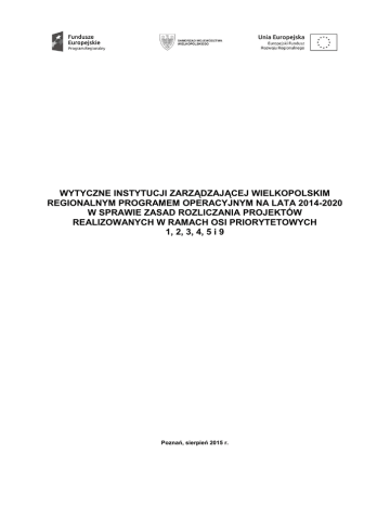WYTYCZNE INSTYTUCJI ZARZĄDZAJĄCEJ WIELKOPOLSKIM REGIONALNYM PROGRAMEM OPERACYJNYM NA LATA 2014-2020 W SPRAWIE ZASAD ROZLICZANIA PROJEKTÓW REALIZOWANYCH W RAMACH OSI PRIORYTETOWYCH 1, 2, 3, 4, 5 i 9 Poznań, sierpień 2015 r. Spis treści I. Wstęp............................................................................................................................................... 3 II. Wniosek o płatność ......................................................................................................................... 3 III. Weryfikacja wniosku o płatność ...................................................................................................... 5 IV. Harmonogram płatności .................................................................................................................. 7 V. Zaliczki wypłacane w ramach Projektów objętych pomocą publiczną oraz zaliczki o wartości przekraczającej 10 mln zł, wypłacane w ramach Projektów nieobjętych pomocą publiczną1 ........ 7 VI. Zaliczki wypłacane w ramach projektów nieobjętych pomocą publiczną2 ..................................... 9 VII. Zabezpieczenie prawidłowego wykorzystania i rozliczenia zaliczek ............................................. 11 VIII. Postęp rzeczowy realizacji Projektu .............................................................................................. 12 IX. Informacje na temat dokonywania zwrotów ................................................................................ 12 1 2 Patrz też przypis 9 Patrz też przypis 11 2 I. Wstęp Niniejsze Wytyczne zostały wydane na podstawie art. 7 ustawy z dnia 11 lipca 2014 r. o zasadach realizacji programów w zakresie polityki spójności finansowanych w perspektywie finansowej 3 2014-2020. Są one skierowane do Instytucji Zarządzającej WRPO 2014+ i opisują stosowane przez nią zasady dotyczące rozliczania Projektów. II. Wniosek o płatność 1. Wniosek o płatność służy do: wnioskowania o przekazanie płatności stanowiącej refundację poniesionych wydatków; wnioskowania o przyznanie płatności zaliczkowej; rozliczenia środków otrzymanych w formie zaliczki; rozliczenia wydatków poniesionych przez państwowe jednostki budżetowe, sfinansowanych ze środków zapisanych w budżecie danego dysponenta; 5) przekazania informacji o postępie rzeczowym Projektu (funkcja sprawozdawcza). 1) 2) 3) 4) 2. Wniosek o płatność może pełnić jednocześnie kilka funkcji, przy czym wniosek o płatność końcową powinien być wnioskiem refundacyjnym i nie może być wnioskiem o płatność zaliczkową. 3. Każdy wniosek o płatność, inny niż zaliczkowy, powinien pełnić również funkcję sprawozdawczą. 4. W przypadku Projektów, dla których wypłata dofinansowania w formie zaliczki jest uwarunkowana ustanowieniem zabezpieczenia jej prawidłowego wykorzystania i rozliczenia (w formie innej niż weksel in blanco wraz z deklaracją wekslową), wniosek o płatność końcową może być wyłącznie wnioskiem o płatność refundacyjną. 5. Wniosek o płatność wraz z załącznikami składany jest za pośrednictwem aplikacji SL2014, 4 o której mowa w Umowie o dofinansowanie . Szczegółowe informacje na temat jej obsługi zawiera dostępny na stronie internetowej www.wrpo.wielkopolskie.pl dokument pn. SL2014 Aplikacja główna Centralny system teleinformatyczny Podręcznik Beneficjenta. 6. Wraz z wnioskiem o płatność składany jest każdorazowo Harmonogram płatności (patrz pkt. IV). 7. W przypadku awarii aplikacji SL2014 trwającej dłużej niż trzy dni robocze lub gdy przypada termin rozliczenia zaliczki, wniosek o płatność wraz z załącznikami oraz Harmonogram płatności składany jest w formie papierowej na adres Departamentu Wdrażania Programu Regionalnego. Dokumenty (w tym potwierdzenie za zgodność z oryginałem składanych kopii dokumentów) muszą zostać podpisane przez osoby upoważnione do reprezentowania Beneficjenta, zgodnie z dokumentami rejestrowymi. 8. Wniosek o płatność składany jest w terminie zgodnym z zaakceptowanym przez Instytucję Zarządzającą WRPO 2014+ Harmonogramem płatności, nie rzadziej niż co trzy miesiące, przy czym pierwszy składany jest w okresie do trzech miesięcy od dnia podpisania Umowy o dofinansowanie. 3 Zarząd Województwa Wielkopolskiego, odpowiedzialny za przygotowanie i realizację Wielkopolskiego Regionalnego Programu Operacyjnego na lata 2014-2020, działający w imieniu i na rzecz Województwa Wielkopolskiego. 4 Umowa o dofinansowanie, na potrzeby niniejszego dokumentu, oznacza również decyzję o dofinansowaniu Projektu, dotyczącą projektów własnych Samorządu Województwa Wielkopolskiego. 3 9. Uzupełnienie, poprawa bądź złożenie dodatkowych wyjaśnień do złożonego wcześniej wniosku o płatność nie jest równoznaczne ze złożeniem kolejnego wniosku o płatność. 10. W przypadku braku możliwości złożenia wniosku o płatność refundacyjną i / lub zaliczkową lub nieponiesienia wydatków podlegających rozliczeniu, w obowiązującym terminie składany jest wniosek pełniący funkcję wyłącznie sprawozdawczą. 11. Wniosek o płatność rozliczający zaliczkę składany jest w terminie do 45 dni od dnia jej otrzymania przez Beneficjenta (z zastrzeżeniem pkt. V.12 i VI.5). W przypadku, gdy zaliczka jest wypłacana przez różnych płatników i / lub w różnych terminach, dla każdego z przelewów biegnie odrębny termin. 12. W przypadku konieczności złożenia wniosku rozliczającego zaliczkę w formie papierowej, o dochowaniu obowiązkowego terminu decyduje data jego nadania w placówce pocztowej lub firmie kurierskiej. 5 13. Wniosek o płatność końcową, który powinien obejmować min. 10 % łącznej kwoty dofinansowania Projektu, składany jest w terminie do 30 dni od daty zakończenia realizacji Projektu. 14. Warunki złożenia wniosku o płatność innego niż pełniącego funkcję wyłącznie s
