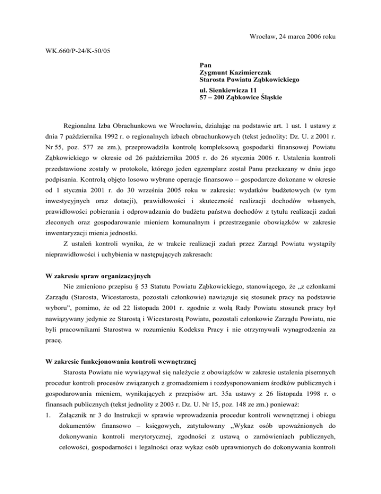 Wroc aw, 24 marca 2006 roku WK.660/P-24/K-50/05 Pan Zygmunt Kazimierczak Starosta Powiatu Z bkowickiego ul. Sienkiewicza 11 57 – 200 Z bkowice l skie Regionalna Izba Obrachunkowa we Wroc awiu, dzia aj$c na podstawie art. 1 ust. 1 ustawy z dnia 7 pa+dziernika 1992 r. o regionalnych izbach obrachunkowych (tekst jednolity: Dz. U. z 2001 r. Nr 55, poz. 577 ze zm.), przeprowadzi a kontrol3 kompleksow$ gospodarki finansowej Powiatu Z$bkowickiego w okresie od 26 pa+dziernika 2005 r. do 26 stycznia 2006 r. Ustalenia kontroli przedstawione zosta y w protokole, którego jeden egzemplarz zosta Panu przekazany w dniu jego podpisania. Kontrol$ obj3to losowo wybrane operacje finansowo – gospodarcze dokonane w okresie od 1 stycznia 2001 r. do 30 wrze9nia 2005 roku w zakresie: wydatków bud:etowych (w tym inwestycyjnych oraz dotacji), prawid owo9ci i skuteczno9; realizacji dochodów w asnych, prawid owo9ci pobierania i odprowadzania do bud:etu pa<stwa dochodów z tytu u realizacji zada< zleconych oraz gospodarowanie mieniem komunalnym i przestrzeganie obowi$zków w zakresie inwentaryzacji mienia jednostki. Z ustale< kontroli wynika, :e w trakcie realizacji zada< przez Zarz$d Powiatu wyst$pi y nieprawid owo9ci i uchybienia w nast3puj$cych zakresach: W zakresie spraw organizacyjnych Nie zmieniono przepisu § 53 Statutu Powiatu Z$bkowickiego, stanowi$cego, :e „z cz onkami Zarz$du (Starosta, Wicestarosta, pozostali cz onkowie) nawi$zuje si3 stosunek pracy na podstawie wyboru”, pomimo, :e od 22 listopada 2001 r. zgodnie z wol$ Rady Powiatu stosunek pracy by nawi$zywany jedynie ze Starost$ i Wicestarost$ Powiatu, pozostali cz onkowie Zarz$du Powiatu, nie byli pracownikami Starostwa w rozumieniu Kodeksu Pracy i nie otrzymywali wynagrodzenia za prac3. W zakresie funkcjonowania kontroli wewn&trznej Starosta Powiatu nie wywi$zywa si3 nale:ycie z obowi$zków w zakresie ustalenia pisemnych procedur kontroli procesów zwi$zanych z gromadzeniem i rozdysponowaniem 9rodków publicznych i gospodarowania mieniem, wynikaj$cych z przepisów art. 35a ustawy z 26 listopada 1998 r. o finansach publicznych (tekst jednolity z 2003 r. Dz. U. Nr 15, poz. 148 ze zm.) poniewa:: 1. Za $cznik nr 3 do Instrukcji w sprawie wprowadzenia procedur kontroli wewn3trznej i obiegu dokumentów finansowo – ksi3gowych, zatytu owany „Wykaz osób upowa:nionych do dokonywania kontroli merytorycznej, zgodno9ci z ustaw$ o zamówieniach publicznych, celowo9ci, gospodarno9ci i legalno9ci oraz wykaz osób uprawnionych do dokonywania kontroli 2 formalno-rachunkowej, zgodno9ci z planem finansowym oraz dekretacji dowodów ksi3gowych” zosta zmieniony dopiero Zarz$dzeniem Starosty nr 18/2004 z 22 grudnia 2004 r. - pomimo, :e w zwi$zku ze zmianami kadrowymi zaistnia ymi po 20 listopada 2002 r. (po wyborach) zmieni y si3 osoby wskazane jako uprawnione do wykonywania kontroli w wykazach z 2002 r. (m.in. osoby zajmuj$ce stanowiska: Starosty, Wicestarosty, Kierownika Wydzia u Komunikacji, Kierownika Wydzia u Gospodarki Nieruchomo9ciami); 2. w Instrukcji w sprawie wprowadzenia procedur kontroli wewn3trznej i obiegu dokumentów finansowo – ksi3gowych oraz w Za $czniku nr 2 zatytu owanym „Schemat obiegu dokumentów ksi3gowych” nie zosta y prawid owo okre9lone zasady obiegu i kontroli nast3puj$cych dokumentów ksi3gowych: polece< wyjazdu s u:bowego oraz rachunków kosztów podró:y s u:bowych krajowych i zagranicznych dla Starosty i radnych Powiatu a tak:e nie zosta y w ogóle okre9lone zasady sporz$dzania, obiegu i kontroli dla dowodów stanowi$cych podstaw3 przyjmowania na stan i zdejmowania ze stanu 9rodków trwa ych (wchodz$cych w sk ad nabywanych i zbywanych nieruchomo9ci powiatowych oraz wytworzonych w drodze procesów inwestycyjnych) oraz dla list wyp at diet i rycza tów dla radnych i nieetatowych cz onków Zarz$du Powiatu; 3. zasady dotycz$ce kontroli merytorycznej, formalno – rachunkowej oraz zatwierdzania do wyp aty przez osoby upowa:nione zawarte w Instrukcji kasowej by y sprzeczne z unormowaniami zawartymi w Za $cznikach nr 2 i 3 do Instrukcji w sprawie wprowadzenia procedur kontroli wewn3trznej i obiegu dowodów finansowo-ksi3gowych; 4. postanowienia pkt. 16 Za $cznika nr 2 do Instrukcji w sprawie kontroli wewn3trznej i obiegu dowodów finansowo-ksi3gowych by y sprzeczne z § 6 uchwa y Rady Powiatu nr VII/57/2003 z 26 czerwca 2003r., gdy: z Za $cznika do Instrukcji wynika o, :e podstaw$ umorzenie wierzytelno9ci cywilno-prawnych jest postanowienie Zarz$du natomiast z uchwa y Rady wynika o, :e umorzenie tych nale:no9ci nast3puje na podstawie umowy zawartej z d u:nikiem przez Zarz$d Powiatu; 5. Instrukcja ewidencji i kontroli druków 9cis ego zarachowania w Starostwie Powiatowym zosta a wprowadzona do stosowania dopiero Zarz$dzeniem nr 19/2005 z dnia 6 pa+dziernika 2005r., co 9wiadczy o niewykonaniu zalece< pokontrolnych, skierowanych 8 stycznia 2003 r. do Pana Zygmunta Kazimierczaka - Starosty Powiatu Z$bkowickiego, po kontroli kompleksowej gospodarki finansowej przeprowadzonej w Starostwie Powiatowym w 2002 r. W latach 2002 – 2005 w Starostwie nie obowi$zywa y :adne regulacje wewn3trzne w tym zakresie, pomimo, :e w pi9mie datowanym na 4 lutego 2003 r. Starosta, Pan Zygmunt Kazimierczak poinformowa Prezesa Regionalnej Izby Obrachunkowej we Wroc awiu o tym, i: jest obecnie w trakcie realizacji opracowania zasad obiegu i rozlicze< druków 9cis ego zarachowania; 6. Instrukcja w sprawie zasad inwentaryzacji zosta a wprowadzona w 1999 r. i od tego czasu mimo zmian w przepisach reguluj$cych zasady przeprowadzania inwentaryzacji nie aktualizowano jej zapisów co sprawi o, i: s$ one niezgodne z obecnie obowi$zuj$cymi przepisami art. 26 ustawy o rachunkowo9ci w zakresie inwentaryzacji nale:no9ci i zobowi$za<. 3 Poza tym, :e przepisy ww. Instrukcji w sprawie wprowadzenia procedur kontroli wewn3trznej i obiegu dokumentów finansowo – ksi3gowych i jej za $czników by y nieaktualne i niedostosowane do potrzeb jednostki, to nieby y te: przestr