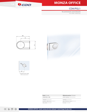 MONZA OFFICE Quality product of CDA/PGL1 Na zamówienie: przeciwkaseta For order: strike box 106 72 70 ∅46 69 Przygotowanie szkła Glass preparation Kod / Code CDA/PGL1 MC Wykończenie / Finish materiał: aluminium material: aluminium grubość szkła (mm): 8; 10; 12 glass thickness (mm): 8; 10; 12 dla zamka: P13E-SET for lock: P13E-SET chrom matowy / matt chrome MONZA OFFICE І Zamki i zawiasy do drzwi szklanych І Locks & hinges for glass door