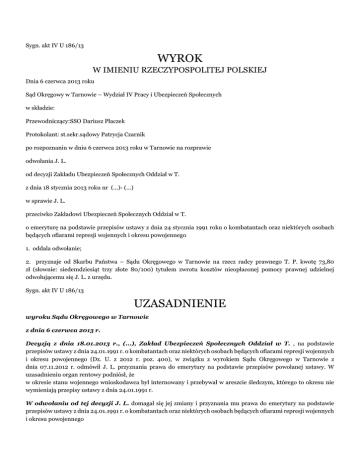 Sygn. akt IV U 186/13 WYROK W IMIENIU RZECZYPOSPOLITEJ POLSKIEJ Dnia 6 czerwca 2013 roku Sąd Okręgowy w Tarnowie – Wydział IV Pracy i Ubezpieczeń Społecznych w składzie: Przewodniczący:SSO Dariusz Płaczek Protokolant: st.sekr.sądowy Patrycja Czarnik po rozpoznaniu w dniu 6 czerwca 2013 roku w Tarnowie na rozprawie odwołania J. L. od decyzji Zakładu Ubezpieczeń Społecznych Oddział w T. z dnia 18 stycznia 2013 roku nr (...)- (...) w sprawie J. L. przeciwko Zakładowi Ubezpieczeń Społecznych Oddział w T. o emeryturę na podstawie przepisów ustawy z dnia 24 stycznia 1991 roku o kombatantach oraz niektórych osobach będących ofiarami represji wojennych i okresu powojennego 1. oddala odwołanie; 2. przyznaje od Skarbu Państwa – Sądu Okręgowego w Tarnowie na rzecz radcy prawnego T. P. kwotę 73,80 zł (słownie: siedemdziesiąt trzy złote 80/100) tytułem zwrotu kosztów nieopłaconej pomocy prawnej udzielnej odwołującemu się J. L. z urzędu. Sygn. akt IV U 186/13 UZASADNIENIE wyroku Sądu Okręgowego w Tarnowie z dnia 6 czerwca 2013 r. Decyzją z dnia 18.01.2013 r., (...), Zakład Ubezpieczeń Społecznych Oddział w T. , na podstawie przepisów ustawy z dnia 24.01.1991 r. o kombatantach oraz niektórych osobach będących ofiarami represji wojennych i okresu powojennego (Dz. U. z 2012 r. poz. 400), w związku z wyrokiem Sądu Okręgowego w Tarnowie z dnia 07.11.2012 r. odmówił J. L. przyznania prawa do emerytury na podstawie przepisów powołanej ustawy. W uzasadnieniu organ rentowy podniósł, że w okresie stanu wojennego wnioskodawca był internowany i przebywał w areszcie śledczym, którego to okresu nie wymieniają przepisy ustawy z dnia 24.01.1991 r. W odwołaniu od tej decyzji J. L. domagał się jej zmiany i przyznania mu prawa do emerytury na podstawie przepisów ustawy z dnia 24.01.1991 r. o kombatantach oraz niektórych osobach będących ofiarami represji wojennych i okresu powojennego (Dz. U. z 2012 r. poz. 400). W odpowiedzi na odwołanie organ rentowy wniósł o jego oddalenie, podtrzymując argumentację zawartą w uzasadnieniu zaskarżonej decyzji. Wskazał też, że ubezpieczony nie spełnia przesłanki określonej dyspozycją art. 14 ust. 3 ustawy z dnia 24.01.1991 r. o kombatantach oraz niektórych osobach będących ofiarami represji wojennych i okresu powojennego, co uniemożliwia przyznanie mu prawa do emerytury w myśl tych przepisów. Okolicznością bezsporną w sprawie było, że J. L. w dniu (...) ukończył 60 lat. W latach 80- tych XX wieku ubezpieczony był związkowcem i należał do (...). W wyniku aresztowania, na podstawie decyzji z dnia 16.12.1981 r., został internowany i przebywał w zakładzie śledczym w (...). Sąd ustalił następujący stan faktyczny sprawy: W dniu 20.08.2008 r. J. L. wystąpił do organu rentowego z wnioskiem o rentę na podstawie przepisów ustawy z dnia 24.01.1991 r. o kombatantach oraz niektórych osobach będących ofiarami represji wojennych i okresu powojennego. Decyzją z dnia 28.01.2009 r. (...) Oddział w N. odmówił wnioskodawcy przyznania prawa do tego świadczenia, podnosząc, że ubezpieczony w myśl przepisów powołanej ustawy nie jest osobą będącą ofiarą represji wojennych i okresu powojennego, która brała udział w wojnie, działaniach zbrojnych czy powstaniach narodowych, wchodząc w skład formacji wojskowych, a ponadto w/w nie został uznany za całkowicie lub częściowo niezdolnego do pracy w związku z działaniami wojennymi. Odwołanie ubezpieczonego od tej decyzji zostało oddalone wyrokiem Sądu Okręgowego w Tarnowie z dnia 28.09.2009 r., sygn. akt IV U 179/09. Sąd Apelacyjny w Krakowie wyrokiem z dnia 14.04.2010 r., sygn. akt III AUa 2288/09, oddalił apelację wnioskodawcy od tego orzeczenia, podzielając zapatrywanie Sądu Okręgowego, że w przypadku ubezpieczonego nie mają zastosowania przepisy ustawy z dnia 24.01.1991 r. o kombatantach oraz niektórych osobach będących ofiarami represji wojennych i okresu powojennego, ponieważ podnoszona przez niego okoliczność aresztowania, a następnie internowania wykracza poza zakres przedmiotowy i podmiotowy ustawy. dowód: • decyzja ZUS z dnia 28.01.2009 r.- k. 24 cz. II akt ZUS, • wyrok SO w Tarnowie z dnia 28.09.2009 r. wraz z uzasadnieniem- k. 75, 81-95 akt IV U 179/09, • wyrok SA w Krakowie z dnia 14.04.2010 r., sygn. akt III AUa 2288/09, wraz z uzasadnieniem- k. 115, 120-128 akt IV U 179/09, W dniu 20.03.2009 J. L. ponownie wystąpił do organu rentowego z wnioskiem o rentę na podstawie przepisów ustawy z dnia 24.01.1991 r. o kombatantach oraz niektórych osobach będących ofiarami represji wojennych i okresu powojennego. Decyzją z dnia 07.04.2009 r. (...) Oddział w N. odmówił wnioskodawcy przyznania prawa do tego świadczenia. W uzasadnieniu, powołując się na prawomocną decyzję z dnia 28.01.2009 r. i przepis art. 114 ust. 1 ustawy z dnia 17.12.1998 r. o emeryturach i rentach z FUS, podniósł, że ubezpieczony nie przedłożył żadnych nowych dowodów i nie ujawniły się też żadne nowe okoliczności, które miałyby wpływ na prawo w/w do renty na podstawie przepisów ustawy z dnia 24.01.1991 r. o kombatantach oraz niektórych osobach będących ofiarami represji wojennych i okresu powojennego. Odwołanie ubezpieczonego od tej decyzji zostało oddalone wyrokiem Sądu Okręgowego w Tarnowie z dnia 15.09.2010 r., sygn. akt IV U 423/09. Sąd Apelacyjny w Krakowie wyrokiem z dnia 15.06.2011 r., sygn. akt III AUa 1794/10, oddalił apelację wnioskodawcy od tego orzeczenia. dowód: • decyzja ZUS z dnia 07.04.2009 r.- k. 25 cz. II akt ZUS, • wyrok SO w Tarnowie z dnia 15.09.2010 r. wraz z uzasadnieniem- k. 40, 46-56 akt IV U 423/09, • wyrok SA w Krakowie z dnia 15.06.2011 r., sygn. akt III AUa 1794/10- k. 92 akt IV U 423/09, Decyzją z dnia 25.05.2012 r. (...) Oddział w T. odmówił ubezpieczonemu przyznania prawa do emerytury w obniżonym wieku emerytalnym na podstawie art. 184 ustaw
