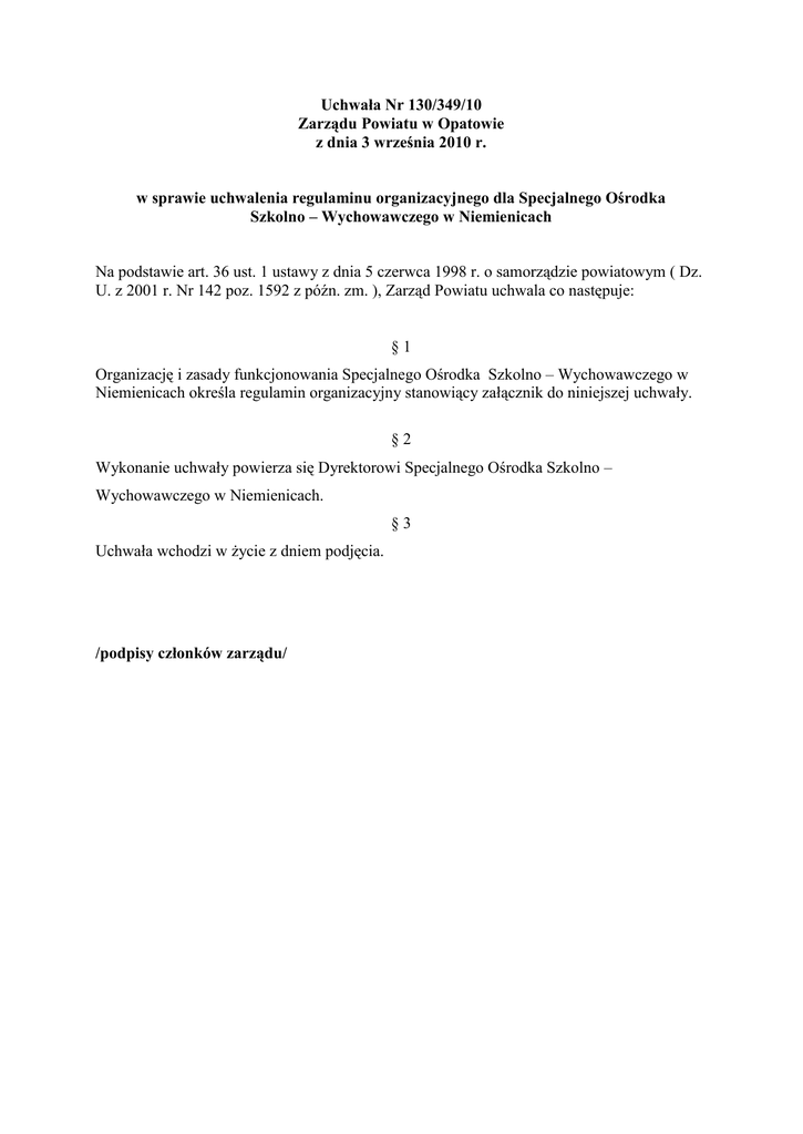 Uchwała Nr 130/349/10 Zarządu Powiatu w Opatowie z dnia 3 września 2010 r. w sprawie uchwalenia regulaminu organizacyjnego dla Specjalnego Ośrodka Szkolno – Wychowawczego w Niemienicach Na podstawie art. 36 ust. 1 ustawy z dnia 5 czerwca 1998 r. o samorządzie powiatowym ( Dz. U. z 2001 r. Nr 142 poz. 1592 z późn. zm. ), Zarząd Powiatu uchwala co następuje: §1 Organizację i zasady funkcjonowania Specjalnego Ośrodka Szkolno – Wychowawczego w Niemienicach określa regulamin organizacyjny stanowiący załącznik do niniejszej uchwały. §2 Wykonanie uchwały powierza się Dyrektorowi Specjalnego Ośrodka Szkolno – Wychowawczego w Niemienicach. §3 Uchwała wchodzi w życie z dniem podjęcia. /podpisy członków zarządu/ UZASADNIENIE Załączony do uchwały regulamin reguluje kwestie dotyczące organizacji pracy w placówkach oświatowych prowadzonych przez Powiat Opatowski zgodnie z art. 36 ust. 1 ustawy z dnia 5 czerwca 1998 r. o samorządzie powiatowym (Dz. U. z 2001 r. Nr 142, poz. 1592 z późn. zm.). Uchwalenie regulaminów związane jest z zaleceniami pokontrolnymi NIK. Opracował: Wydział Oświaty, Kultury, Kultury Fizycznej i Turystyki REGULAMIN ORGANIZACYJNY SPECJALNEGO OŚRODKA SZKOLNO-WYCHOWAWCZEGO W NIEMIENICACH SPIS TREŚCI Rozdział I Postanowienia ogólne Rozdział II Cele i zadania Specjalnego Ośrodka Szkolno-Wychowawczego w Niemienicach Rozdział III Struktura Organizacyjna Specjalnego Ośrodka Szkolno-Wychowawczego w Niemienicach Rozdział IV Gospodarka finansowa Ośrodka Rozdział V Zasady funkcjonowania Ośrodka Rozdział VI Tryb załatwiania spraw, przyjmowania, rozpatrywania skarg i wniosków Rozdział VII System kontroli wewnętrznej i zewnętrznej Rozdział VIII Zasady podpisywania pism Rozdział IX Postanowienia końcowe Rozdział I Postanowienia ogólne § 1. Regulamin Specjalnego Ośrodka Szkolno-Wychowawczego w Niemienicach określa zasady funkcjonowania Ośrodka. § 2. Specjalny Ośrodek Szkolno-Wychowawczy działa na podstawie: 1. Decyzji Kuratorium Oświaty i Wychowania w Tarnobrzegu z dnia 08 czerwca 1981r. 2. Ustawy z dnia 7 września 1991r. o systemie oświaty (Dz.U. z 2004r. Nr 256 poz. 2572 z późn. zm.). 3. Ustawy z dnia 26 stycznia 1982r. – Karta Nauczyciela tekst jednolity (Dz. U. z 2006 r. Nr 97 poz. 674 z pózn. zm.), 4. Kodeks Pracy 5. Statutu . 6. Regulamin Pracy. § 3. 1. Specjalny Ośrodek Szkolno-Wychowawczy w Niemienicach jest jednostką budżetową. 2. Organem prowadzącym jest Powiat Opatowski. 3. Nadzór pedagogiczny sprawuje Kurator Oświaty w Kielcach. § 4. 1. Specjalny Ośrodek Szkolno – Wychowawczy w Niemienicach zwany dalej „Ośrodkiem” wykonuje swoje zadania w oparciu o Statut Ośrodka. 2. Ośrodek jest przeznaczony dla dzieci i młodzieży w wieku od 7 do 24 roku życia z upośledzeniem umysłowym w stopniu umiarkowanym i znacznym oraz z niepełnosprawnościami sprzężonymi. 3. Do Ośrodka przyjmowane są dzieci i młodzież posiadający orzeczenie o potrzebie kształcenia specjalnego wydane przez Poradnię Psychologiczno - Pedagogiczną i skierowane do placówki wydane przez Starostę Powiatu w Opatowie. 4. Ośrodek zapewnia całodobową opiekę dla wychowanków w nim przebywających. 5. Ilość wychowanków przebywających w Ośrodku i związaną z tym organizację zajęć reguluje projekt organizacyjny zatwierdzony przez Starostwo Powiatowe w Opatowie. Rozdział II Cele i zadania Specjalnego Ośrodka Szkolno-Wychowawczego w Niemienicach § 5. Ośrodek realizuje cele edukacyjne, wychowawcze, rewalidacyjne i profilaktyczne. 1. Celem edukacyjnym jest wszechstronny i harmonijny rozwój, podjęcie dalszej nauki na kolejnym etapie edukacyjnym, przygotowanie uczniów do życia w warunkach współczesnego świata. 2. Celem wychowawczym jest wszechstronny rozwój wychowanków oraz przygotowanie do codziennego życia, by mogli funkcjonować w społeczeństwie. Wychowanie ucznia samodzielnego na miarę jego indywidualnych możliwości, aktywnego, potrafiącego dokonywać wyboru właściwych wartości moralnych oraz przygotowanie do pełnienia ról społecznych, przygotowanie do samodzielnego funkcjonowania w środowisku i życiu społecznym. 3.Celem rewalidacyjnym jest korygowanie, kompensowanie i usprawnianie zaburzonych funkcji, stymulowanie rozwoju polisensorycznego uczniów/wychowanków. 4. Celem profilaktycznym jest popularyzacja zdrowego stylu życia, propagowanie różnorodnych, społecznie akceptowanych form spędzania czasu wolnego, przeciwdziałanie wszelkim działaniom występującym zarówno na terenie Ośrodka jak i w środowisku lokalnym. § 6. 1. Głównym zadaniem Specjalnego Ośrodka Szkolno-Wychowawczego w Niemienicach w Niemienicach jest przygotowanie wychowanków na miarę indywidualnych możliwości do funkcjonowania w szerokim środowisku społecznym i przyrodniczym, które realizowane jest poprzez: 1) Zadania dydaktyczno-wychowawcze: a) nauczanie - wychowanie; b) stała współpraca z rodzicami; c) stosowanie różnych metod, form i środków dydaktycznych w celu optymalnego rozwoju wychowanków. 2) Zadania rewalidacyjne: a) usprawnianie najmniej zaburzonych funkcji psychofizycznych; b) kompensowanie i korygowanie odchyleń oraz w miarę możliwości eliminowanie przyczyn lub przejawów uniemożliwiających prawidłowy rozwój i uczenie się. 3) Zadania opiekuńcze: a) całodobowa opieka nad wychowankami; b) dostosowanie bazy materialnej do potrzeb podopiecznych; c) opieka lekarska; d) organizacja zajęć pozalekcyjnych; f) zaspokajanie potrzeb psychicznych wychowanków; g) pomoc w usamodzielnianiu się wychowanków. 4) Organizowanie pomocy uczniom, którym z przyczyn rozwojowych, rodzinnych lub losowych potrzebna jest pomoc i wsparcie (także pomoc materialna - na podstawie obowiązujących przepisów). 5) Współdziałanie z poradniami psychologiczno-pedagogicznymi i innymi instytucjami w celu świadczenia specjalistycznej pomocy dzieciom i rodzicom. 2. Zadania Ośrodka realizowane są z