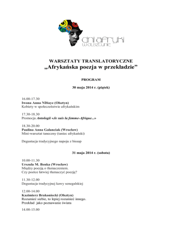 WARSZTATY TRANSLATORYCZNE „Afrykańska poezja w przekładzie” PROGRAM 30 maja 2014 r. (piątek) 16.00-17.30 Iwona Anna NDiaye (Olsztyn) Kobiety w społeczeństwie afrykańskim 17.30-18.30 Promocja Antologii «Je suis la femme-Afrique...» 18.30-20.00 Paulina Anna Galanciak (Wrocław) Mini-warsztat taneczny (taniec afrykański) Degustacja tradycyjnego napoju z bissap 31 maja 2014 r. (sobota) 10.00-11.30 Urszula M. Benka (Wrocław) Między poezją o tłumaczeniem. Czy poetce łatwiej tłumaczyć poezję? 11.30-12.00 Degustacja tradycyjnej kawy senegalskiej 12.00-14.00 Kazimierz Brakoniecki (Olsztyn) Rozumieć siebie, to lepiej rozumieć innego. Przekład jako poznawanie świata 14.00-15.00 Degustacja tradycyjnej kuchni senegalskiej 15.00-16.30 Ewa Kalinowska (Warszawa) Afryka przetłumaczona? Inferencyjna teoria przekładu w praktyce 16.30-17.00 Degustacja tradycyjnej herbaty senegalskiej 17.00-18.30 Ewa Kalinowska (Warszawa) Afryka przetłumaczona? Inferencyjna teoria przekładu w praktyce – c.d. 18.30-19.00 Podsumowanie warsztatu Patronat medialny: INFORMACJE DODATKOWE Miejsce warsztatów Warsztaty odbędą się w siedzibie Centrum Polsko-Francuskiego w Olsztynie, ul. Dąbrowszczaków 39. http://cpf.olsztyn.pl/ Zakwaterowanie Osobom spoza Olsztyna proponujemy skorzystanie z pokoi gościnnych położonych w miasteczku akademickim, http://www.uwm.edu.pl/uniwersytet/mapa-kortowa Ceny pokoi: 1-osobowy – ok. 70-90 zł 2-osobowy - 130 zł 3-osobowy - 150 zł Więcej informacji można znaleźć na stronie http://www.zak.olsztyn.pl/ (zakładka „Pokoje gościnne”). Organizatorzy warsztatów nie gwarantują zakwaterowania, prosimy zatem o dokonywanie rezerwacji osobiście, telefonicznie (im szybciej, tym większa szansa na rezerwację). DS1 tel.: 089-523-33-29 DS3 tel.: 089-523-33-42 DS10 tel.: 089-523-49-85 Przystań Kortowska tel.: 089-523-49-85 Dla osób, które nie zdecydowały się na pokoje gościnne na terenie miasteczka akademickiego, podajemy listę rekomendowanych hoteli w Olsztynie: http://hotelkopernik.com/ http://www.gromada.pl/hotelolsztyn http://www.pncm.olsztyn.pl/ http://www.omegahotel.pl/ http://www.hotel-olsztyn.com.pl/ Hostele: http://hotelrelaks.olsztyn.pl/ http://www.hotelwysokabrama.olsztyn.pl/ Dojazd do Olsztyna Osobom, które planują dotrzeć do Olsztyna komunikacją publiczną, polecamy prywatne linie autobusowe. Kursy odbywają się dość często, w przeciwieństwie do połączeń kolejowych PKP, i zazwyczaj trwają krócej. Przystanki prywatnych przewoźników znajdują się w pobliżu miasteczka akademickiego (Kortowa), gdzie znajdują się pokoje gościnne. Linki do przewoźników: http://www.radex.net.pl/artykul/rozklad-jazdy.html/ http://www.transwal.pl/index.php/ http://www.polskibus.com/