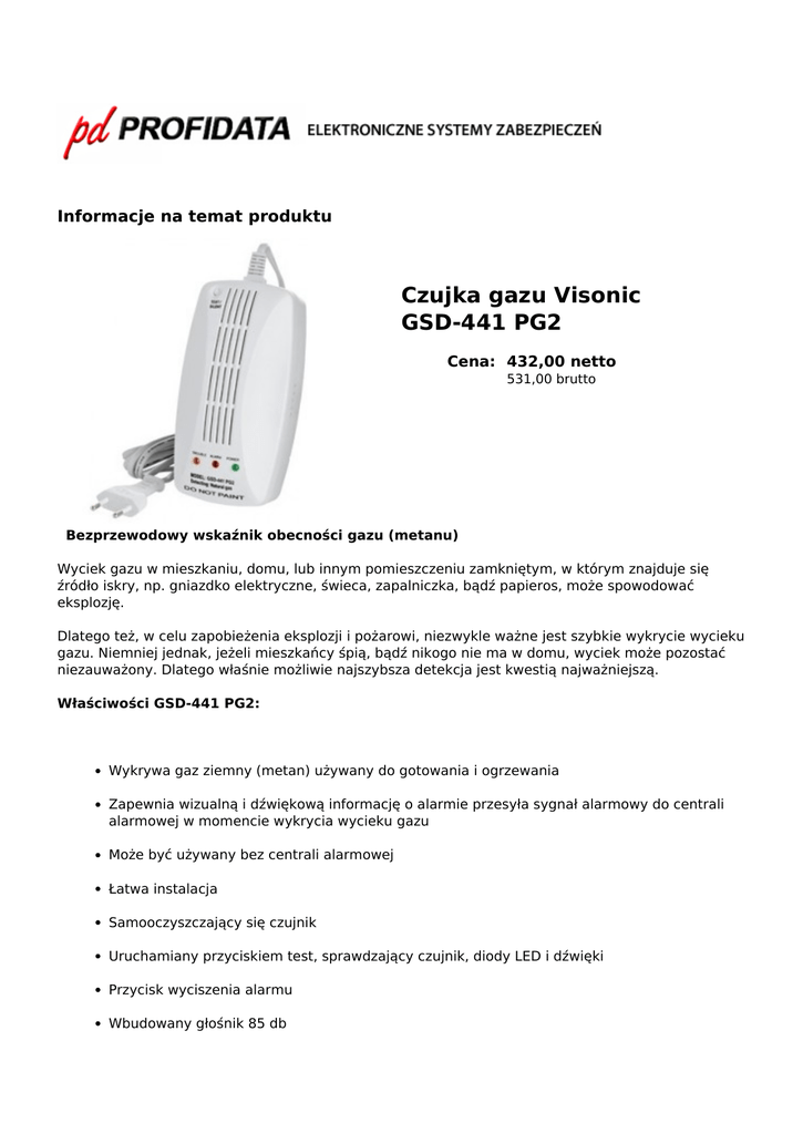 Informacje na temat produktu Czujka gazu Visonic GSD-441 PG2 Cena: 432,00 netto 531,00 brutto Bezprzewodowy wskaźnik obecności gazu (metanu) Wyciek gazu w mieszkaniu, domu, lub innym pomieszczeniu zamkniętym, w którym znajduje się źródło iskry, np. gniazdko elektryczne, świeca, zapalniczka, bądź papieros, może spowodować eksplozję. Dlatego też, w celu zapobieżenia eksplozji i pożarowi, niezwykle ważne jest szybkie wykrycie wycieku gazu. Niemniej jednak, jeżeli mieszkańcy śpią, bądź nikogo nie ma w domu, wyciek może pozostać niezauważony. Dlatego właśnie możliwie najszybsza detekcja jest kwestią najważniejszą. Właściwości GSD-441 PG2: Wykrywa gaz ziemny (metan) używany do gotowania i ogrzewania Zapewnia wizualną i dźwiękową informację o alarmie przesyła sygnał alarmowy do centrali alarmowej w momencie wykrycia wycieku gazu Może być używany bez centrali alarmowej Łatwa instalacja Samooczyszczający się czujnik Uruchamiany przyciskiem test, sprawdzający czujnik, diody LED i dźwięki Przycisk wyciszenia alarmu Wbudowany głośnik 85 db Wysoki poziom detekcji Wewnętrzny akumulator zapewnia transmisję sygnału do centrali alarmowej nawet w przypadku braku zasilania Nowsze wersje centrali PowerMax umożliwiają ustawienie wskaźnika gazu jako osobnej, specjalnej linii Zasilanie 220V AC Więcej produktów na www.profidata.pl PROFIDATA Grzegorz Pniak ul. Klonowa 41a 40-168 Katowice [email protected] Tel: 32 20 62 404 GSM: 509 099 412 fax: 32 20 33 119 NIP: PL634-014-18-08 REGON: 003534943 Nr konta bankowego: 561160 2202 0000 000 11439 9656 Wpis do ewidencji działalności gospodarczej prowadzonej przez Prezydenta Miasta Katowice pod numerem 12532. Powered by TCPDF (www.tcpdf.org)