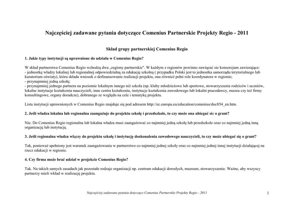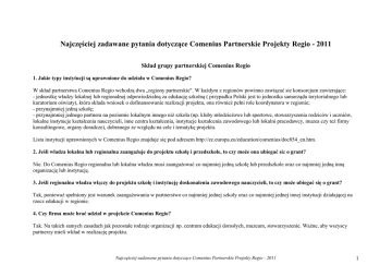 Najczęściej zadawane pytania dotyczące Comenius Partnerskie Projekty Regio - 2011 Skład grupy partnerskiej Comenius Regio 1. Jakie typy instytucji są uprawnione do udziału w Comenius Regio? W skład partnerstwa Comenius Regio wchodzą dwa „regiony partnerskie". W kaŜdym z regionów powinno zawiązać sie konsorcjum zawierające: - jednostkę władzy lokalnej lub regionalnej odpowiedzialną za edukację szkolną ( przypadku Polski jest to jednostka samorządu terytorialnego lub kuratorium oświaty), która składa wniosek o dofinansowanie realizacji projektu, ona równieŜ pełni role koordynatora w regionie; - przynajmniej jedną szkołę; - przynajmniej jednego partnera na poziomie lokalnym innego niŜ szkoła (np. kluby młodzieŜowe lub sportowe, stowarzyszenia rodziców i uczniów, lokalne instytucje kształcenia nauczycieli, inne centra kształcenia, instytucje kształcenia zawodowego lub lokalni pracodawcy, muzea czy teŜ firmy konsultingowe, organy doradcze), dobranego ze względu na cele i tematykę projektu. Lista instytucji uprawnionych w Comenius Regio znajduje się pod adresem http://ec.europa.eu/education/comenius/doc854_en.htm. 2. Jeśli władza lokalna lub regionalna zaangaŜuje do projektu szkołę i przedszkole, to czy moŜe ona ubiegać sie o grant? Nie. Do Comenius Regio regionalna lub lokalna władza musi zaangaŜować co najmniej jedną szkołę lub przedszkole oraz co najmniej jedną inną organizację lub instytucję. 3. Jeśli regionalna władza włączy do projektu szkołę i instytucję doskonalenia zawodowego nauczycieli, to czy moŜe ubiegać się o grant? Tak, poniewaŜ spełniony jest warunek zaangaŜowania w partnerstwo co najmniej jednej szkoły oraz co najmniej jednej innej instytucji działającej na rzecz edukacji w regionie. 4. Czy firma moŜe brać udział w projekcie Comenius Regio? Tak. Na takich samych zasadach jak pozostałe rodzaje organizacji np. centrum edukacji dorosłych, muzeum, stowarzyszenie. WaŜne, aby wszyscy partnerzy mieli wkład w realizację projektu. Najczęściej zadawane pytania dotyczące Comenius Partnerskie Projekty Regio - 2011 1 5. Czy dwie jednostki władzy lokalnej z jednego kraju mogą realizować projekt Comenius Regio? Tak, ale wówczas jedna z nich będzie pełniła rolę instytucji partnerskiej w projekcie. Nie będzie równieŜ traktowana jako inna organizacja czy instytucja (inna oprócz szkoły oraz jednostki władzy lokalnej). Do konsorcjum trzeba będzie dołączyć szkołę oraz inną organizację działającą lokalnie na rzecz edukacji. 6. Gdzie moŜemy dowiedzieć się, które instytucje i władze w innych krajach mogą ubiegać sie o dofinansowanie? Lista wszystkich typów instytucji uprawnionych do uzyskania grantu w ramach Comenius Regio jest opublikowana na stronie internetowej programu Comenius. W razie wątpliwości, instytucja partnerska z innego kraju powinna skontaktować sie ze swoją Narodową Agencją, by upewnić sie czy jest uprawniona. 7. Czy moŜliwe jest bazowanie w projekcie na istniejącej współpracy np. miast partnerskich? Tak. Comenius Regio moŜna łączyć z działaniami realizowanymi w ramach współpracy miast bliźniaczych lub innych europejskich programów edukacyjnych. Jednak projekt Comenius Regio powinien jasno precyzować dodatkowe działania, jak równieŜ poszerzać zakres istniejącej współpracy w dziedzinie edukacji szkolnej. 8. Jak w Comenius Regio definiowany jest „region”? Nie ma sztywnej definicji. Comenius Regio moŜe dotyczyć miast, okręgów miejskich albo większych regionów. W duŜej mierze zaleŜy to od sposobu, w jakim edukacja szkolna jest zorganizowana w kaŜdym kraju partnerskim oraz od tematów i zaplanowanych działań. 9. Co stanie się w przypadku, gdy osoba kontaktowa odpowiedzialna za koordynowanie projektu ze strony władz lokalnych nie będzie mogła sprawować swojej funkcji? Czy koordynację moŜe przejąć dyrektor szkoły, nauczyciel lub przedstawiciel innej instytucji realizującej projekt? Nie. Koordynacją projektu musi zajmować się przedstawiciel władz lokalnych. Ideą Comenius Regio jest, Ŝe władze lokalne koordynują prace projektowe, są zaangaŜowane w realizację i zapewniają upowszechnianie rezultatów projektu. Tak jak mówi opis akcji Comenius Regio z Przewodnika dla wnioskodawców: tylko lokalne lub regionalne władze oświatowe są uprawnione do złoŜenia wniosku i muszą koordynować projekt w regionie. Władze lokalne powinny znaleźć swojego pracownika na miejsce odchodzącego koordynatora. Najczęściej zadawane pytania dotyczące Comenius Partnerskie Projekty Regio - 2011 2 10. Co dzieje się w przypadku gdy jeden z partnerów projektu rezygnuje z udziału w nim i nie są spełnione minimalne wymagania dotyczące składu grupy partnerskiej (np. nie ma w składzie grupy realizującej projekt Ŝadnej innej organizacji – nie będącej szkołą i władzą lokalną)? W najgorszym przypadku projekt nie będzie uprawniony do finansowania. JednakŜe w takiej sytuacji zalecany jest kontakt z Narodową Agencją i wyjaśnienie czy partner, który zrezygnował z udziału w projekcie moŜe być zastąpiony przez inną organizację. Oczywiście cele i działania w projekcie nie mogą ulec zmianie. 11. Dlaczego projekty Comenius Regio są tylko dwustronne? Z przyczyn czysto administracyjnych, poniewaŜ jest to faza początkowa istnienia akcji. Doświadczenia z dwustronnymi partnerstwami pozwolą na zdobycie doświadczeń w administrowaniu nimi i utworzenie projektów wielostronnych za kilka lat. Przygotowanie projektu i procedury aplikacyjne 12. Jak moŜemy znaleźć partnerów do Comenius Regio? MoŜna rozpocząć udział w Comenius Regio korzystając z istniejących kontaktów z innym regionem lub miastem w Europie, z partnerami ze szkolnego projektu Comeniusa oraz Europejskich Sieci czy innych inicjatyw. Na stronie Narodowej Agencji znajdują sie linki do baz słuŜących poszukiwaniu partnerów. 13. Czy moŜemy u