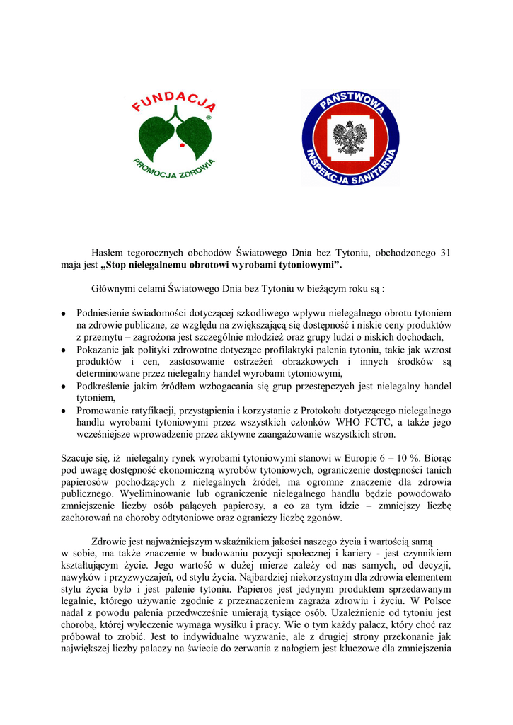 Hasłem tegorocznych obchodów Światowego Dnia bez Tytoniu, obchodzonego 31 maja jest „Stop nielegalnemu obrotowi wyrobami tytoniowymi”. Głównymi celami Światowego Dnia bez Tytoniu w bieżącym roku są : Podniesienie świadomości dotyczącej szkodliwego wpływu nielegalnego obrotu tytoniem na zdrowie publiczne, ze względu na zwiększającą się dostępność i niskie ceny produktów z przemytu – zagrożona jest szczególnie młodzież oraz grupy ludzi o niskich dochodach, Pokazanie jak polityki zdrowotne dotyczące profilaktyki palenia tytoniu, takie jak wzrost produktów i cen, zastosowanie ostrzeżeń obrazkowych i innych środków są determinowane przez nielegalny handel wyrobami tytoniowymi, Podkreślenie jakim źródłem wzbogacania się grup przestępczych jest nielegalny handel tytoniem, Promowanie ratyfikacji, przystąpienia i korzystanie z Protokołu dotyczącego nielegalnego handlu wyrobami tytoniowymi przez wszystkich członków WHO FCTC, a także jego wcześniejsze wprowadzenie przez aktywne zaangażowanie wszystkich stron. Szacuje się, iż nielegalny rynek wyrobami tytoniowymi stanowi w Europie 6 – 10 %. Biorąc pod uwagę dostępność ekonomiczną wyrobów tytoniowych, ograniczenie dostępności tanich papierosów pochodzących z nielegalnych źródeł, ma ogromne znaczenie dla zdrowia publicznego. Wyeliminowanie lub ograniczenie nielegalnego handlu będzie powodowało zmniejszenie liczby osób palących papierosy, a co za tym idzie – zmniejszy liczbę zachorowań na choroby odtytoniowe oraz ograniczy liczbę zgonów. Zdrowie jest najważniejszym wskaźnikiem jakości naszego życia i wartością samą w sobie, ma także znaczenie w budowaniu pozycji społecznej i kariery - jest czynnikiem kształtującym życie. Jego wartość w dużej mierze zależy od nas samych, od decyzji, nawyków i przyzwyczajeń, od stylu życia. Najbardziej niekorzystnym dla zdrowia elementem stylu życia było i jest palenie tytoniu. Papieros jest jedynym produktem sprzedawanym legalnie, którego używanie zgodnie z przeznaczeniem zagraża zdrowiu i życiu. W Polsce nadal z powodu palenia przedwcześnie umierają tysiące osób. Uzależnienie od tytoniu jest chorobą, której wyleczenie wymaga wysiłku i pracy. Wie o tym każdy palacz, który choć raz próbował to zrobić. Jest to indywidualne wyzwanie, ale z drugiej strony przekonanie jak największej liczby palaczy na świecie do zerwania z nałogiem jest kluczowe dla zmniejszenia liczby zgonów związanych z konsumpcją tytoniu, jaka prognozowana jest w ciągu najbliższych 20 lat. Palenie tytoniu to największa indywidualna możliwa do wyeliminowania przyczyna przedwczesnych zgonów w Polsce. Obecnie nie ma już żadnych wątpliwości, co do szkodliwości palenia tytoniu. Poznanie prawdy o skutkach zdrowotnych, społecznych i ekonomicznych używania tytoniu może pomóc wielu ludziom, dać im impuls do zmiany stylu życia i poprawy swego zdrowia, zdrowia rodzin oraz całych społeczności. Pierwsza zasada „Europejskiego Kodeksu Walki z Rakiem” brzmi: 1. Nie pal. Palenie jest najważniejszą przyczyną przedwczesnych zgonów. 2. Jeśli palisz, przestań. Zaprzestanie palenia, zanim się rozwinie nowotwór złośliwy lub inna poważna choroba, znacznie zmniejsza ryzyko zgonu z powodu palenia tytoniu, nawet jeśli palenie rzuci osoba w średnim wieku. 3. Jeśli nie potrafisz przestać palić, nie pal przy niepalących. Skutki zdrowotne Twojego palenia mogą także ponosić osoby z Twojego otoczenia