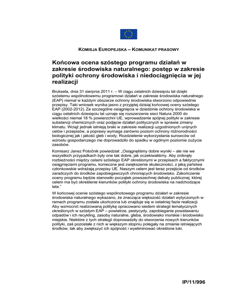KOMISJA EUROPEJSKA – KOMUNIKAT PRASOWY Końcowa ocena szóstego programu działań w zakresie środowiska naturalnego: postęp w zakresie polityki ochrony środowiska i niedociągnięcia w jej realizacji Bruksela, dnia 31 sierpnia 2011 r. – W ciągu ostatnich dziesięciu lat dzięki szóstemu wspólnotowemu programowi działań w zakresie środowiska naturalnego (EAP) niemal w każdym obszarze ochrony środowiska stworzono odpowiednie przepisy. Taki wniosek wynika jasno z przyjętej dzisiaj końcowej oceny szóstego EAP (2002-2012). Za szczególne osiągnięcia w dziedzinie ochrony środowiska w ciągu ostatnich dziesięciu lat uznaje się rozszerzenie sieci Natura 2000 do wielkości niemal 18 % powierzchni UE, wprowadzenie spójnej polityki w zakresie substancji chemicznych oraz podjęcie działań politycznych w sprawie zmiany klimatu. Wciąż jednak istnieją braki w zakresie realizacji uzgodnionych unijnych celów i przepisów, a poprawy wymaga zarówno poziom ochrony różnorodności biologicznej jak i jakość gleb i wody. Rozdzielenie wykorzystania surowców od wzrostu gospodarczego nie doprowadziło do spadku w ogólnym poziomie zużycia zasobów. Komisarz Janez Potočnik powiedział: „Osiągnęliśmy dobre wyniki – ale nie we wszystkich przypadkach były one tak dobre, jak oczekiwaliśmy. Aby zniknęły rozbieżności między celami szóstego EAP określonymi w przepisach a faktycznymi osiągnięciami programu, konieczne jest zwiększenie skuteczności, z jaką państwa członkowskie wdrażają przepisy UE. Naszym celem jest teraz przejście od środków zaradczych do środków zapobiegawczych chroniących środowisko. Zakończenie oceny programu będzie stanowiło początek powszechnej debaty publicznej, której celem ma być określenie kierunków polityki ochrony środowiska na nadchodzące lata.” W końcowej ocenie szóstego wspólnotowego programu działań w zakresie środowiska naturalnego wykazano, że znacząca większość działań wytyczonych w ramach programu została ukończona lub znajduje się w ostatniej fazie realizacji. Aby wzmocnić realizowaną politykę opracowano siedem strategii tematycznych określonych w szóstym EAP – powietrze, pestycydy, zapobieganie powstawaniu odpadów i ich recykling, zasoby naturalne, gleba, środowisko morskie i środowisko miejskie. Niektóre z tych strategii doprowadziły do stworzenia nowych kierunków polityki, zaś pozostałe z nich w większym stopniu polegały na zmianie istniejących środków, tak aby zwiększyć ich spójność i wyeliminować określone luki. IP/11/996 W ramach programu udało się stworzyć pełne ramy dla polityki ochrony środowiska. Posłużyły one państwom członkowskim i władzom lokalnym za punkt odniesienia w walce o obronę polityki ochrony środowiska przed zakusami konkurencyjnych obszarów polityki, w zabezpieczeniu odpowiednich funduszy na finansowanie oraz tworzeniu przewidywalnego środowiska dla biznesu. Program ten przyczynił się także do budowy woli politycznej, aby przyjąć efektywne cele i harmonogramy, a następnie wprowadzić je w życie. Nie udało się udowodnić, że to właśnie szósty EAP był głównym czynnikiem sprawczym, dzięki któremu w ciągu ostatnich dziesięciu lat przyjęto przepisy o ochronie środowiska. Wynika to po części z charakteru samego programu, który obejmuje ogromną liczbę działań różniących się zakresem i skalą. W odczuciu zainteresowanych stron zatwierdzenie programu w 2002 r. przez Radę i Parlament Europejski w ramach procedury współdecyzji zwiększyło zasadność ich działań i przyczyniło się do stworzenia szerszego poczucia własności w odniesieniu do wniosków dotyczących kierunków polityki. Jako czynnik spowalniający wskazano także wyraźnie niewłaściwe realizowanie i egzekwowanie unijnych przepisów o ochronie środowiska przez państwa członkowskie. Kolejne kroki Choć dobiega końca ostatni rok realizacji szóstego EAP, Komisja nadal będzie realizować ambitną politykę ochrony środowiska, która stanowi obecnie nieodłączny element strategii „Europa 2020” na rzecz zatrudnienia i inteligentnego, trwałego wzrostu gospodarczego sprzyjającego włączeniu społecznemu. W tym kontekście Komisja wkrótce przedstawi mapę drogową dotyczącą efektywnej gospodarki zasobami z myślą o realizacji do 2050 r. projektu „Europa efektywnie korzystająca z zasobów”. Przedstawiona w dniu dzisiejszym ocena kładzie fundament pod dalszy dialog między Komisją, Radą, Parlamentem, społeczeństwem obywatelskim i sektorem biznesu. Celem jest osiągnięcie porozumienia co do strategicznych kierunków polityki ochrony środowiska, tak aby w proces ten zaangażować jak najszersze grono i aby wytworzyć atmosferę mobilizacji do pracy. W tym kontekście Komisja będzie się zastanawiać w jaki sposób nowy program działań w zakresie środowiska naturalnego może w najskuteczniejszy sposób zapewnić wartość dodaną w dynamicznie ewoluującym obszarze polityki ochrony środowiska. 2 Szerszy kontekst Szósty wspólnotowy program działań w zakresie środowiska naturalnego przyjęto decyzją Parlamentu Europejskiego i Rady w dniu 22 lipca 2002 r. W decyzji tej określono strategiczne ramy dla kierunków polityki ochrony środowiska w Unii Europejskiej na lata 2002-2012. Programy działań w zakresie środowiska naturalnego wyznaczają kierunki rozwoju unijnej polityki ochrony środowiska od wczesnych lat siedemdziesiątych w związku z czym szósty EAP należy postrzegać jako część 40-letniego procesu. Szósty EAP był pierwszym programem działań w zakresie ochrony środowiska, który został przyjęty przez Radę i Parlament Europejski w ramach procedury współdecyzji. Szczegółowe i wyczerpujące informacje na temat treści komunikatu oraz samego procesu końcowej oceny znaleźć można pod adresem: http://ec.europa.eu/environment/newprg/final.htm Kontakt: Joe Hennon (+32 2 295 35 93) Mon