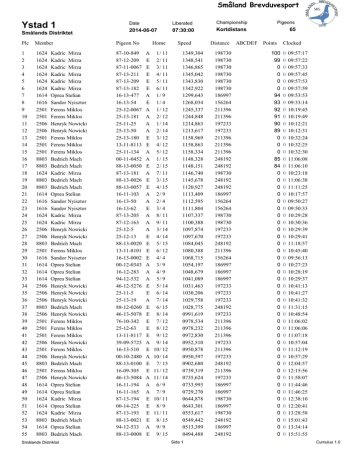 Småland Brevduvesport Ystad 1 Smålands Distriktet Date Liberated Championship Pigeons 2014-06-07 07:30:00 Kortdistans 65 Plc Member Pigeon No 1 2 3 4 5 6 7 8 9 10 11 12 13 14 15 16 17 18 19 20 21 22 23 24 25 26 27 28 29 30 31 32 33 34 35 36 37 38 39 40 41 42 43 44 45 46 47 48 49 50 51 52 53 54 55 1624 1624 1624 1624 1624 1624 1614 1616 2501 2501 2506 2506 2501 2501 2501 8803 8803 1624 8803 8803 1614 1616 1616 1624 1624 2506 2506 8803 2501 1616 1614 1614 1614 2506 2506 2506 8803 2506 2501 2501 2501 2506 2501 2506 8803 2501 2506 1614 1614 1624 1614 1624 8803 1614 8803 87-10-849 87-12-209 87-11-0067 87-13-211 87-13-209 87-13-182 16-13-477 16-13-54 25-12-0067 25-13-181 25-11-25 25-13-50 25-13-180 13-11-8113 25-11-134 00-11-0452 88-13-0050 87-13-181 88-13-0026 88-13-0057 16-11-103 16-13-50 16-13-62 87-13-205 87-12-163 25-12-5 25-12-13 88-13-0020 13-11-8101 16-13-0002 00-12-0343 16-12-283 94-12-532 46-12-5276 25-11-5 25-13-19 88-12-0260 46-13-5078 76-10-342 25-12-63 13-11-8117 39-09-5725 16-13-510 00-10-2480 88-13-0100 16-09-305 46-13-5084 16-11-194 16-11-165 87-13-194 00-14-225 87-13-193 88-13-0021 94-12-533 88-13-0008 Kadric Mirza Kadric Mirza Kadric Mirza Kadric Mirza Kadric Mirza Kadric Mirza Oprea Stelian Sandor Nyisztor Ferens Miklos Ferens Miklos Henryk Nowicki Henryk Nowicki Ferens Miklos Ferens Miklos Ferens Miklos Bedrich Mach Bedrich Mach Kadric Mirza Bedrich Mach Bedrich Mach Oprea Stelian Sandor Nyisztor Sandor Nyisztor Kadric Mirza Kadric Mirza Henryk Nowicki Henryk Nowicki Bedrich Mach Ferens Miklos Sandor Nyisztor Oprea Stelian Oprea Stelian Oprea Stelian Henryk Nowicki Henryk Nowicki Henryk Nowicki Bedrich Mach Henryk Nowicki Ferens Miklos Ferens Miklos Ferens Miklos Henryk Nowicki Ferens Miklos Henryk Nowicki Bedrich Mach Ferens Miklos Henryk Nowicki Oprea Stelian Oprea Stelian Kadric Mirza Oprea Stelian Kadric Mirza Bedrich Mach Oprea Stelian Bedrich Mach Smålands Distriktet Home A E E E E E A E A A A A E E A A E A E E A A E A A A E E E E A A A E E A E E E E E A E A E E A A A E E E E A E 1 / 11 2 / 11 3 / 11 4 / 11 5 / 11 6 / 11 1/ 9 1/ 4 1 / 12 2 / 12 1 / 14 2 / 14 3 / 12 4 / 12 5 / 12 1 / 15 2 / 15 7 / 11 3 / 15 4 / 15 2/ 9 2/ 4 3/ 4 8 / 11 9 / 11 3 / 14 4 / 14 5 / 15 6 / 12 4/ 4 3/ 9 4/ 9 5/ 9 5 / 14 6 / 14 7 / 14 6 / 15 8 / 14 7 / 12 8 / 12 9 / 12 9 / 14 10 / 12 10 / 14 7 / 15 11 / 12 11 / 14 6/ 9 7/ 9 10 / 11 8/ 9 11 / 11 8 / 15 9/ 9 9 / 15 Speed 1349,304 1348,541 1346,865 1345,042 1343,830 1342,922 1299,643 1268,034 1245,337 1244,848 1214,863 1213,617 1158,969 1158,863 1158,334 1148,328 1148,151 1146,740 1145,678 1120,927 1113,409 1112,595 1111,804 1107,337 1100,388 1097,874 1097,670 1084,045 1080,388 1068,715 1054,197 1048,679 1041,089 1031,463 1030,206 1029,758 1028,775 0991,619 0978,534 0978,232 0972,830 0952,510 0950,878 0950,597 0902,680 0739,319 0735,624 0733,993 0729,270 0644,878 0643,301 0553,617 0549,442 0513,399 0494,488 Sida 1 Distance 198730 198730 198730 198730 198730 198730 186997 156264 211396 211396 197233 197233 211396 211396 211396 248192 248192 198730 248192 248192 186997 156264 156264 198730 198730 197233 197233 248192 211396 156264 186997 186997 186997 197233 197233 197233 248192 197233 211396 211396 211396 197233 211396 197233 248192 211396 197233 186997 186997 198730 186997 198730 248192 186997 248192 ABCDE F Points 100 99 0 0 0 0 94 93 92 91 90 89 0 0 0 85 84 0 0 0 0 0 0 0 0 0 0 0 0 0 0 0 0 0 0 0 0 0 0 0 0 0 0 0 0 0 0 0 0 0 0 0 0 0 0 Clocked 0 0 0 0 0 0 0 0 0 0 0 0 0 0 0 0 0 0 0 0 0 0 0 0 0 0 0 0 0 0 0 0 0 0 0 0 0 0 0 0 0 0 0 0 0 0 0 0 0 0 0 0 0 0 0 09:57:17 09:57:22 09:57:33 09:57:45 09:57:53 09:57:59 09:53:53 09:33:14 10:19:45 10:19:49 10:12:21 10:12:31 10:32:24 10:32:25 10:32:30 11:06:08 11:06:10 10:23:18 11:06:38 11:11:25 10:17:57 09:50:27 09:50:33 10:29:28 10:30:36 10:29:39 10:29:41 11:18:57 10:45:40 09:56:13 10:27:23 10:28:19 10:29:37 10:41:13 10:41:27 10:41:32 11:31:15 10:48:54 11:06:02 11:06:06 11:07:18 10:57:04 11:12:19 10:57:29 12:04:57 12:15:56 11:58:07 11:44:46 11:46:25 12:38:10 12:20:41 13:28:58 15:01:43 13:34:14 15:51:55 Cumulus 1.0 Småland Brevduvesport Plc Member Pigeon No 56 57 2506 Henryk Nowicki 8803 Bedrich Mach 0-13-3069 A 12 / 14 88-13-0061 E 10 / 15 Smålands Distriktet Home Speed 0420,256 0404,727 Sida 2 Distance 197233 248192 ABCDE F Points Clocked 0 0 15:19:19 0 0 17:43:14 Cumulus 1.0