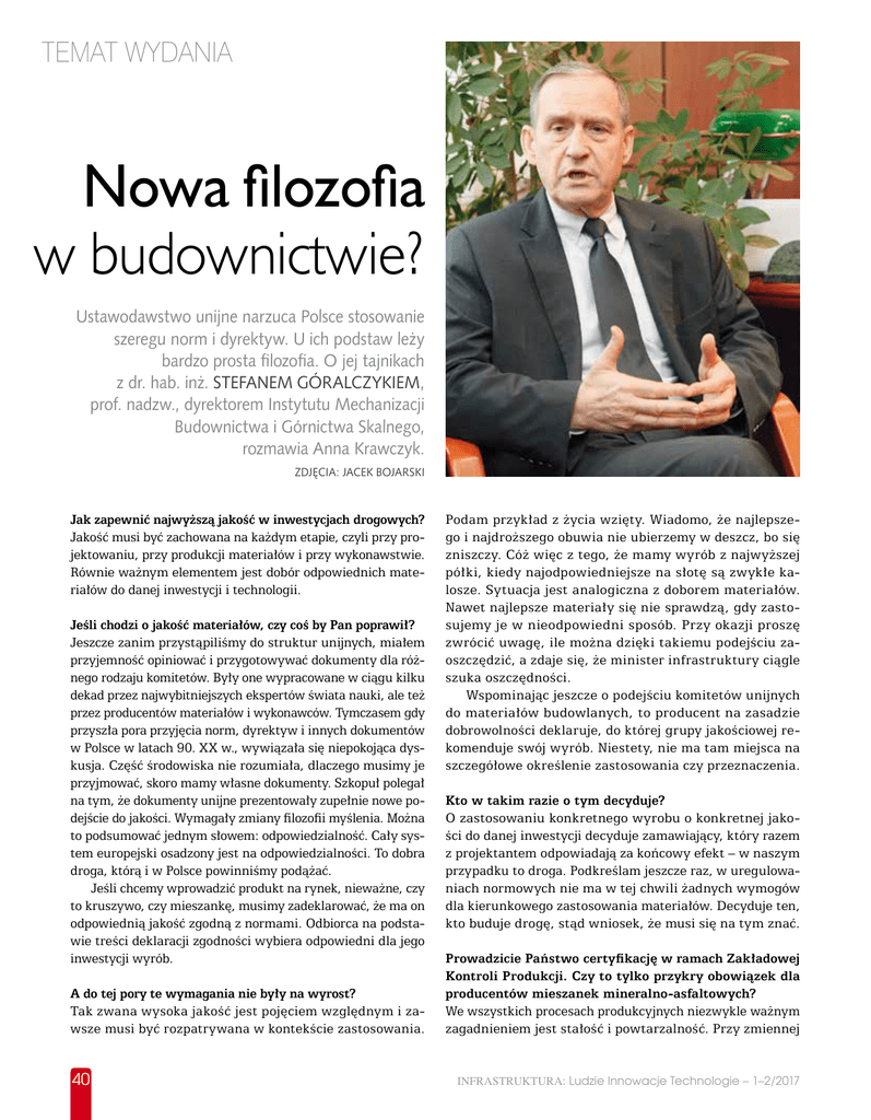 TEMAT WYDANIA Nowa filozofia w budownictwie? Ustawodawstwo unijne narzuca Polsce stosowanie szeregu norm i dyrektyw. U ich podstaw leży bardzo prosta filozofia. O jej tajnikach z dr. hab. inż. Stefanem Góralczykiem, prof. nadzw., dyrektorem Instytutu Mechanizacji Budownictwa i Górnictwa Skalnego, rozmawia Anna Krawczyk. Zdjęcia: Jacek Bojarski Jak zapewnić najwyższą jakość w inwestycjach drogowych? Jakość musi być zachowana na każdym etapie, czyli przy projektowaniu, przy produkcji materiałów i przy wykonawstwie. Równie ważnym elementem jest dobór odpowiednich materiałów do danej inwestycji i technologii. Jeśli chodzi o jakość materiałów, czy coś by Pan poprawił? Jeszcze zanim przystąpiliśmy do struktur unijnych, miałem przyjemność opiniować i przygotowywać dokumenty dla różnego rodzaju komitetów. Były one wypracowane w ciągu kilku dekad przez najwybitniejszych ekspertów świata nauki, ale też przez producentów materiałów i wykonawców. Tymczasem gdy przyszła pora przyjęcia norm, dyrektyw i innych dokumentów w Polsce w latach 90. XX w., wywiązała się niepokojąca dyskusja. Część środowiska nie rozumiała, dlaczego musimy je przyjmować, skoro mamy własne dokumenty. Szkopuł polegał na tym, że dokumenty unijne prezentowały zupełnie nowe podejście do jakości. Wymagały zmiany filozofii myślenia. Można to podsumować jednym słowem: odpowiedzialność. Cały system europejski osadzony jest na odpowiedzialności. To dobra droga, którą i w Polsce powinniśmy podążać. Jeśli chcemy wprowadzić produkt na rynek, nieważne, czy to kruszywo, czy mieszankę, musimy zadeklarować, że ma on odpowiednią jakość zgodną z normami. Odbiorca na podstawie treści deklaracji zgodności wybiera odpowiedni dla jego inwestycji wyrób. A do tej pory te wymagania nie były na wyrost? Tak zwana wysoka jakość jest pojęciem względnym i zawsze musi być rozpatrywana w kontekście zastosowania. 40 Podam przykład z życia wzięty. Wiadomo, że najlepszego i najdroższego obuwia nie ubierzemy w deszcz, bo się zniszczy. Cóż więc z tego, że mamy wyrób z najwyższej półki, kiedy najodpowiedniejsze na słotę są zwykłe kalosze. Sytuacja jest analogiczna z doborem materiałów. Nawet najlepsze materiały się nie sprawdzą, gdy zastosujemy je w nieodpowiedni sposób. Przy okazji proszę zwrócić uwagę, ile można dzięki takiemu podejściu zaoszczędzić, a zdaje się, że minister infrastruktury ciągle szuka oszczędności. Wspominając jeszcze o podejściu komitetów unijnych do materiałów budowlanych, to producent na zasadzie dobrowolności deklaruje, do której grupy jakościowej rekomenduje swój wyrób. Niestety, nie ma tam miejsca na szczegółowe określenie zastosowania czy przeznaczenia. Kto w takim razie o tym decyduje? O zastosowaniu konkretnego wyrobu o konkretnej jakości do danej inwestycji decyduje zamawiający, który razem z projektantem odpowiadają za końcowy efekt – w naszym przypadku to droga. Podkreślam jeszcze raz, w uregulowaniach normowych nie ma w tej chwili żadnych wymogów dla kierunkowego zastosowania materiałów. Decyduje ten, kto buduje drogę, stąd wniosek, że musi się na tym znać. Prowadzicie Państwo certyfikację w ramach Zakładowej Kontroli Produkcji. Czy to tylko przykry obowiązek dla producentów mieszanek mineralno-asfaltowych? We wszystkich procesach produkcyjnych niezwykle ważnym zagadnieniem jest stałość i powtarzalność. Przy zmiennej INFRASTRUKTURA: Ludzie Innowacje Technologie – 1–2/2017 jakości surowców nie jest to rzeczą łatwą. W związku z tym normy mają widełki, pewien rozrzut, gwarantujący bezpieczne użycie produktu. System ZKP przez zastosowanie odpowiednich procedur ma więc służyć stałości produkcji. Niestety, nasi audytorzy nie sprawdzają wszystkich surowców. Część badań dostarczają sami producenci surowców, a my przyjmujemy je na wiarę. Przy czym niektórzy producenci materiałów budowlanych szerokim łukiem omijają polskie instytuty i przeprowadzają certyfikację w krajach ościennych. Nie jest tajemnicą, że jest tam łatwiej i taniej uzyskać znak CE. PCA przygląda się zjawisku, ale ma związane ręce. Apeluję więc zarówno do producentów mieszanek, jak i audytorów, aby bardziej się przyglądać przedstawianym wynikom badań. Badane parametry chemiczne, fizyczne czy mechaniczne powinny być kompatybilne ze sobą. Przykładowo, wytrzymałość na ściskanie i zginanie powinna być mierzona razem. Znak CE jest potwierdzeniem uzyskania pozytywnych badań i efektem audytu. Nie wypaczajmy tego procesu. rzenia bardzo lekkich izolacyjnych elementów betonowych, a skończywszy właśnie na jasnych nawierzchniach. Głównym surowcem służącym do produkcji kruszywa jest to, co obecnie najbardziej uciążliwe, czyli osady ściekowe. Zawierają one znaczne ilości substancji organicznych. Jako ciekawostkę powiem, że wiele firm po odmineralizowaniu stosuje odpady ściekowe jako paliwo, bo jego kaloryczność jest porównywalna do węgla. Z jednej strony utrzymywanie wysokiej temperatury, a z drugiej strony gazy powodują, że otrzymany materiał jest porowaty. Stąd właśnie wysoki parametr PSV. Ponadto kruszywo jest lekkie, może więc zastąpić keramzyt. Możemy uzyskać bardzo małe ziarna 0,6–0,8 gr/cm3, nadające się do izolacji. Czy istnieje jeden, czy kilka rodzajów Państwa kruszywa? Technologię produkcji dostosowujemy do oczekiwań klienta. Zmieniając proporcję składników, możemy otrzymać więc oczekiwany produkt. Kolor, jasność, gęstość dostosowujemy do potrzebnych zastosowań. Generalny Dyrektor Dróg Krajowych i Autostrad zapowiedział wprowadzenie do przetargów kryterium szorstkości nawierzchni. Czy Pana zdaniem to dobry pomysł? To podstawowy czynnik bezpieczeństwa. Przy czym istnieje kilka metod badawczych tego parametru. Na dokładność pomiaru wpływa też szereg elementów. Potrzebujemy je