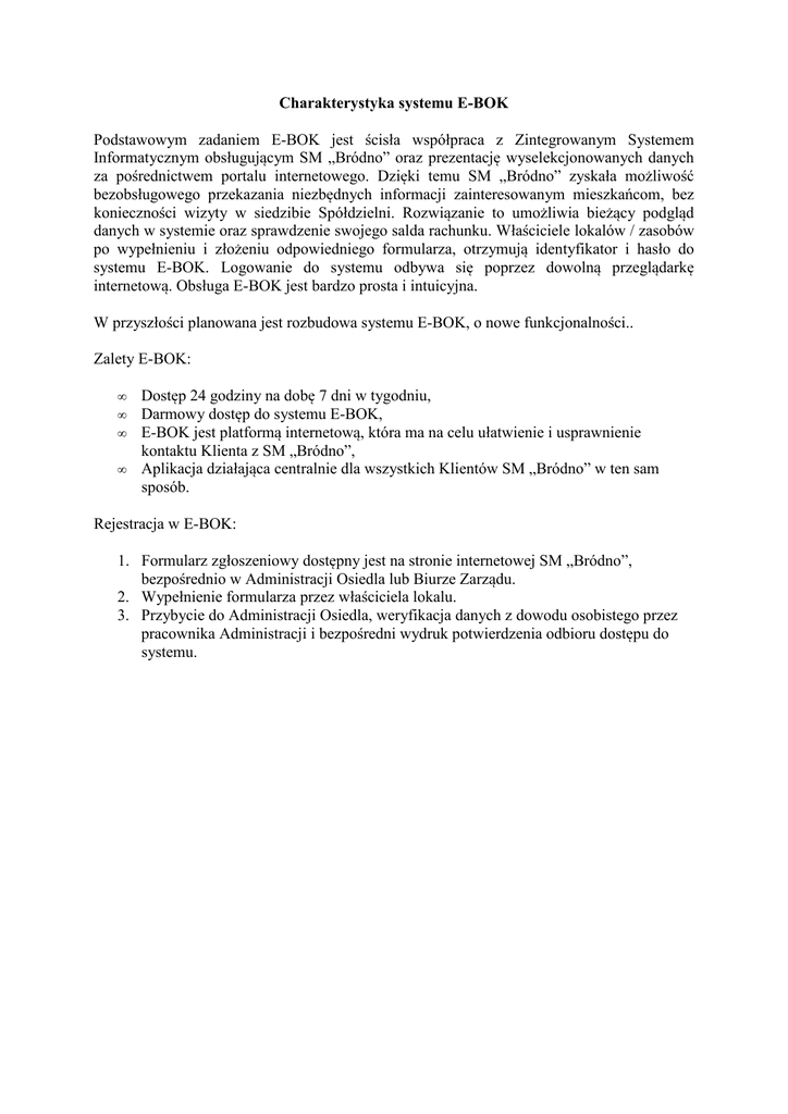 Charakterystyka systemu E-BOK Podstawowym zadaniem E-BOK jest ścisła współpraca z Zintegrowanym Systemem Informatycznym obsługującym SM „Bródno” oraz prezentację wyselekcjonowanych danych za pośrednictwem portalu internetowego. Dzięki temu SM „Bródno” zyskała możliwość bezobsługowego przekazania niezbędnych informacji zainteresowanym mieszkańcom, bez konieczności wizyty w siedzibie Spółdzielni. Rozwiązanie to umożliwia bieżący podgląd danych w systemie oraz sprawdzenie swojego salda rachunku. Właściciele lokalów / zasobów po wypełnieniu i złożeniu odpowiedniego formularza, otrzymują identyfikator i hasło do systemu E-BOK. Logowanie do systemu odbywa się poprzez dowolną przeglądarkę internetową. Obsługa E-BOK jest bardzo prosta i intuicyjna. W przyszłości planowana jest rozbudowa systemu E-BOK, o nowe funkcjonalności.. Zalety E-BOK: • • • • Dostęp 24 godziny na dobę 7 dni w tygodniu, Darmowy dostęp do systemu E-BOK, E-BOK jest platformą internetową, która ma na celu ułatwienie i usprawnienie kontaktu Klienta z SM „Bródno”, Aplikacja działająca centralnie dla wszystkich Klientów SM „Bródno” w ten sam sposób. Rejestracja w E-BOK: 1. Formularz zgłoszeniowy dostępny jest na stronie internetowej SM „Bródno”, bezpośrednio w Administracji Osiedla lub Biurze Zarządu. 2. Wypełnienie formularza przez właściciela lokalu. 3. Przybycie do Administracji Osiedla, weryfikacja danych z dowodu osobistego przez pracownika Administracji i bezpośredni wydruk potwierdzenia odbioru dostępu do systemu.