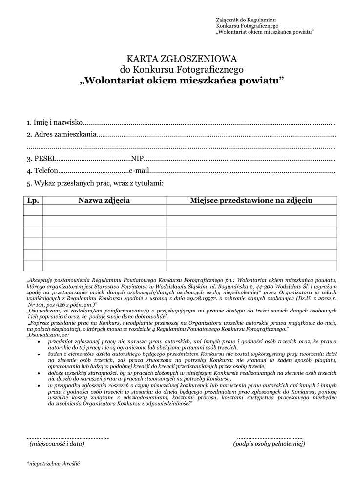 Załącznik do Regulaminu Konkursu Fotograficznego „Wolontariat okiem mieszkańca powiatu” KARTA ZGŁOSZENIOWA do Konkursu Fotograficznego „Wolontariat okiem mieszkańca powiatu” 1. Imię i nazwisko…………………………………………………………………………………………………………………… 2. Adres zamieszkania…………………………………………………………………………………………………………….. …………………………………………………………………………………………………………………………………………….. 3. PESEL…………………………………NIP………………………………………………………………………………………. 4. Telefon……………………………….e-mail……………………………………………………………………………………. 5. Wykaz przesłanych prac, wraz z tytułami: Lp. Nazwa zdjęcia Miejsce przedstawione na zdjęciu „Akceptuję postanowienia Regulaminu Powiatowego Konkursu Fotograficznego pn.: Wolontariat okiem mieszkańca powiatu, którego organizatorem jest Starostwo Powiatowe w Wodzisławiu Śląskim, ul. Bogumińska 2, 44-300 Wodzisław Śl. i wyrażam zgodę na przetwarzanie moich danych osobowych/danych osobowych osoby niepełnoletniej* przez Organizatora w celach wynikających z Regulaminu Konkursu zgodnie z ustawą z dnia 29.08.1997r. o ochronie danych osobowych (Dz.U. z 2002 r. Nr 101, poz 926 z późn. zm.)” „Oświadczam, że zostałam/em poinformowana/y o przysługującym mi prawie dostępu do treści swoich danych osobowych i ich poprawieni oraz, że podaję swoje dane dobrowolnie”. „Poprzez przesłanie prac na Konkurs, nieodpłatnie przenoszę na Organizatora wszelkie autorskie prawa majątkowe do nich, na polach eksploatacji, o których mowa w rozdziale 4 Regulaminu Powiatowego Konkursu Fotograficznego.” „Oświadczam, że: przedmiot zgłoszonej pracy nie narusza praw autorskich, ani innych praw i godności osób trzecich oraz, że prawa autorskie do tej pracy nie są ograniczone lub obciążone prawami osób trzecich, żaden z elementów dzieła autorskiego będącego przedmiotem Konkursu nie został wykorzystany przy tworzeniu dzieł na zlecenie osób trzecich, zaś praca stworzona na potrzeby Konkursu nie stanowi w żaden sposób plagiatu, opracowania lub łudząco podobnej kreacji do kreacji przedstawianych przez osoby trzecie, dołożę wszelkiej staranności, by w pracach złożonych w niniejszym Konkursie realizowanych na zlecenie osób trzecich nie doszło do naruszeń praw w pracach stworzonych na potrzeby Konkursu, w przypadku zgłoszenia roszczeń o czyny nieuczciwej konkurencji lub naruszenia praw autorskich ani innych i innych praw i godności osób trzecich w stosunku do dzieła będącego przedmiotem prac zgłoszonych do Konkursu, poniosę wszelkie koszty związane z odszkodowaniami, kosztami procesu, kosztami zastępstwa procesowego niezbędne do zwolnienia Organizatora Konkursu z odpowiedzialności” ……………………………………………. (miejscowość i data) *niepotrzebne skreślić ………………………………….. (podpis osoby pełnoletniej)