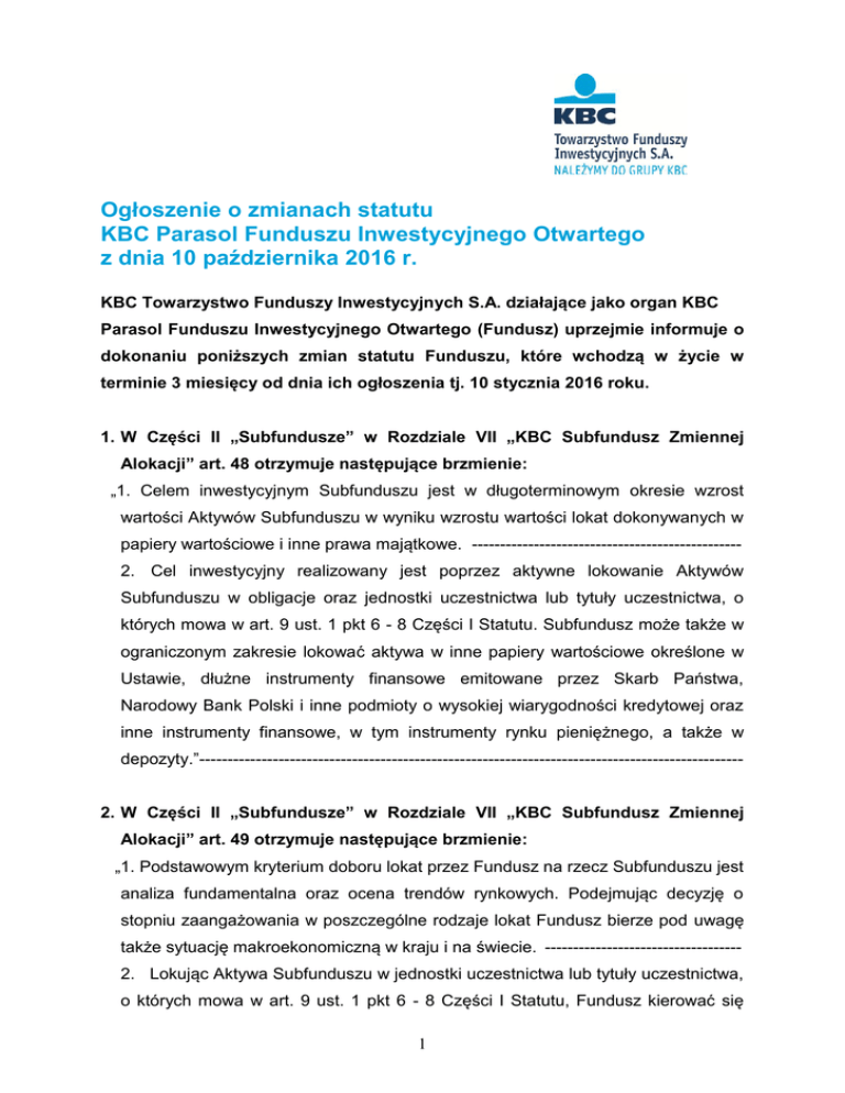 Ogłoszenie o zmianach statutu KBC Parasol Funduszu Inwestycyjnego Otwartego z dnia 10 października 2016 r. KBC Towarzystwo Funduszy Inwestycyjnych S.A. działające jako organ KBC Parasol Funduszu Inwestycyjnego Otwartego (Fundusz) uprzejmie informuje o dokonaniu poniższych zmian statutu Funduszu, które wchodzą w życie w terminie 3 miesięcy od dnia ich ogłoszenia tj. 10 stycznia 2016 roku. 1. W Części II „Subfundusze” w Rozdziale VII „KBC Subfundusz Zmiennej Alokacji” art. 48 otrzymuje następujące brzmienie: „1. Celem inwestycyjnym Subfunduszu jest w długoterminowym okresie wzrost wartości Aktywów Subfunduszu w wyniku wzrostu wartości lokat dokonywanych w papiery wartościowe i inne prawa majątkowe. -----------------------------------------------2. Cel inwestycyjny realizowany jest poprzez aktywne lokowanie Aktywów Subfunduszu w obligacje oraz jednostki uczestnictwa lub tytuły uczestnictwa, o których mowa w art. 9 ust. 1 pkt 6 - 8 Części I Statutu. Subfundusz może także w ograniczonym zakresie lokować aktywa w inne papiery wartościowe określone w Ustawie, dłużne instrumenty finansowe emitowane przez Skarb Państwa, Narodowy Bank Polski i inne podmioty o wysokiej wiarygodności kredytowej oraz inne instrumenty finansowe, w tym instrumenty rynku pieniężnego, a także w depozyty.”-----------------------------------------------------------------------------------------------2. W Części II „Subfundusze” w Rozdziale VII „KBC Subfundusz Zmiennej Alokacji” art. 49 otrzymuje następujące brzmienie: „1. Podstawowym kryterium doboru lokat przez Fundusz na rzecz Subfunduszu jest analiza fundamentalna oraz ocena trendów rynkowych. Podejmując decyzję o stopniu zaangażowania w poszczególne rodzaje lokat Fundusz bierze pod uwagę także sytuację makroekonomiczną w kraju i na świecie. ----------------------------------2. Lokując Aktywa Subfunduszu w jednostki uczestnictwa lub tytuły uczestnictwa, o których mowa w art. 9 ust. 1 pkt 6 - 8 Części I Statutu, Fundusz kierować się 1 będzie zasadami polityki inwestycyjnej danego funduszu lub instytucji wspólnego inwestowania, a także oczekiwaną stopą zwrotu oraz ryzykiem związanym z tymi jednostkami lub tytułami uczestnictwa. Lokowanie Aktywów Subfunduszu w certyfikaty inwestycyjne oraz papiery wartościowe emitowane przez instytucje wspólnego inwestowania typu zamkniętego może nastąpić w przypadku gdy zostaną spełnione kryteria, o których mowa w art. 93 ust. 4 i 6 Ustawy. --------------3. Lokując Aktywa Subfunduszu w dłużne papiery wartościowe lub instrumenty rynku pieniężnego emitowane przez Skarb Państwa, Narodowy Bank Polski i inne podmioty o wysokiej wiarygodności kredytowej, Fundusz będzie się kierować wyborem tych spośród nich, które zapewniają konkurencyjną rentowność przy uwzględnieniu terminu ich zapadalności. ------------------------------------------------------4. Lokując Aktywa Subfunduszu w pozostałe dłużne papiery wartościowe lub instrumenty rynku pieniężnego Fundusz kierować sie będzie kryteriami wskazanymi w ust. 3, a także następującymi kryteriami: kryterium oczekiwanej stopy zwrotu, wielkości ryzyka kredytowego związanego z tymi papierami wartościowymi lub instrumentami oraz ich emitentami mierzonego zgodnie z wewnętrznie opracowanym systemem oceny ryzyka kredytowego instrumentów finansowych i ich emitentów, uwzględniającym ratingi wyspecjalizowanych agencji ratingowych uznanych na międzynarodowym rynku kapitałowym, a także relacją pomiędzy oczekiwaną stopą zwrotu a wielkością ryzyka inwestycji w te papiery wartościowe lub instrumenty, czasem trwania inwestycji w te papiery wartościowe lub instrumenty oraz stopniem płynności tych papierów lub instrumentów.-----------5. W przypadku lokat wskazanych w art. 10 Części I Statutu głównym kryterium doboru lokat będzie kryterium stopnia korelacji tych lokat z głównymi kategoriami lokat, o których mowa w ust. 2. – 3. powyżej. W związku z powyższym, podstawowym celem lokat wskazanych w art. 10 Części I Statutu będzie obniżenie ryzyka inwestycyjnego lub zwiększenie stopy zwrotu całego portfela Subfunduszu. 6. Przy uwzględnieniu przyjętych kryteriów doboru lokat, Fundusz lokuje do 100 % wartości Aktywów Subfunduszu w obligacje oraz jednostki uczestnictwa funduszy inwestycyjnych otwartych, tytuły uczestnictwa emitowane przez fundusze zagraniczne lub instytucje wspólnego inwestowania, które zgodnie z ich statutem lub regulaminem inwestują do 100 % aktywów w obligacje, przy czym udział obligacji oraz jednostek uczestnictwa funduszy inwestycyjnych otwartych, tytułów uczestnictwa emitowanych przez fundusze zagraniczne lub instytucje wspólnego inwestowania, w Aktywach Subfunduszu nie będzie niższy niż 70 % Wartości 2 Aktywów Netto Subfunduszu, z zastrzeżeniem, że łączna wartość lokat w tytuły uczestnictwa instytucji wspólnego inwestowania innych niż jednostki uczestnictwa funduszy inwestycyjnych otwartych lub tytuły uczestnictwa funduszy zagranicznych nie może przewyższać 30 % wartości aktywów Subfunduszu.” ------3. W Części II „Subfundusze” w Rozdziale VII „KBC Subfundusz Zmiennej Alokacji” w art. 50 w ust. 1 w celu usunięcia oczywistej omyłki pisarskiej dodaje się cyfrę „1”, jako oznaczenie numeru pierwszego ustępu. 3