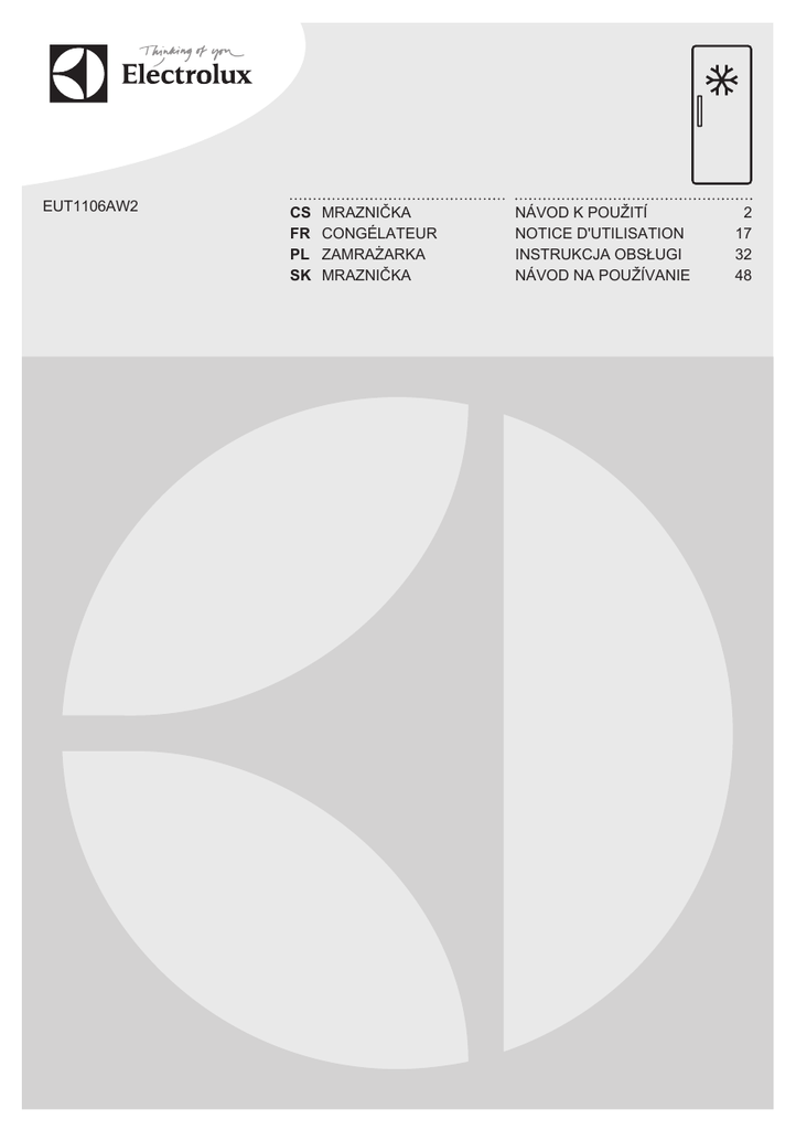 EUT1106AW2 CS FR PL SK MRAZNIČKA CONGÉLATEUR ZAMRAŻARKA MRAZNIČKA NÁVOD K POUŽITÍ NOTICE D'UTILISATION INSTRUKCJA OBSŁUGI NÁVOD NA POUŽÍVANIE 2 17 32 48 2 www.electrolux.com OBSAH 1. BEZPEČNOSTNÍ INFORMACE......................................................................... 3 2. BEZPEČNOSTNÍ POKYNY................................................................................4 3. PROVOZ.............................................................................................................6 4. PŘI PRVNÍM POUŽITÍ........................................................................................7 5. DENNÍ POUŽÍVÁNÍ............................................................................................ 7 6. TIPY A RADY..................................................................................................... 8 7. ČIŠTĚNÍ A ÚDRŽBA.......................................................................................... 8 8. ODSTRAŇOVÁNÍ ZÁVAD................................................................................ 10 9. INSTALACE......................................................................................................12 10. ZVUKY............................................................................................................14 11. TECHNICKÉ INFORMACE............................................................................ 15 MYSLÍME NA VÁS Děkujeme, že jste si zakoupili spotřebič značky Electrolux. Vybrali jste si produkt, se kterým jsou spjaty desítky let profesionálních zkušeností a inovací. Tento důmyslný a stylový spotřebič byl navržen s ohledem na jeho uživatele. Kdykoliv jej proto používáte, můžete se spolehnout, že pokaždé dosáhnete skvělých výsledků. Vítá Vás Electrolux. Navštivte naše stránky ohledně: Rady ohledně používání, brožury, poradce při potížích, servisních informací: www.electrolux.com Registrace vašeho spotřebiče, kterou získáte lepší servis: www.registerelectrolux.com Nákupu příslušenství, spotřebního materiálu a originálních náhradních dílů pro váš spotřebič: www.electrolux.com/shop PÉČE O ZÁKAZNÍKY A SERVIS Doporučujeme používat originální náhradní díly. Při kontaktu se servisním střediskem se ujistěte, že máte k dispozici následující údaje: Model, výrobní číslo (PNC), sériové číslo. Tyto informace jsou uvedeny na typovém štítku. Upozornění / Důležité bezpečnostní informace Všeobecné informace a rady Poznámky k ochraně životního prostředí Zmĕny vyhrazeny. ČESKY 1. 3 BEZPEČNOSTNÍ INFORMACE Tento návod si pečlivě přečtěte ještě před instalací spotřebiče a jeho prvním použitím. Výrobce nezodpovídá za škody a zranění způsobená nesprávnou instalací či chybným používáním. Návod k použití vždy uchovávejte spolu se spotřebičem pro jeho budoucí použití. 1.1 Bezpečnost dětí a postižených osob • • • • Tento spotřebič smí používat děti starší osmi let nebo osoby se sníženými fyzickými, smyslovými nebo duševními schopnostmi nebo osoby bez patřičných zkušeností a znalostí, pouze pokud tak činí pod dozorem nebo vedením, které zohledňuje bezpečný provoz spotřebiče, a pokud rozumí rizikům spojeným s provozem spotřebiče. Nenechte děti hrát si se spotřebičem. Čištění a uživatelskou údržbu spotřebiče by neměly provádět děti bez dozoru. Všechny obaly uschovejte z dosahu dětí. 1.2 Všeobecné bezpečnostní informace • • • • Tento spotřebič je určen pro použití v domácnosti a pro následující způsoby použití: – Ve farmářských domech, v kuchyňkách pro zaměstnance v obchodech, kancelářích a jiných pracovních prostředích – Pro zákazníky hotelů, motelů, penzionů a jiných ubytovacích zařízení Udržujte volně průchodné větrací otvory na povrchu spotřebiče nebo kolem vestavěného spotřebiče. K urychlení odmrazování nepoužívejte mechanické ani jiné pomocné prostředky, které nejsou doporučeny výrobcem. Nepoškozujte chladicí okruh. 4 www.electrolux.com • • • • • V prostoru chladicích spotřebičů nepoužívejte jiné elektrické přístroje, než typy schválené k tomuto účelu výrobcem. K čištění spotřebiče nepoužívejte proud vody nebo páru. Vyčistěte spotřebič vlhkým měkkým hadrem. Používejte pouze neutrální mycí prostředky. Nepoužívejte prostředky s drsnými částicemi, drátěnky, rozpouštědla nebo kovové předměty. V tomto spotřebiči neuchovávejte výbušné směsi, jako např. aerosolové spreje s hořlavým hnacím plynem. Jestliže je poškozený přívodní kabel, smí ho vyměnit pouze výrobce, autorizované servisní středisko nebo osoba s podobnou příslušnou kvalifikací, jinak by mohlo dojít k úrazu. 2. BEZPEČNOSTNÍ POKYNY 2.1 Instalace UPOZORNĚNÍ! Tento spotřebič smí instalovat jen kvalifikovaná osoba. • • • • • • • • • • Odstraňte veškerý obalový materiál. Poškozený spotřebič neinstalujte ani nepoužívejte. Řiďte se pokyny k instalaci dodanými spolu s tímto spotřebičem. Při přemisťování spotřebiče buďte vždy opatrní, protože je těžký. Vždy noste ochranné rukavice. Přesvědčte se, že vzduch může okolo spotřebiče volně proudit. Počkejte alespoň čtyři hodiny, než spotřebič připojíte k napájení. Olej tak může natéct zpět do kompresoru. Neinstalujte spotřebič v blízkosti topidel, sporáků, trub či varných desek. Zadní stěna spotřebiče musí být umístěna směrem ke zdi. Neinstalujte spotřebič tam, kde by se dostal do přímého slunečního světla. Neinstalujte spotřebič v příliš vlhkých či příliš chladných místech, jako jsou přístavby, garáže či vinné sklepy. • Při přemisťování spotřebiče jej nadzdvihněte za předn