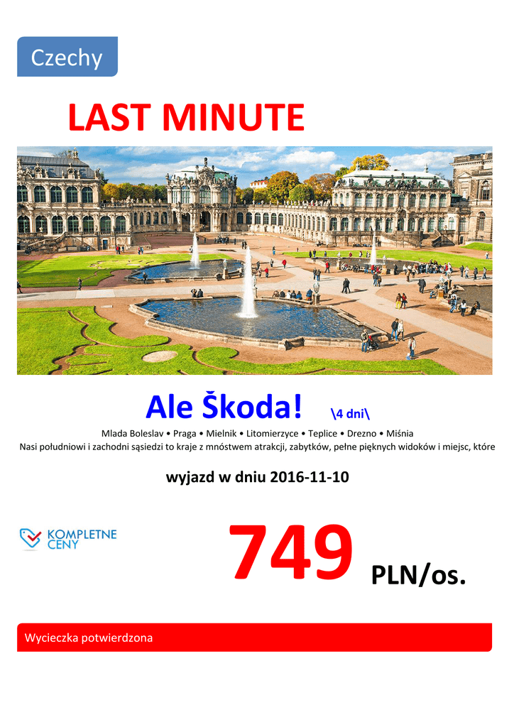Czechy LAST MINUTE Ale Škoda! \4 dni\ Mlada Boleslav • Praga • Mielnik • Litomierzyce • Teplice • Drezno • Miśnia Nasi południowi i zachodni sąsiedzi to kraje z mnóstwem atrakcji, zabytków, pełne pięknych widoków i miejsc, które wyjazd w dniu 2016-11-10 749 PLN/os. Wycieczka potwierdzona CENA ZAWIERA: transport, zakwaterowanie, wyżywienie zgodnie z programem, dopłatę transportową, opiekę pilota, ubezpieczenie KL i NW. CENA NIE ZAWIERA: dopłaty za wyjazd z wybranego miasta, opłat na miejscu, biletów wstępu, lokalnych przewodników. Szczegóły na www.itaka.pl. Prezentowane oferty i informacje nie stanowią oferty w rozumieniu przepisów Kodeksu Cywilnego. Ich dostępnoŚć oraz warunki mogą ulec zmianie.
