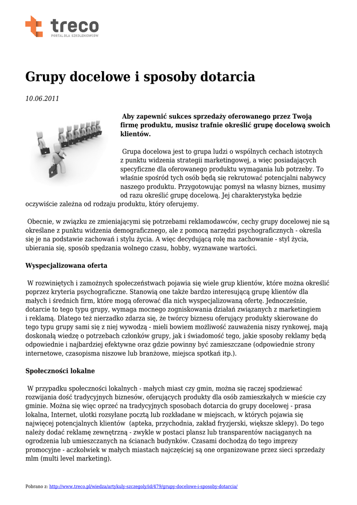 Grupy docelowe i sposoby dotarcia 10.06.2011 Aby zapewnić sukces sprzedaży oferowanego przez Twoją firmę produktu, musisz trafnie określić grupę docelową swoich klientów. Grupa docelowa jest to grupa ludzi o wspólnych cechach istotnych z punktu widzenia strategii marketingowej, a więc posiadających specyficzne dla oferowanego produktu wymagania lub potrzeby. To właśnie spośród tych osób będą się rekrutować potencjalni nabywcy naszego produktu. Przygotowując pomysł na własny biznes, musimy od razu określić grupę docelową. Jej charakterystyka będzie oczywiście zależna od rodzaju produktu, który oferujemy. Obecnie, w związku ze zmieniającymi się potrzebami reklamodawców, cechy grupy docelowej nie są określane z punktu widzenia demograficznego, ale z pomocą narzędzi psychograficznych - określa się je na podstawie zachowań i stylu życia. A więc decydującą rolę ma zachowanie - styl życia, ubierania się, sposób spędzania wolnego czasu, hobby, wyznawane wartości. Wyspecjalizowana oferta W rozwiniętych i zamożnych społeczeństwach pojawia się wiele grup klientów, które można określić poprzez kryteria psychograficzne. Stanowią one także bardzo interesującą grupę klientów dla małych i średnich firm, które mogą oferować dla nich wyspecjalizowaną ofertę. Jednocześnie, dotarcie to tego typu grupy, wymaga mocnego zogniskowania działań związanych z marketingiem i reklamą. Dlatego też nierzadko zdarza się, że twórcy biznesu oferujący produkty skierowane do tego typu grupy sami się z niej wywodzą - mieli bowiem możliwość zauważenia niszy rynkowej, mają doskonałą wiedzę o potrzebach członków grupy, jak i świadomość tego, jakie sposoby reklamy będą odpowiednie i najbardziej efektywne oraz gdzie powinny być zamieszczane (odpowiednie strony internetowe, czasopisma niszowe lub branżowe, miejsca spotkań itp.). Społeczności lokalne W przypadku społeczności lokalnych - małych miast czy gmin, można się raczej spodziewać rozwijania dość tradycyjnych biznesów, oferujących produkty dla osób zamieszkałych w mieście czy gminie. Można się więc oprzeć na tradycyjnych sposobach dotarcia do grupy docelowej - prasa lokalna, Internet, ulotki rozsyłane pocztą lub rozkładane w miejscach, w których pojawia się najwięcej potencjalnych klientów (apteka, przychodnia, zakład fryzjerski, większe sklepy). Do tego należy dodać reklamę zewnętrzną - zwykle w postaci plansz lub transparentów naciąganych na ogrodzenia lub umieszczanych na ścianach budynków. Czasami dochodzą do tego imprezy promocyjne - aczkolwiek w małych miastach najczęściej są one organizowane przez sieci sprzedaży mlm (multi level marketing). Pobrano z: http://www.treco.pl/wiedza/artykuly-szczegoly/id/479/grupy-docelowe-i-sposoby-dotarcia/ Nisze i konkurencja Przygotowując się do wejścia na rynek lokalny oraz do kampanii reklamowej, trzeba pamiętać, że olbrzymią moc ma na tych rynkach, tzw. reklama szeptana, podobnie jak jej szeptana antyreklama. Oznacza to, że wieści o dobrej jakości produktów, usług, a także obsługi i serwisu przekazywane są bardzo szybko przez klientów sobie nawzajem. Dlatego trzeba zwrócić szczególną uwagę na dbałość o jakość, obsługę, terminowość, odpowiednią cenę jako stałe elementy marketingu. W przeciwnym wypadku możemy spodziewać się problemów z wejściem na rynek lub odejścia części klientów. Zwłaszcza, że na rynkach lokalnych także spotkamy się z konkurencją, często szybko rosnącą. Ważne jest więc dokładne monitorowanie rynku pod kątem pojawiającej się konkurencji, oferowanych produktów/usług oraz ich cen, tak aby można było błyskawicznie reagować i samemu zagospodarowywać wolne jeszcze nisze. Ryszard Jórczak Redaktor Źródło: http://msp.nf.pl/Artykul/11315/Grupy-docelowe-i-sposoby-dotarcia/ Ocena: 0/6 Pobrano z: http://www.treco.pl/wiedza/artykuly-szczegoly/id/479/grupy-docelowe-i-sposoby-dotarcia/