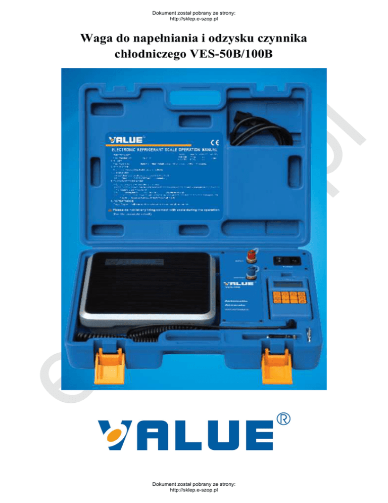 Dokument został pobrany ze strony: http://sklep.e-szop.pl e- sz o p. pl Waga do napełniania i odzysku czynnika chłodniczego VES-50B/100B Dokument został pobrany ze strony: http://sklep.e-szop.pl Dokument został pobrany ze strony: http://sklep.e-szop.pl Instrukcja obsługi Szanowny Użytkowniku Dziękujemy za wybranie produktu marki . Dla uzyskania najlepszych wyników Spis treści 1. ROZPAKOWANIE 3 3 p. 2. ŚRODKI BEZPIECZEŃSTWA 3. DANE TECHNICZNE pl i właściwego korzystania przeczytaj uważnie instrukcję obsługi przed rozpoczęciem użytkowania, a zwłaszcza rozdział „Środki bezpieczeństwa” Niniejszą instrukcję należy najlepiej przechowywać wraz z produktem lub tak, aby można ją było łatwo odnaleźć. 4 4. WYŚWIETLACZ CIEKŁOKRYSTALICZNY (LCD) 4 5. INSTRUKCJA OBSŁUGI 5 sz o 5.1. ZESTAW FUNKCJI 5 5.2. PODŚWIETLENIE (B/L) 5 5.3. TRYB WAGI 5 5.4. ZEROWANIE 5 5.5. TRYB NAPEŁNIANIA 6 5.6. TRYB ODZYSKU 7 5.7. TRYB POWTARZANIA 8 8 e- 6. KONSERWACJA 2 Dokument został pobrany ze strony: http://sklep.e-szop.pl Dokument został pobrany ze strony: http://sklep.e-szop.pl 1. ROZPAKOWANIE Otwórz opakowanie i wyjmij wagę. Po rozpakowaniu sprawdź, czy poniższe elementy są i czy nie są uszkodzone. Jeżeli czegoś brakuje lub jest uszkodzone skontaktuj się bezzwłocznie z dostawcą. Ilość Instrukcja obsługi 1 Walizka (futerał) 1 Waga 1 Bateria 1 Kabel zasilający 1 p. Hak pl Opis części 1 2. ŚRODKI BEZPIECZEŃSTWA sz o 2.1. Przed rozpoczęciem użytkowania sprawdź urządzenie. Nie używaj go, jeżeli którejkolwiek części brakuje lub jest uszkodzona. 2.2. Nie waż przedmiotów, których masa wykracza poza nośność wagi. W przeciwnym przypadku możesz zniszczyć urządzenie. 2.3. Postaraj się umieszczać ważony przedmiot pośrodku tacy wagi. Nie potrząsaj nim i nie pozwalaj, aby jakikolwiek inny przedmiot, łącznie ze spiralnym kablem, był w kontakcie z wagą. W przeciwnym wypadku pomiar może być niedokładny. e- 2.4. Nie przechowuj i nie używaj wagi w miejscach, gdzie jest wysoka temperatura, wysoka wilgotność, wybuchowa atmosfera, w miejscach łatwopalnych lub silnym polu magnetycznym. 2.5. Nie zmieniaj obwodów wewnętrznych wagi elektronicznej. 2.6. Nie ciągnij spiralnego kabla łączącego wyświetlacz z wagą. To może zniszczyć urządzenie. 2.7. Wymień baterię, gdy wyświetla się alarm niskiego poziomu napięcia baterii. 2.8. Przed przystąpieniem do użytkowania wagi sprawdź, czy zasilanie ma odpowiednie parametry. Niewłaściwe zasilanie może zniszczyć urządzenie. 3 Dokument został pobrany ze strony: http://sklep.e-szop.pl Dokument został pobrany ze strony: http://sklep.e-szop.pl 2.9. Po zakończeniu pracy z urządzeniem za każdym razem załóż pokrywę na port wejścia-wyjscia. 2.10. Wyłącz wagę za każdym razem, gdy kończysz jej używanie. Jeżeli urządzenie będzie magazynowane lub nie będzie używane przez dłuższy czas, to wyjmij z niego baterię. Waga wyłącza się automatycznie, jeżeli w ciągu po 30 minut nie zostanie wciśnięty żaden przycisk. 3. DANE TECHNICZNE VES-50B VES-100B Zakres pomiaru 50 Kg/110Lb/1764 oz 100 Kg/220Lb/3528 oz Rozdzielczość 2g/0,01Lb/0,1oz 5g/0,01Lb/0,2oz 0,05% p. Dokładność pl Model Wyświetlacz LCD 7 segmentowy Zasilanie 9V DC (stały) i AC (zmienny, 110V do 230V) -10OC ~ +40OC, RH ≤75% Środowisko pracy 237 x 237 mm sz o Wymiary platformy Antykolizyjność TAK Waga 6,2 Kg 4. WYŚWIETLACZ CIEKŁOKRYSTALICZNY Logo firmy Wskaźnik przeciążenia Wskaźnik alarmu Wskaźnik słabej baterii e- Wskaźnik trybu napełniania Wskaźnik trybu odzysku Główny wyświetlacz numeryczny Wskaźnik jednostek 4 Dokument został pobrany ze strony: http://sklep.e-szop.pl Dokument został pobrany ze strony: http://sklep.e-szop.pl 5. INSTRUKCJA OBSŁUGI pl 5.1. Urządzenie posiada trzy skale wagi: Kg(kilogram), oz(uncje), Lb(funty). W celu zmiany skali wciskaj przycisk FUNCTION, aż do wyświetlenia się żądanej jednostki Kg, oz lub Lb. Urządzenie ma domyślnie ustawioną skalę w Kg. p. Wciśnij przycisk FUNCTION, aby przełączyć skalę na oz. sz o Wciśnij przycisk FUNCTION, aby przełączyć skalę na Lb. 5.2. PODŚWIETLENIE (B/L) W zależności od potrzeb wciśnij przycisk „B/L”, aby wyświetlacz miał włączone podświetlenie lub nie. Kolor podświetlenia jest niebieski. Urządzenie nie ma domyślnie włączonego podświetlania. Tryb podświetlania wyłącza się automatycznie, jeżeli w ciągu po 30 sekund nie zostanie wciśnięty żaden przycisk. e- 5.3. TRYB WAGI Pierwsze wskazanie na wyświetlaczu będzie większe niż 1 Kg (włączając w to 1 Kg). Następnie waga będzie wskazywała z dokładnością taką, jak wskazana w danych technicznych 5.4. ZEROWANIE Wciśnij przycisk CLEAR, aby skasować wszystkie funkcje i powrócić do trybu wagi (SCALE MODE). Wciśnij przycisk ENTER, aby wyjść z trybu zerowania (CLEAR MODE) i wyświetlić aktualną wagę. 5 Dokument został pobrany ze strony: http://sklep.e-szop.pl Dokument został pobrany ze strony: http://sklep.e-szop.pl 5.5. TRYB NAPEŁNIANIA. sz o p. pl Funkcja ta pozwala użytkownikowi szybko Zasilanie napełnić i wygodnie instalację w krótkim czasie. Przełącz wagę na tryb napełniania (CHARGE MODE) i wprowadź wagę (minimum czynnika 50g), który ma być przetoczony. 1. Upewnij się, że Butla jest wszystko połączone prawidłowo i pewnie Instalacja chłodnicza (popatrz na rysunek Stacja napełniania obok). 2. Włącz wagę. 3. Postaw butlę z czynnikiem na platformę wagi. Poczekaj, aż cyfry na wyświetlaczu się zatrzymają. Dla przykładu, gdy butla z czynnikiem waży 12 Kg, na wyświetlaczy pojawi się: e- 4. Wciśnij przycisk CHARGE. Na wyświetlaczu pojawi się wskaźnik napełniania. Następnie wprowadź ilość czynnika, która ma być wpuszczona do instalacji i wciśnij przycisk ENTER. Zawór elektromagnetyczny się otworzy i czynnik chłodniczy zacznie wpływać do instalacji. Dla przykładu: Ilość czynn
