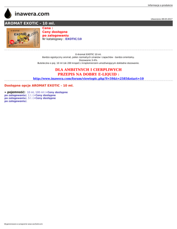 Informacje o produkcie Utworzono 08-03-2017 AROMAT EXOTIC - 10 ml. Cena : Ceny dostępne po zalogowaniu Nr katalogowy : EXOTIC/10 E-Aromat EXOTIC 10 ml. Bardzo egzotyczny aromat, pełen rozmaitych smaków i zapachów - bardzo orientalny. Dozowanie 3-4%. Buteleczka o poj. 10 ml (ok 200 kropel) z kroplomierzem umożliwiającym dokładne dozowanie. DLA AMBITNYCH I CIERPLIWYCH PRZEPIS NA DOBRY E-LIQUID : http://www.inawera.com/forum/viewtopic.php?f=59&t=2585&start=10 Dostępne opcje AROMAT EXOTIC - 10 ml. » pojemność: 10 ml, 100 ml (+Ceny dostępne po zalogowaniu), 1 l. (+Ceny dostępne po zalogowaniu), 5 l. (+Ceny dostępne po zalogowaniu). Wygenerowano w programie www.oscGold.com