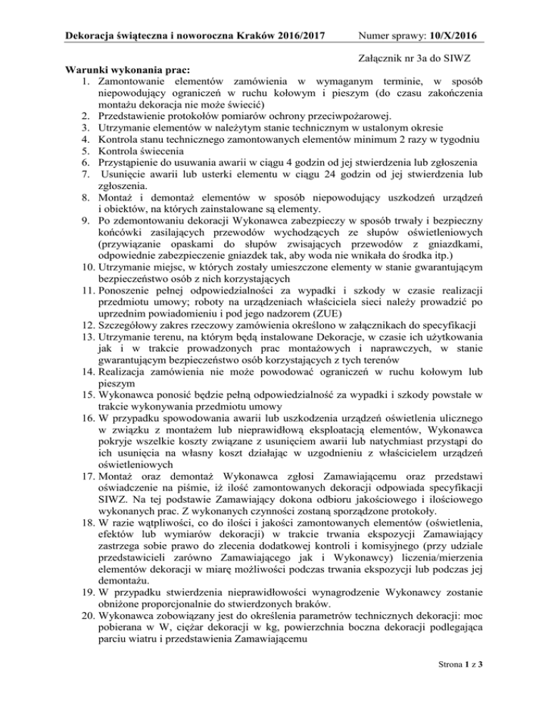Dekoracja świąteczna i noworoczna Kraków 2016/2017 Numer sprawy: 10/X/2016 Załącznik nr 3a do SIWZ Warunki wykonania prac: 1. Zamontowanie elementów zamówienia w wymaganym terminie, w sposób niepowodujący ograniczeń w ruchu kołowym i pieszym (do czasu zakończenia montażu dekoracja nie może świecić) 2. Przedstawienie protokołów pomiarów ochrony przeciwpożarowej. 3. Utrzymanie elementów w należytym stanie technicznym w ustalonym okresie 4. Kontrola stanu technicznego zamontowanych elementów minimum 2 razy w tygodniu 5. Kontrola świecenia 6. Przystąpienie do usuwania awarii w ciągu 4 godzin od jej stwierdzenia lub zgłoszenia 7. Usunięcie awarii lub usterki elementu w ciągu 24 godzin od jej stwierdzenia lub zgłoszenia. 8. Montaż i demontaż elementów w sposób niepowodujący uszkodzeń urządzeń i obiektów, na których zainstalowane są elementy. 9. Po zdemontowaniu dekoracji Wykonawca zabezpieczy w sposób trwały i bezpieczny końcówki zasilających przewodów wychodzących ze słupów oświetleniowych (przywiązanie opaskami do słupów zwisających przewodów z gniazdkami, odpowiednie zabezpieczenie gniazdek tak, aby woda nie wnikała do środka itp.) 10. Utrzymanie miejsc, w których zostały umieszczone elementy w stanie gwarantującym bezpieczeństwo osób z nich korzystających 11. Ponoszenie pełnej odpowiedzialności za wypadki i szkody w czasie realizacji przedmiotu umowy; roboty na urządzeniach właściciela sieci należy prowadzić po uprzednim powiadomieniu i pod jego nadzorem (ZUE) 12. Szczegółowy zakres rzeczowy zamówienia określono w załącznikach do specyfikacji 13. Utrzymanie terenu, na którym będą instalowane Dekoracje, w czasie ich użytkowania jak i w trakcie prowadzonych prac montażowych i naprawczych, w stanie gwarantującym bezpieczeństwo osób korzystających z tych terenów 14. Realizacja zamówienia nie może powodować ograniczeń w ruchu kołowym lub pieszym 15. Wykonawca ponosić będzie pełną odpowiedzialność za wypadki i szkody powstałe w trakcie wykonywania przedmiotu umowy 16. W przypadku spowodowania awarii lub uszkodzenia urządzeń oświetlenia ulicznego w związku z montażem lub nieprawidłową eksploatacją elementów, Wykonawca pokryje wszelkie koszty związane z usunięciem awarii lub natychmiast przystąpi do ich usunięcia na własny koszt działając w uzgodnieniu z właścicielem urządzeń oświetleniowych 17. Montaż oraz demontaż Wykonawca zgłosi Zamawiającemu oraz przedstawi oświadczenie na piśmie, iż ilość zamontowanych dekoracji odpowiada specyfikacji SIWZ. Na tej podstawie Zamawiający dokona odbioru jakościowego i ilościowego wykonanych prac. Z wykonanych czynności zostaną sporządzone protokoły. 18. W razie wątpliwości, co do ilości i jakości zamontowanych elementów (oświetlenia, efektów lub wymiarów dekoracji) w trakcie trwania ekspozycji Zamawiający zastrzega sobie prawo do zlecenia dodatkowej kontroli i komisyjnego (przy udziale przedstawicieli zarówno Zamawiającego jak i Wykonawcy) liczenia/mierzenia elementów dekoracji w miarę możliwości podczas trwania ekspozycji lub podczas jej demontażu. 19. W przypadku stwierdzenia nieprawidłowości wynagrodzenie Wykonawcy zostanie obniżone proporcjonalnie do stwierdzonych braków. 20. Wykonawca zobowiązany jest do określenia parametrów technicznych dekoracji: moc pobierana w W, ciężar dekoracji w kg, powierzchnia boczna dekoracji podlegająca parciu wiatru i przedstawienia Zamawiającemu Strona 1 z 3 Dekoracja świąteczna i noworoczna Kraków 2016/2017 Numer sprawy: 10/X/2016 21. Wykonawca zobowiązany jest do wykonania dekoracji tak, aby nie spowodowały uszkodzeń (złamań, uszkodzeń tynków itp.) urządzeń lub elementów, do których będą montowane 22. W przypadku spowodowania awarii lub uszkodzenia urządzeń, na których zostały zamontowane elementy dekoracyjne lub nieprawidłową ekspozycję elementów, Wykonawca natychmiast przystąpi do ich usunięcia na własny kosz, działając w uzgodnieniu z właścicielem urządzeń oraz pokryje wszelkie koszty związane z uszkodzeniem i usunięciem awarii. Obowiązek naprawienia szkody obciąża w takim wypadku Wykonawcę ( w interesie Wykonawcy leży ubezpieczenie się od tego typu zdarzeń a także dewastacji elementów dekoracji). 23. W zakresie Wykonawcy jest uzyskanie pozwoleń na wjazd w strefy ograniczonego ruchu dla swoich pojazdów technicznych obsługujących dekorację. 24. Wykonawca jest odpowiedzialny, za jakość wykonywanych prac oraz bezpieczeństwo związanych z ich wykonaniem na terenie miasta. 25. Wykonawca ma obowiązek znać i stosować w czasie prowadzenia prac wszelkie przepisy dotyczące ochrony środowiska naturalnego. 26. Podczas realizacji prac Wykonawca będzie przestrzegać przepisów dotyczących bezpieczeństwa i higieny pracy. W szczególności Wykonawca ma obowiązek zadbać, aby personel nie wykonywał pracy w warunkach niebezpiecznych, szkodliwych dla zdrowia oraz niespełniających odpowiednich wymagań sanitarnych. Wykonawca zapewni i będzie utrzymywał wszelkie urządzenia zabezpieczające, socjalne oraz sprzęt i odpowiednią odzież dla ochrony życia i zdrowia osób zatrudnionych przy wykonywaniu dekoracji dla zapewnienia bezpieczeństwa publicznego. Uznaje się, że wszelkie koszty związane z wypełnieniem wymagań określonych powyżej nie podlegają odrębnej zapłacie i są uwzględnione w cenie kontraktowej. 27. Wykonawca będzie stosować się do ustawowych ograniczeń nacisków osi na drogach publicznych. 28. Wykonawca będzie odpowiadał za naprawę wszelkich zniszczeń spowodowanych z jego winy i będzie ponosił pełną odpowiedzialność za szkody wyrządzone osobom trzecim. 29. Wykonawca zobowiązany jest znać wszelkie zarządzenia wydane przez władze centralne i miejscowe oraz inne przepisy, regulaminy i wytyczne, które są w jakikolwiek sposób związane z wykonywanymi pracami i będzie w pełni