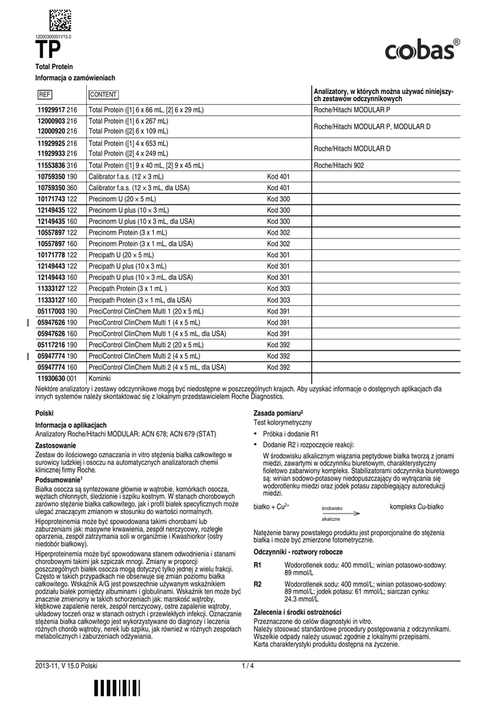 12000300001V15.0 TP Total Protein Informacja o zamówieniach REF CONTENT 11929917 216 12000903 216 12000920 216 Total Protein ([1] 6 x 66 mL, [2] 6 x 29 mL) Total Protein ([1] 6 x 267 mL) Total Protein ([2] 6 x 109 mL) 11929925 216 11929933 216 Total Protein ([1] 4 x 653 mL) Total Protein ([2] 4 x 249 mL) Analizatory, w których można używać niniejszy ch zestawów odczynnikowych Roche/Hitachi MODULAR P Roche/Hitachi MODULAR P, MODULAR D Roche/Hitachi MODULAR D 11553836 316 Total Protein ([1] 9 x 40 mL, [2] 9 x 45 mL) Roche/Hitachi 902 10759350 190 Calibrator f.a.s. (12 × 3 mL) Kod 401 10759350 360 Calibrator f.a.s. (12 × 3 mL, dla USA) Kod 401 10171743 122 Precinorm U (20 × 5 mL) Kod 300 12149435 122 Precinorm U plus (10 × 3 mL) Kod 300 12149435 160 Precinorm U plus (10 x 3 mL, dla USA) Kod 300 10557897 122 Precinorm Protein (3 x 1 mL) Kod 302 10557897 160 Precinorm Protein (3 x 1 mL, dla USA) Kod 302 10171778 122 Precipath U (20 × 5 mL) Kod 301 12149443 122 Precipath U plus (10 x 3 mL) Kod 301 12149443 160 Precipath U plus (10 × 3 mL, dla USA) Kod 301 11333127 122 Precipath Protein (3 x 1 mL ) Kod 303 11333127 160 Precipath Protein (3 × 1 mL, dla USA) Kod 303 05117003 190 PreciControl ClinChem Multi 1 (20 x 5 mL) Kod 391 05947626 190 PreciControl ClinChem Multi 1 (4 x 5 mL) Kod 391 05947626 160 PreciControl ClinChem Multi 1 (4 x 5 mL, dla USA) Kod 391 05117216 190 PreciControl ClinChem Multi 2 (20 x 5 mL) Kod 392 05947774 190 PreciControl ClinChem Multi 2 (4 x 5 mL) Kod 392 05947774 160 PreciControl ClinChem Multi 2 (4 x 5 mL, dla USA) Kod 392 11930630 001 Kominki Niektóre analizatory i zestawy odczynnikowe mogą być niedostępne w poszczególnych krajach. Aby uzyskać informacje o dostępnych aplikacjach dla innych systemów należy skontaktować się z lokalnym przedstawicielem Roche Diagnostics. Polski Informacja o aplikacjach Analizatory Roche/Hitachi MODULAR: ACN 678; ACN 679 (STAT) Zastosowanie Zestaw do ilościowego oznaczania in vitro stężenia białka całkowitego w surowicy ludzkiej i osoczu na automatycznych analizatorach chemii klinicznej firmy Roche. Podsumowanie1 Białka osocza są syntezowane głównie w wątrobie, komórkach osocza, węzłach chłonnych, śledzionie i szpiku kostnym. W stanach chorobowych zarówno stężenie białka całkowitego, jak i profil białek specyficznych może ulegać znaczącym zmianom w stosunku do wartości normalnych. Hipoproteinemia może być spowodowana takimi chorobami lub zaburzeniami jak: masywne krwawienia, zespół nerczycowy, rozległe oparzenia, zespół zatrzymania soli w organiźmie i Kwashiorkor (ostry niedobór białkowy). Hiperproteinemia może być spowodowana stanem odwodnienia i stanami chorobowymi takimi jak szpiczak mnogi. Zmiany w proporcji poszczególnych białek osocza mogą dotyczyć tylko jednej z wielu frakcji. Często w takich przypadkach nie obserwuje się zmian poziomu białka całkowitego. Wskaźnik A/G jest powszechnie używanym wskaźnikiem podziału białek pomiędzy albuminami i globulinami. Wskaźnik ten może być znacznie zmieniony w takich schorzeniach jak: marskość wątroby, kłębkowe zapalenie nerek, zespół nerczycowy, ostre zapalenie wątroby, układowy toczeń oraz w stanach ostrych i przewlekłych infekcji. Oznaczanie stężenia białka całkowitego jest wykorzystywane do diagnozy i leczenia różnych chorób wątroby, nerek lub szpiku, jak również w różnych zespołach metabolicznych i zaburzeniach odżywiania. 2013-11, V 15.0 Polski Zasada pomiaru2 Test kolorymetryczny ▪ Próbka i dodanie R1 ▪ Dodanie R2 i rozpoczęcie reakcji: W środowisku alkalicznym wiązania peptydowe białka tworzą z jonami miedzi, zawartymi w odczynniku biuretowym, charakterystyczny fioletowo zabarwiony kompleks. Stabilizatorami odczynnika biuretowego są: winian sodowo-potasowy niedopuszczający do wytrącania się wodorotlenku miedzi oraz jodek potasu zapobiegający autoredukcji miedzi. białko + Cu2+ środowisko kompleks Cu-białko alkaliczne Natężenie barwy powstałego produktu jest proporcjonalne do stężenia białka i może być zmierzone fotometrycznie. Odczynniki - roztwory robocze R1 Wodorotlenek sodu: 400 mmol/L; winian potasowo-sodowy: 89 mmol/L R2 Wodorotlenek sodu: 400 mmol/L; winian potasowo-sodowy: 89 mmol/L; jodek potasu: 61 mmol/L; siarczan cynku: 24.3 mmol/L Zalecenia i środki ostrożności Przeznaczone do celów diagnostyki in vitro. Należy stosować standardowe procedury postępowania z odczynnikami. Wszelkie odpady należy usuwać zgodnie z lokalnymi przepisami. Karta charakterystyki produktu dostępna na życzenie. 1/4 12000300001V15.0 TP Total Protein Zestaw zawiera składniki sklasyfikowane zgodnie z europejskimi wytycznymi 1999/45/EC, w następujący sposób: C Produkt żrący R 35 Powoduje poważne oparzenia. S 26 Zanieczyszczone oczy przemyć natychmiast dużą ilością wody i zasięgnąć porady lekarza. S 36/37/39 Nosić odpowiednią odzież ochronną, odpowiednie rękawice ochronne i okulary lub ochronę twarzy. S 45 W przypadku awarii lub jeżeli źle się poczujesz, niezwłocznie zasięgnij porady lekarza – jeżeli to możliwe, pokaż etykietę. Telefon kontaktowy dla wszystkich krajów: +49-621-7590; USA: +1-800-428-2336 Postępowanie z odczynnikami R1: Gotowy do użycia R2: Gotowy do użycia (Analizator Roche/Hitachi 902: Rozcieńczyć R1 w stosunku 1 + 2 wodą destylowaną/dejonizowaną dla aplikacji TPDIL). Absorbcja atmosferycznego CO2 przez odczynnik w otwartej butelce może powodować utratę stabilności kalibracji. Dlatego też w celu ograniczenia wpływu CO2 na odczynniki należy stosować kominki oznaczone kolorami. Kominki należy umieścić na właściwych odczynnikach: biały na R1, czarny na R2. Kominki mogą być użyte ponownie w przypadku butelek pochodzących z tego samego zestawu. Niemniej, aby uniknąć kontaminacji odczynnika detergentem lub roztworem odczynnika i wody, przed ponownym użyciem zabronione jest mycie kominków. Kominki s