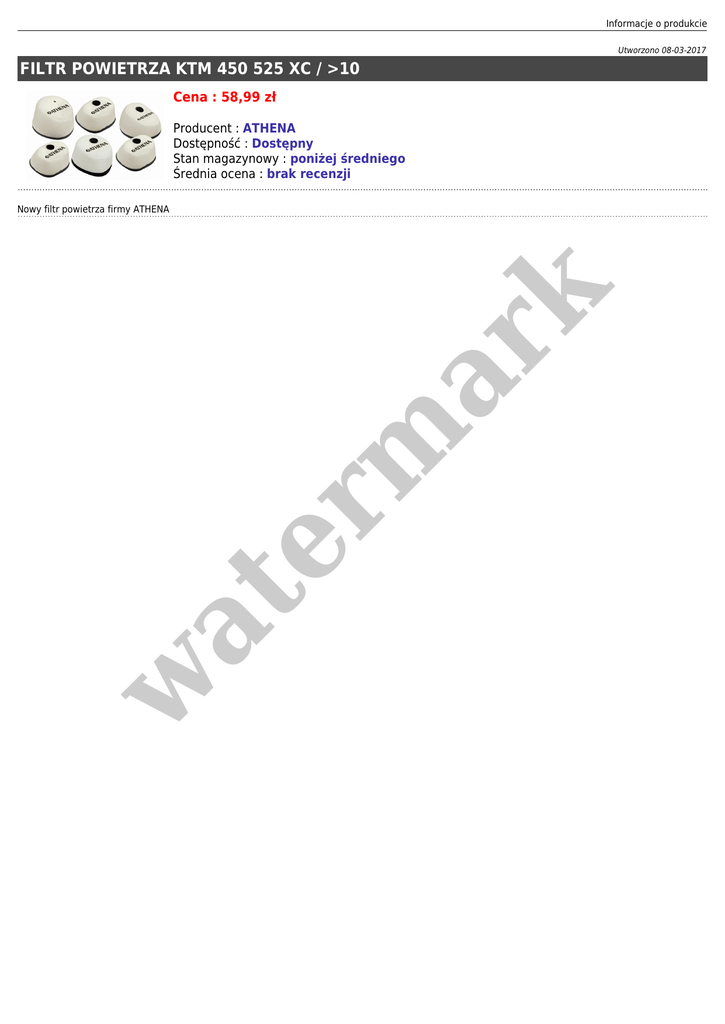 Informacje o produkcie Utworzono 08-03-2017 FILTR POWIETRZA KTM 450 525 XC / >10 Cena : 58,99 zł Producent : ATHENA Dostępność : Dostępny Stan magazynowy : poniżej średniego Średnia ocena : brak recenzji w at er m ar k Nowy filtr powietrza firmy ATHENA