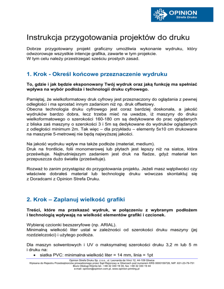 Instrukcja przygotowania projektów do druku Dobrze przygotowany projekt graficzny umożliwia wykonanie wydruku, który odwzorowuje wszystkie intencje grafika, zawarte w tym projekcie. W tym celu należy przestrzegać sześciu prostych zasad. 1. Krok - Określ końcowe przeznaczenie wydruku To, gdzie i jak będzie eksponowany Twój wydruk oraz jaką funkcję ma spełniać wpływa na wybór podłoża i technologii druku cyfrowego. Pamiętaj, że wielkoformatowy druk cyfrowy jest przeznaczony do oglądania z pewnej odległości i ma sprostać innym zadaniom niż np. druk offsetowy. Obecna technologia druku cyfrowego jest coraz bardziej doskonała, a jakość wydruków bardzo dobra, lecz trzeba mieć na uwadze, iż maszyny do druku wielkoformatowego o szerokości 160-180 cm są dedykowane do prac oglądanych z bliska zaś maszyny o szerokości 3 i 5m są dedykowane do wydruków oglądanych z odległości minimum 2m. Tak więc – dla przykładu – elementy 5x10 cm drukowane na maszynie 5-metrowej nie będą najwyższej jakości. Na jakość wydruku wpływ ma także podłoże (materiał, medium). Druk na frontlicie, folii monomerowej lub płytach jest lepszy niż na siatce, która prześwituje. Najtrudniejszym zadaniem jest druk na fladze, gdyż materiał ten przepuszcza dużo światła (prześwituje). Rozważ to zanim przystąpisz do przygotowania projektu. Jeżeli masz wątpliwości czy właściwie dobrałeś materiał lub technologię druku wówczas skontaktuj się z Doradcami z Opinion Strefa Druku. 2. Krok – Zaplanuj wielkość grafiki Treści, które ma przekazać wydruk, w połączeniu z wybranym podłożem i technologią wpływają na wielkość elementów grafiki i czcionek. Wybieraj czcionki bezszeryfowe (np. ARIAL). Minimalną wielkość liter ustal w zależności od szerokości druku maszyny (jej rozdzielczości) i użytego podłoża. Dla maszyn solwentowych i UV o maksymalnej szerokości druku 3,2 m lub 5 m i druku na: siatka PVC: minimalna wielkość liter = 14 mm, linia = 1pt Opinion Strefa Druku Sp. z o.o., ul. Leonarda da Vinci 12, 44-109 Gliwice Wpisana do Rejestru Przedsiębiorców prowadzonego przez Sąd Rejonowy w Gliwicach pod numerem KRS 0000159728, NIP: 631-23-79-751 Biuro Obsługi Klienta tel.: +48 32 330 19 30, fax: +48 32 330 19 44 e-mail: [email protected], www.opinion-printing.pl frontlit: minimalna wielkość liter = 10 mm, linia = 0,5pt airtex: minimalna wielkość liter = 8 mm, linia = 0,5pt Dla maszyny solwentowych i UV o maksymalnej szerokości druku 180 cm i druku na frontlicie lub folii monomerowej minimalna wielkość liter = 4 mm Dla maszyny do druku na tekstyliach: flaga: minimalna wielkość liter = 5 mm, linia = 0,5pt decor: minimalna wielkość liter = 5 mm, linia = 0,5pt UWAGA: Wielkości przy założeniu druku czarnych liter na białym tle. Jeśli tło będzie inne i kolor liter np. czarne litery na żółtym tle, albo białe litery na czerwonym tle, wówczas wartości minimalne zmienią się na niekorzyść. Trudno również wydrukować aplę kolorową z białymi litrami, ze względu na „efekt zalewania”. 3. Krok – Zachowaj marginesy bezpieczeństwa Obszar bezpieczny wydruku, to obszar mniejszy od obszaru całkowitego wydruku o ok. 10%. Wszystkie ważne elementy grafiki (np. logotypy) oraz teksty muszą zmieścić się w obszarze bezpiecznym, czyli muszą być odsunięte od krawędzi obszaru widocznego co najmniej na odległość marginesu bezpieczeństwa. Dzięki temu będziesz mieć pewność, że Twój layout będzie właściwie widoczny, a jego ważne elementy nie zostaną zakryte przez mechanizmy nośnika lub wykończenia druku. Znajdź w tabeli wykończenia, jakich chcesz użyć i zastosuj odpowiedni margines bezpieczeństwa w swoim projekcie. Opinion Strefa Druku Sp. z o.o., ul. Leonarda da Vinci 12, 44-109 Gliwice Wpisana do Rejestru Przedsiębiorców prowadzonego przez Sąd Rejonowy w Gliwicach pod numerem KRS 0000159728, NIP: 631-23-79-751 Biuro Obsługi Klienta tel.: +48 32 330 19 30, fax: +48 32 330 19 44 e-mail: [email protected], www.opinion-printing.pl UWAGA: Szerokość tunelu to połowa jego obwodu, a nie jego średnica. W przypadku druku dwustronnego zastosuj marginesy bezpieczeństwa do projektu obu stron wydruku Opinion Strefa Druku Sp. z o.o., ul. Leonarda da Vinci 12, 44-109 Gliwice Wpisana do Rejestru Przedsiębiorców prowadzonego przez Sąd Rejonowy w Gliwicach pod numerem KRS 0000159728, NIP: 631-23-79-751 Biuro Obsługi Klienta tel.: +48 32 330 19 30, fax: +48 32 330 19 44 e-mail: [email protected], www.opinion-printing.pl 4. Krok – Wybierz właściwą rozdzielczość W zależności od tego, jak będzie eksponowany Twój wydruk musi on mieć odpowiednie rozmiary, a więc Twój projekt musi być przygotowany w odpowiedniej rozdzielczości. Im większa odległość, z jakiej będzie oglądany Twój wydruk, tym większy będzie jego rozmiar, a więc rozdzielczość projektu (ilość punktów na cal kwadratowy) może być mniejsza. Znajdź w tabeli rozmiar wydruku jaki chcesz wykonać i odczytaj rozdzielczość wymaganą dla Twojego projektu. 5. Krok – Dobierz tryb kolorystyczny Druk cyfrowy wykonywany jest z wykorzystaniem czterech kolorów Przygotuj swój projekt w trybie kolorystycznym CMYK. Jeżeli chcesz drukować projekt czarnobiały wówczas przygotuj go w trybie odcieni szarości (grayscale). Aby uzyskać odpowiednią głębię koloru czarnego złóż go z: C60-M50-Y50-K100. Aby uzyskać odpowiedni kolor czarny na tekstyliach złóż go z: C0-M0-Y0-K100. 6. Krok – Zapisz poprawnie swój projekt Obowiązuje zasada jeden plik to jeden projekt. Format projektu powinien być ograniczony ramką lub paserami i przygotowany w skali 1:1 lub 1:10. Najbezpieczniejszym formatem zapisu plików do druku cyfrowego jest TIFF. Zapisz projekty jako TIFF z kompresją LZW lub JPG (Quality 12 Maximum), pliki Opinion Strefa Druku Sp. z o.o., ul. Leonarda da Vinci 12, 44-109 Gliwice Wpisana do Rejestru Przedsiębiorców pro