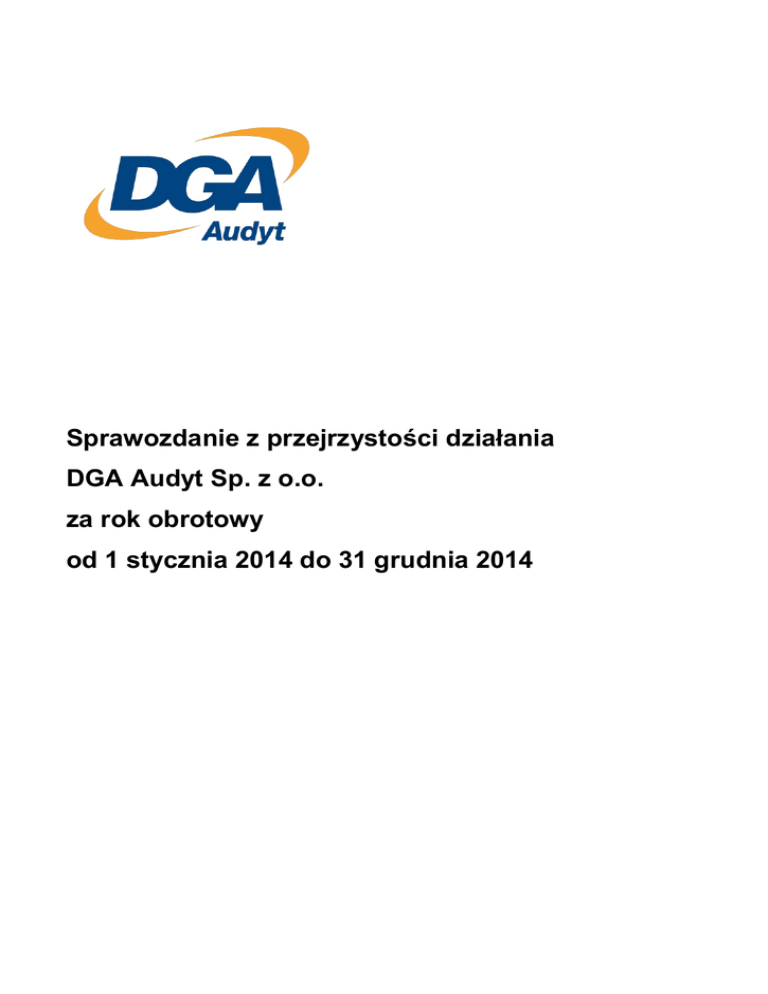 Sprawozdanie z przejrzystości działania DGA Audyt Sp. z o.o. za rok obrotowy od 1 stycznia 2014 do 31 grudnia 2014 Sprawozdanie z przejrzystości działania DGA Audyt Sp. z o.o. za rok obrotowy od 1 stycznia 2014 roku do 31 grudnia 2014 roku Spis treści: 1. Wstęp; 2. Informacje dotyczące formy organizacyjno-prawnej oraz struktury własnościowej; 3. Opis struktury zarządzania podmiotu uprawnionego do badania sprawozdań finansowych; 4. Opis systemu wewnętrznej kontroli jakości podmiotu uprawnionego do badania sprawozdań finansowych oraz oświadczenie zarządu na temat skuteczności jego funkcjonowania; 5. Wskazanie, kiedy odbyła się ostatnia kontrola w zakresie systemu zapewnienia jakości, przeprowadzona przez Krajową Komisję Nadzoru; 6. Wykaz jednostek zainteresowania publicznego, dla których podmiot uprawniony do badania sprawozdań finansowych wykonywał czynności rewizji finansowej w poprzednim roku obrotowym; 7. Oświadczenie o stosowanej przez podmiot uprawniony do badania sprawozdań finansowych polityce w zakresie zapewnienia niezależności, zawierające również potwierdzenie, że została przeprowadzona wewnętrzna kontrola przestrzegania zasad niezależności, 8. Oświadczenie o stosowanej przez podmiot uprawniony do badania sprawozdań finansowych polityce w zakresie doskonalenia zawodowego biegłych rewidentów, 9. Informacje o osiągniętych przychodach, z podziałem na poszczególne czynności rewizji finansowej i usługi, o których mowa w art. 48 ust. 2, ustawy z dnia 7 maja 2009 r. o biegłych rewidentach, ich samorządzie, podmiotach uprawnionych do badania oraz o nadzorze publicznym. 10. Informacje o zasadach wynagradzania kluczowych biegłych rewidentów oraz członków zarządu - wraz ze wskazaniem biegłego rewidenta odpowiedzialnego w imieniu podmiotu uprawnionego do badania sprawozdań finansowych za sporządzenie tego sprawozdania; DGA Audyt Sp. z o.o. 2 Sprawozdanie z przejrzystości działania DGA Audyt Sp. z o.o. za rok obrotowy od 1 stycznia 2014 roku do 31 grudnia 2014 roku 1. Wstęp Niniejsze sprawozdanie zostało sporządzone w związku z obowiązkiem wynikającym z art. 88 ustawy z dnia 7 maja 2009 r. o biegłych rewidentach, ich samorządzie, podmiotach uprawnionych do badania oraz o nadzorze publicznym. Za sporządzenie niniejszego sprawozdania odpowiedzialny jest zarząd DGA Audyt Sp. z o.o. Poznań, 10 marca 2015 roku DGA Audyt Sp. z o.o. Tomasz Nowak Ewelina Walinciak Prezes Zarządu Wiceprezes Zarządu 3 Sprawozdanie z przejrzystości działania DGA Audyt Sp. z o.o. za rok obrotowy od 1 stycznia 2014 roku do 31 grudnia 2014 roku Informacje dotyczące formy organizacyjno-prawnej oraz struktury własnościowej 2. Spółka prowadzi działalność w oparciu o Kodeks Spółek Handlowych oraz umowę Spółki. DGA Audyt Sp. z o.o. jest podmiotem uprawnionym do badania sprawozdań finansowych. Na liście podmiotów uprawnionych do badania sprawozdań finansowych, prowadzonej przez Krajową Radę Biegłych Rewidentów posiada numer ewidencyjny – 380. W dniu 23 stycznia 2002 roku Spółka została wpisana do rejestru przedsiębiorców Krajowego Rejestru Sądowego pod numerem KRS 0000081451. Spółka posiada numer NIP 7810022936 oraz symbol REGON 004857507 Przedmiotem działalności, zgodnie z wpisem do KRS i w rzeczywistości było: badanie i przegląd jednostkowych i skonsolidowanych sprawozdań finansowych sporządzonych zgodnie z polską ustawą o rachunkowości oraz Międzynarodowymi Standardami Sprawozdawczości Finansowej; audyt projektów finansowanych ze środków unijnych; usługi poświadczające i usługi pokrewne; przekształcenia spółek: badanie planów przekształcenia; połączenia i podziału, opinie na temat wniesionych aportów; ustalenie parytetu wymiany; doradztwo przy fuzjach i połączeniach, uwzględniające aspekty finansowe, podatkowe i księgowe; doradztwo w zakresie organizacji rachunkowości; audyty podatkowe; audyty due diligence ( w tym badanie przed -i pozakupowe) – aspekty operacyjne, finansowe, podatkowe i pracownicze; wyceny przedsiębiorstw; przygotowywanie opinii i analiz finansowych oraz biznesplanów; DGA Audyt Sp. z o.o. 4 Sprawozdanie z przejrzystości działania DGA Audyt Sp. z o.o. za rok obrotowy od 1 stycznia 2014 roku do 31 grudnia 2014 roku Na dzień 31 grudnia 2014 roku struktura właścicielska przedstawia się następująco: Udziałowiec Liczba udziałów Liczba Wartość nominalna Udział w kapitale głosów udziałów podstawowym DGA S.A. 740 740 370.000,00 zł 74,0 % Tomasz Nowak 130 390 65.000,00 zł 13,0 % Ewelina Walinciak 130 390 65.000,00 zł 13,0 % W dniu 8 lutego 2014 roku na podstawie umowy sprzedaży udziałów Pan Andrzej Głowacki sprzedał 1 udział spółki DGA Audyt Sp. z o.o. spółce DGA S.A. 3. Opis struktury zarządzania podmiotu uprawnionego do badania sprawozdań finansowych Zgodnie z umową spółki w okresie od 1 stycznia 2014 roku do 31 grudnia 2014 roku władzami spółki były: Zarząd i Zgromadzenie Wspólników. Zarząd spółki jest odpowiedzialny za prowadzenie, reprezentowanie spółki oraz zarządzanie spółką zarówno w aspektach strategicznych jak i operacyjnych. Zarząd określa cele oraz zadania dla spółki a następnie koordynuje ich realizację oraz zapewnia zasoby niezbędne do realizacji celów i bieżącej działalności spółki. Składa się z nie więcej niż 3 osób powoływanych na stanowiska: Prezesa Zarządu oraz Wiceprezesów Zarządu. Członkowie Zarządu powoływani i odwoływani są uchwałą wspólników. Kadencja Zarządu trwa trzy lata. Dopuszczalne jest ponowne powoływanie tych samych osób na następne kadencje Zarządu. Członkowie Zarządu powoływani są na okres wspólnej kadencji. Do reprezentowania Spółki przy Zarządzie wieloosobowym upoważniony jest indywidualnie każdy członek Zarządu. Na dzień 31 grudnia 2014 roku w skład zarządu wchodzili: - Tomasz Nowak – Prezes Zarządu (Biegły Rewident); - Ewelina Wa