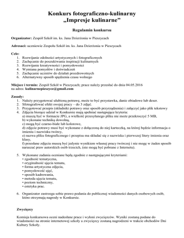 Konkurs fotograficzno-kulinarny „Impresje kulinarne” Regulamin konkursu Organizator: Zespół Szkół im. ks. Jana Dzierżonia w Pieszycach Adresaci: uczniowie Zespołu Szkół im. ks. Jana Dzierżonia w Pieszycach Cele: 1. 2. 3. 4. 5. 6. Rozwijanie zdolności artystycznych i fotograficznych Zachęcanie do poszukiwania inspiracji kulinarnych Rozwijanie kreatywności i pomysłowości Wymiana pomysłów i doświadczeń Zachęcanie uczniów do działań prozdrowotnych Alternatywny sposób spędzenia czasu wolnego Miejsce i termin: Zespół Szkół w Pieszycach; prace należy przesłać do dnia 04.05.2016 na adres: [email protected] Zasady: 1. Należy przygotować ulubioną potrawę, może to być przystawka, danie obiadowe lub deser. 2. Sfotografować efekt swojej pracy – do 3 zdjęć. 3. Przygotować przepis (składniki potrawy oraz sposób przyrządzenia) i załączyć jako plik tekstowy 4. Zdjęcia biorące udział w Konkursie mają spełniać następujące kryteria: a) muszą być w formacie JPG, a wielkość przesyłanego pliku nie może przekroczyć 5 MB, b) wykonane techniką dowolną, c) mogą być czarno-białe lub kolorowe, d) zdjęcie potrawy musi być wykonane z dołączoną do niej karteczką, na której będzie informacja o imieniu i nazwisku twórcy, e) nazwa pliku fotograficznego i przepisu ma składać się z nazwiska i pierwszej litery imienia oraz klasy, f) przesłane zdjęcia muszą być jedynie wynikiem własnej pracy twórczej i nie mogę w żaden sposób naruszać praw autorskich osób trzecich, (nie mogą być pobrane z Internetu). 5. Wykonane zadania oceniane będą zgodnie z następującymi kryteriami: • zgodność tematyczna, • oryginalność ujęcia tematu, • forma artystyczna zdjęcia, • pomysłowość ujęć, • sposób kadrowania, • metoda ujęcia tematu, • poziom techniczny, • estetyka prac. 6. Organizator zastrzega sobie prawo podania do publicznej wiadomości danych osobowych osób, które otrzymają nagrody w Konkursie. Zwycięzcy Komisja konkursowa oceni nadesłane prace i wyłoni zwycięzców. Wyniki zostaną podane do wiadomości na stronie internetowej szkoły a zwycięzcy zostaną nagrodzeni w trakcie obchodów Dni Kultury Szkoły.