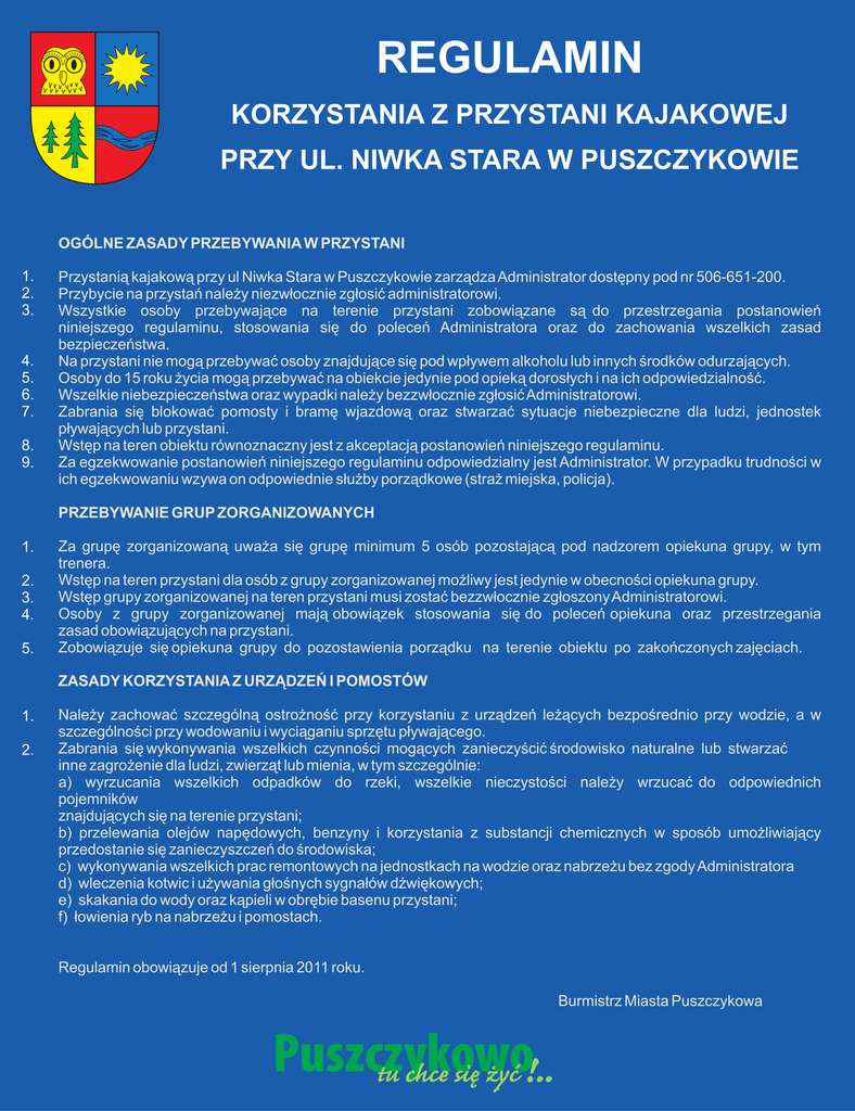 REGULAMIN KORZYSTANIA Z PRZYSTANI KAJAKOWEJ PRZY UL. NIWKA STARA W PUSZCZYKOWIE OGÓLNE ZASADY PRZEBYWANIA W PRZYSTANI 1. 2. 3. 4. 5. 6. 7. 8. 9. Przystanią kajakową przy ul Niwka Stara w Puszczykowie zarządza Administrator dostępny pod nr 506-651-200. Przybycie na przystań należy niezwłocznie zgłosić administratorowi. Wszystkie osoby przebywające na terenie przystani zobowiązane są do przestrzegania postanowień niniejszego regulaminu, stosowania się do poleceń Administratora oraz do zachowania wszelkich zasad bezpieczeństwa. Na przystani nie mogą przebywać osoby znajdujące się pod wpływem alkoholu lub innych środków odurzających. Osoby do 15 roku życia mogą przebywać na obiekcie jedynie pod opieką dorosłych i na ich odpowiedzialność. Wszelkie niebezpieczeństwa oraz wypadki należy bezzwłocznie zgłosić Administratorowi. Zabrania się blokować pomosty i bramę wjazdową oraz stwarzać sytuacje niebezpieczne dla ludzi, jednostek pływających lub przystani. Wstęp na teren obiektu równoznaczny jest z akceptacją postanowień niniejszego regulaminu. Za egzekwowanie postanowień niniejszego regulaminu odpowiedzialny jest Administrator. W przypadku trudności w ich egzekwowaniu wzywa on odpowiednie służby porządkowe (straż miejska, policja). PRZEBYWANIE GRUP ZORGANIZOWANYCH 1. 2. 3. 4. 5. Za grupę zorganizowaną uważa się grupę minimum 5 osób pozostającą pod nadzorem opiekuna grupy, w tym trenera. Wstęp na teren przystani dla osób z grupy zorganizowanej możliwy jest jedynie w obecności opiekuna grupy. Wstęp grupy zorganizowanej na teren przystani musi zostać bezzwłocznie zgłoszony Administratorowi. Osoby z grupy zorganizowanej mają obowiązek stosowania się do poleceń opiekuna oraz przestrzegania zasad obowiązujących na przystani. Zobowiązuje się opiekuna grupy do pozostawienia porządku na terenie obiektu po zakończonych zajęciach. ZASADY KORZYSTANIA Z URZĄDZEŃ I POMOSTÓW 1. 2. Należy zachować szczególną ostrożność przy korzystaniu z urządzeń leżących bezpośrednio przy wodzie, a w szczególności przy wodowaniu i wyciąganiu sprzętu pływającego. Zabrania się wykonywania wszelkich czynności mogących zanieczyścić środowisko naturalne lub stwarzać inne zagrożenie dla ludzi, zwierząt lub mienia, w tym szczególnie: a) wyrzucania wszelkich odpadków do rzeki, wszelkie nieczystości należy wrzucać do odpowiednich pojemników znajdujących się na terenie przystani; b) przelewania olejów napędowych, benzyny i korzystania z substancji chemicznych w sposób umożliwiający przedostanie się zanieczyszczeń do środowiska; c) wykonywania wszelkich prac remontowych na jednostkach na wodzie oraz nabrzeżu bez zgody Administratora d) wleczenia kotwic i używania głośnych sygnałów dźwiękowych; e) skakania do wody oraz kąpieli w obrębie basenu przystani; f) łowienia ryb na nabrzeżu i pomostach. Regulamin obowiązuje od 1 sierpnia 2011 roku. Burmistrz Miasta Puszczykowa