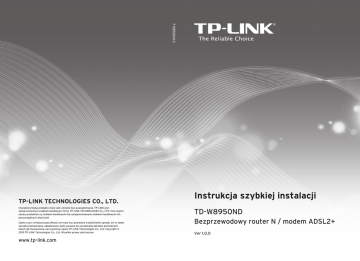 7106503413 TP-LINK TECHNOLOGIES CO., LTD. Charakterystyka produktu może ulec zmianie bez powiadomiania. TP-LINK jest zarejestrowanym znakiem handlowym firmy TP-LINK TECHNOLOGIES Co., LTD. Inne marki i nazwy produktów są znakami handlowymi lub zarejestrowanymi znakami handlowymi ich poszczególnych właścicieli. Żadna część niniejszej specyfikacji nie może być powielana w jakikolwiek sposób, ani w żaden sposób przetwarzana, adaptowana, bądź używana do uzyskiwania tekstów pochodnych, takich jak tłumaczenia, bez pisemnej zgody TP-LINK Technologies Co., Ltd. Copyright © 2010 TP-LINK Technologies Co., Ltd. Wszelkie prawa zastrzeżone. www.tp-link.com Instrukcja szybkiej instalacji TD-W8950ND Bezprzewodowy router N / modem ADSL2+ Ver 1.0.0 Instalacja Podłączenie urządzenia Uwaga W trakcie konfiguracji routera należy korzystać wyłącznie z przewodowego połączenia sieciowego. Wyłącz wszystkie urządzenia sieciowe (komputery, modem/router). Jeżeli aktualnie korzystasz z modemu, wyłącz go. Nowe urządzenie zastąpi modem. Podłącz komputer do portu LAN modemu/routera za pomocą kabla sieciowego. Za pomocą kabla telefonicznego podłącz rozdzielacz do gniazdka sieciowego. Następnie podłącz drugi kabel telefoniczny do portu LINE modemu/routera i do portu MODEM rozdzielacza. Do portu PHONE rozdzielacza podłącz telefon. Uwaga W przypadku, gdy telefon nie będzie wykorzystany, należy podłączyć modem/router bezpośrednio do gniazdka sieciowego. 1 Podłącz zasilacz znajdujący się w opakowaniu produktu do portu Power routera/modemu oraz do źródła zasilania. Włącz wszystkie urządzenia sieciowe a następnie sprawdź, czy status diod LED routera jest prawidłowy (patrz poniżej). Power: dioda zapalona ADSL: dioda miga lub jest zapalona WLAN: dioda miga LAN: dioda miga lub jest zapalona (w przypadku podłączenia danego portu) Uwaga Jeżeli diody LED mają nieprawidłowy status należy sprawdzić, czy wszystkie kable (zasilacza, kable telefoniczne i sieciowe) są prawidłowo podłączone do urządzenia. Przy prawidłowym podłączeniu linii telefonicznej, jeżeli dioda ADSL miga a następnie gaśnie, należy skontaktować się z dostawcą usług internetowych w celu sprawdzenia poprawności działania połączeń internetowych. Konfiguracja urządzenia Uwaga Do konfiguracji urządzenia można wykorzystać oprogramowanie na dostarczonej płycie CD (metoda pierwsza) lub uruchomić Kreator szybkiej konfiguracji (Quick Setup Wizard) w przeglądarce internetowej (metoda druga). TP-LINK zaleca wykorzystanie metody pierwszej. 2 Metoda 1: Konfiguracja z wykorzystaniem oprogramowania na płycie CD Włóż do napędu CD-ROM płytę CD znajdującą się w opakowaniu produktu. Automatycznie pojawi się okno kreatora instalacji Setup Wizard. Wybierz właściwy produkt i kliknij opcję Start Setup Zostanie wyświetlony film prezentujący sposób prawidłowego podłączenia urządzeń. Po jego zakończeniu uruchomiony zostanie program Easy Setup Assistant. Naciśnij przycisk START, a następnie wykonuj polecenia kreatora, aż do zakończenia procesu konfiguracji. Zakończono konfigurację urządzenia. Proszę przejść do punktu 3 Testowanie połączenia internetowego. 3 Metoda 2: Konfiguracja z wykorzystaniem kreatora szybkiej instalacji w przeglądarce internetowej Logowanie Otwórz przeglądarkę internetową, w pole adresowe wpisz: 192.168.1.1 i naciśnij klawisz Enter. W oknie dialogowym należy wprowadzić domyślną nazwę użytkownika oraz hasło i nacisnąć przycisk OK. Nazwa użytkownika: admin Hasło: admin Naciśnij przycisk OK Uwaga Jeżeli okno dialogowe nie pojawi się automatycznie, należy przejść do punktu T3 w części Rozwiązywanie problemów. Sposób postępowania w przypadku, gdy zapomniano hasła, opisuje punkt T2. Po zalogowaniu pojawi się strona zarządzania urządzeniem. Wybierz opcję Quick Setup 4 Konfiguracja ustawień internetowych Pojawi się następujące okno. Wprowadź parametry VPI i VCI nadane przez ISP Naciśnij przycisk Next Uwaga Jeżeli parametry VPI/VCI lub typ połączenia WAN nie są znane, należy skontaktować się z dostawcą usług internetowych. Wybierz typ połączenia WAN nadany przez ISP. W przypadku połączeń PPPoE/PPPoA, przejdź do punktu A. W przypadku połączeń MER przejdź do punktu B. W przypadku połączeń IPoA przejdź do punktu C. W przypadku połączeń Bridging przejdź do punktu Konfiguracja ustawień bezprzewodowych. Naciśnij przycisk Next Uwaga Jeżeli typ połączenia nie jest znany, należy skontaktować się z dostawcą usług internetowych. Uwaga Nie zaleca się korzystania z trybu Bridging, gdyż nie zapewnia on jednoczesnego dostępu do Internetu wielu stacjom roboczym. A. Konfiguracja dla opcji: PPPoE/PPPoA 5 Pojawi się następujące okno. Wprowadź nazwę użytkownika i hasło określone przez ISP Naciśnij przycisk Next Naciśnij przycisk Next Uwaga Jeżeli nazwa użytkownika i hasło nie są znane, należy skontaktować się z dostawcą usług internetowych. Uwaga Konfiguracja ustawień PPPoA jest podobna do PPPoE. Po ukończeniu powyższej konfiguracji należy przejść do punktu ustawień bezprzewodowych. B. Konfiguracja dla opcji: MER Wprowadź parametry określone przez ISP Naciśnij przycisk Next 6 Konfiguracja Naciśnij przycisk Next Po ukończeniu powyższej konfiguracji należy przejść do punktu ustawień bezprzewodowych. C. Konfiguracja Konfiguracja dla opcji: IPoA Wprowadź adres IP, maskę podsieci, bramę domyślną oraz adresy serwera DNS określone przez ISP Naciśnij przycisk Next Naciśnij przycisk Next Uwaga Jeżeli adres IP, maska podsieci i adresy DNS nie są znane, należy skontaktować się z dostawcą usług internetowych. Po ukończeniu powyższej konfiguracji należy przejść do punktu ustawień bezprzewodowych. 7 Konfiguracja D. Konfiguracja dla opcji: Bridge Naciśnij przycisk Next Po ukończeniu powyższej konfiguracji należy przejść do punktu ustawień 